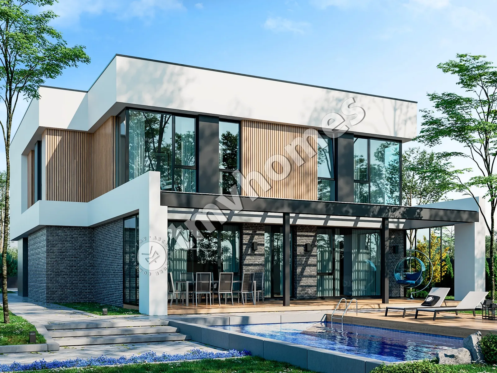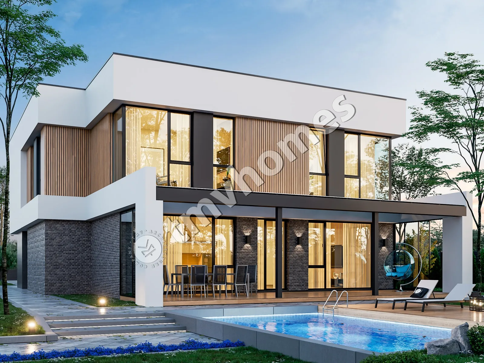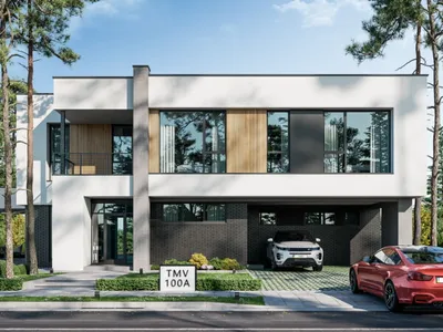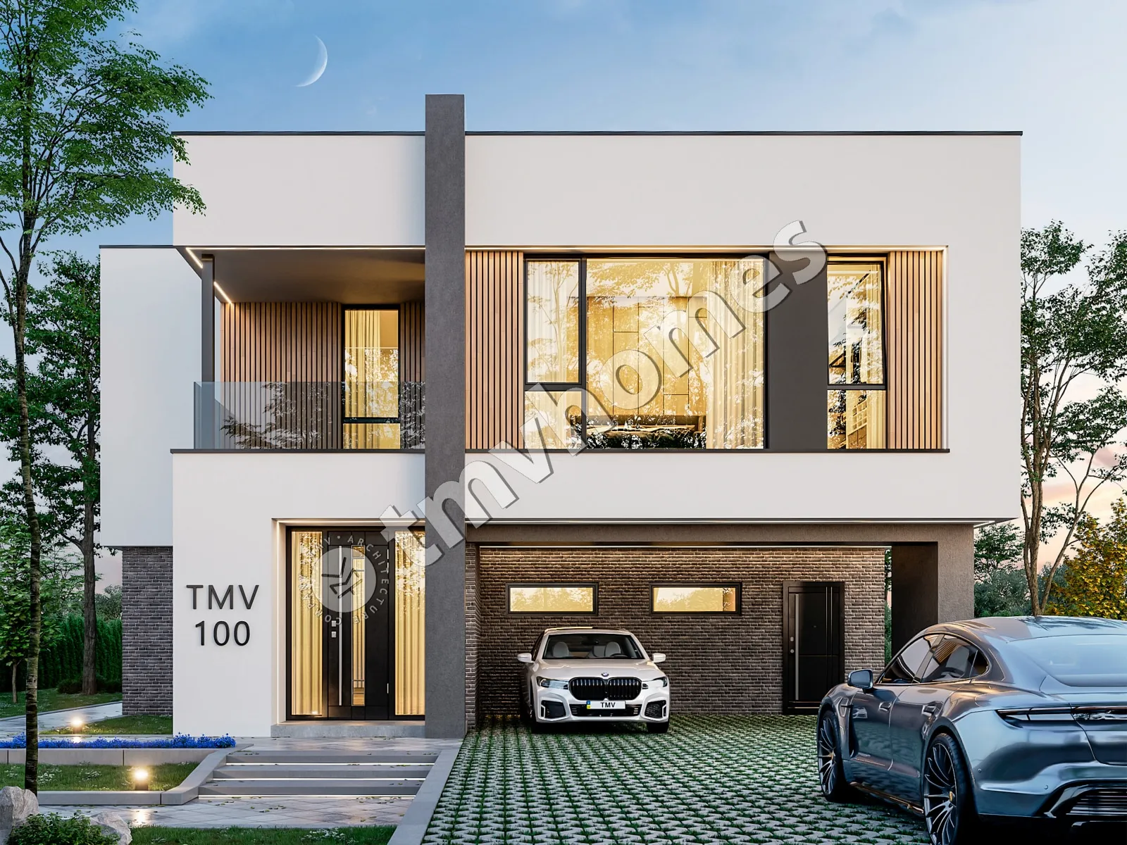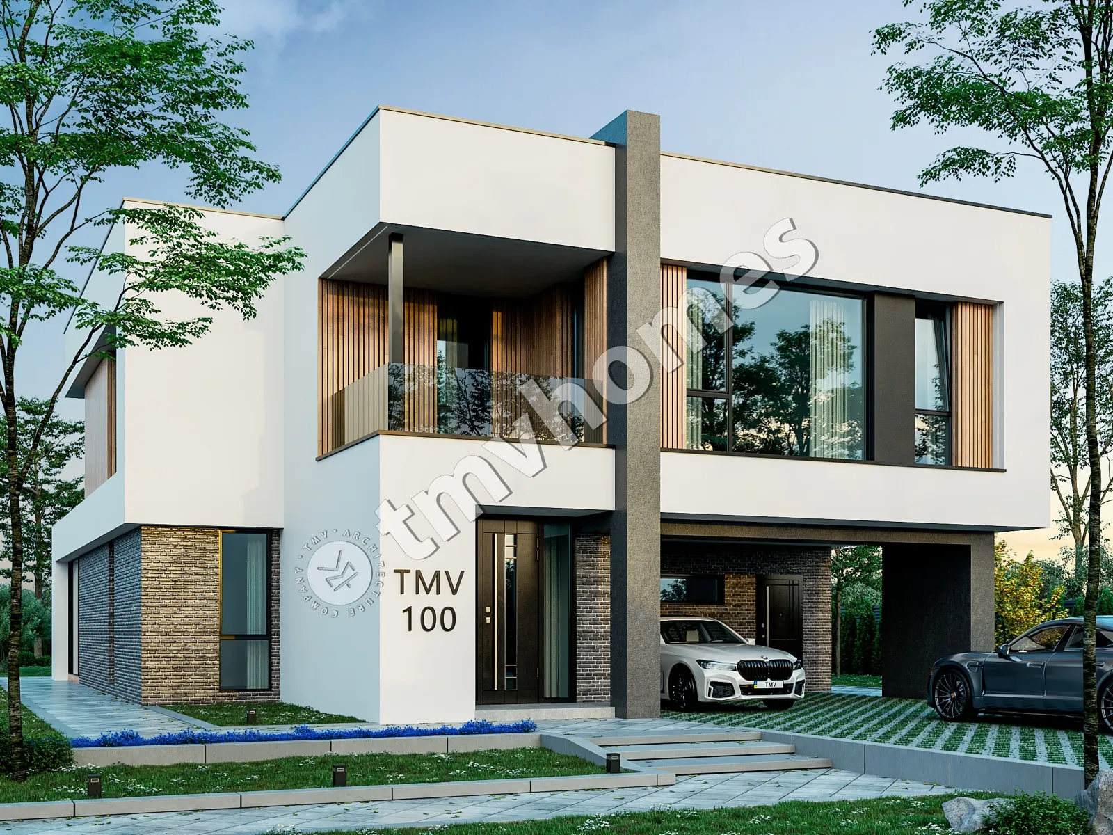 Проект TMV 100 - современный двухэтажный дом в стиле хай-тек с плоской крышей, террасой, балконом и навесом для 2 автомобилей. Состав помещений: прихожая, гостиная, кухня-столовая, кабинет, 3 спальни, 3 санузла, постирочная, гардеробная, кладовая, котельная.