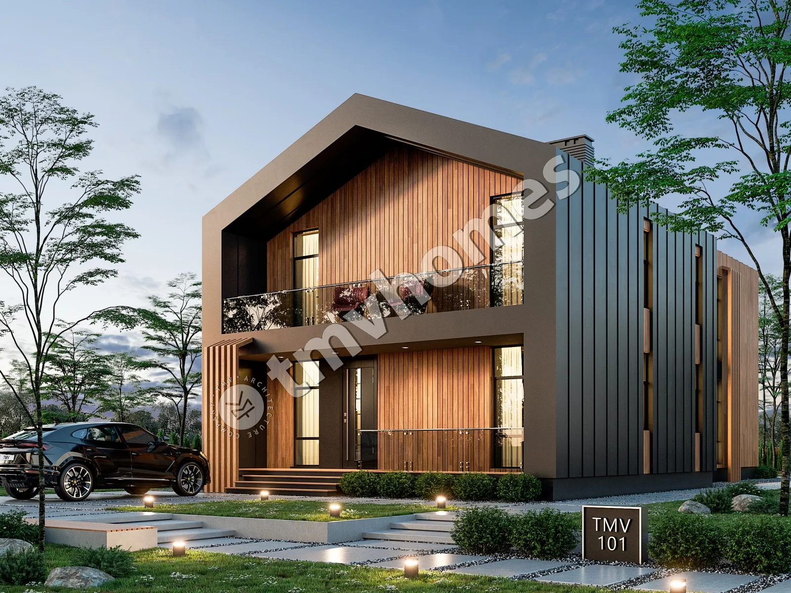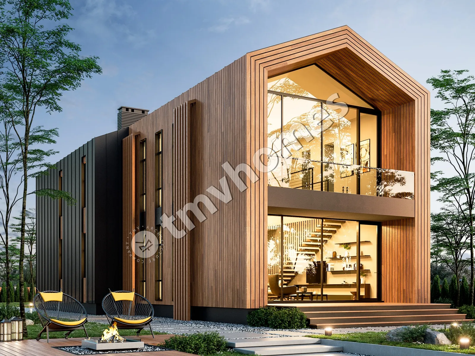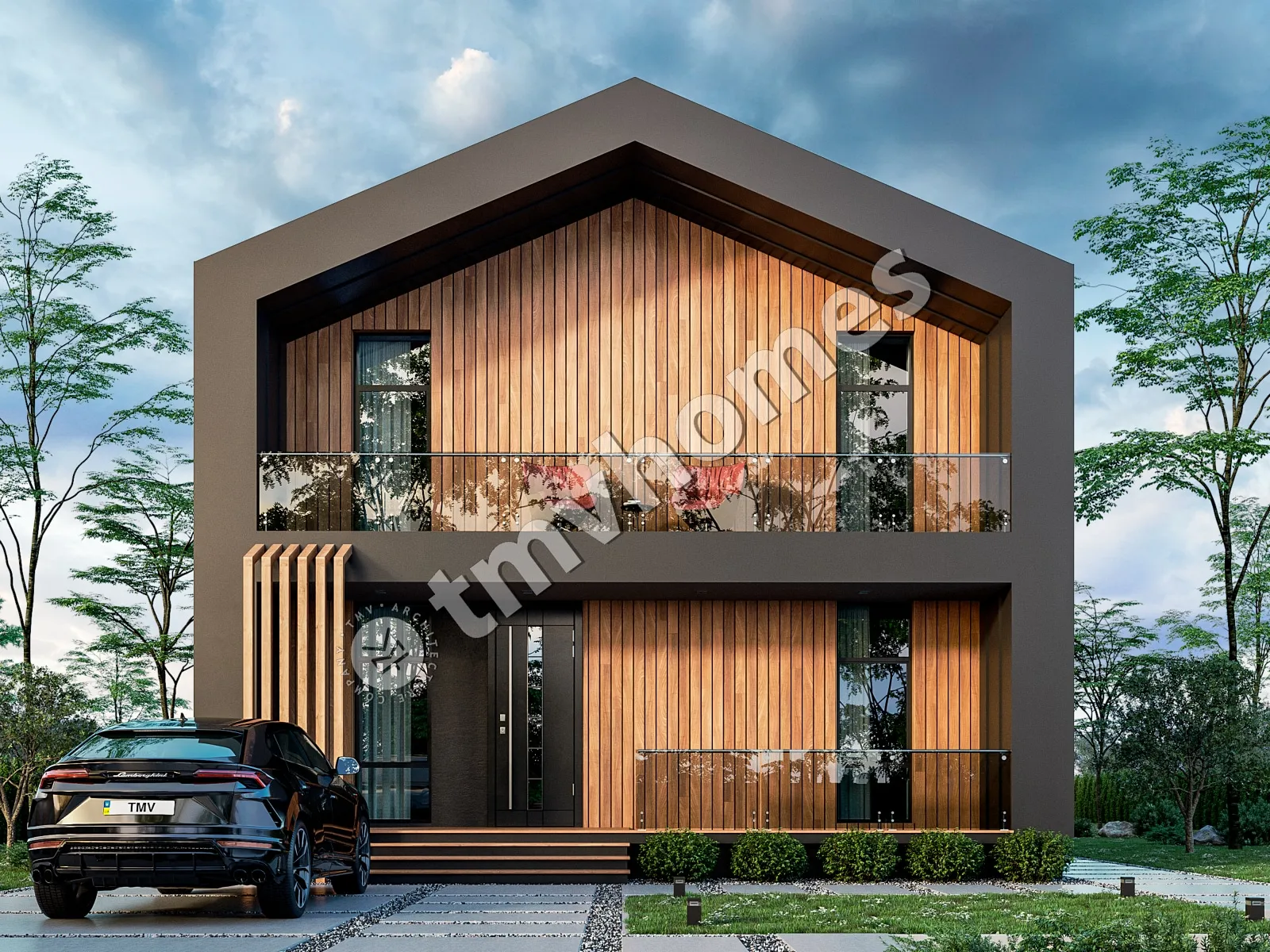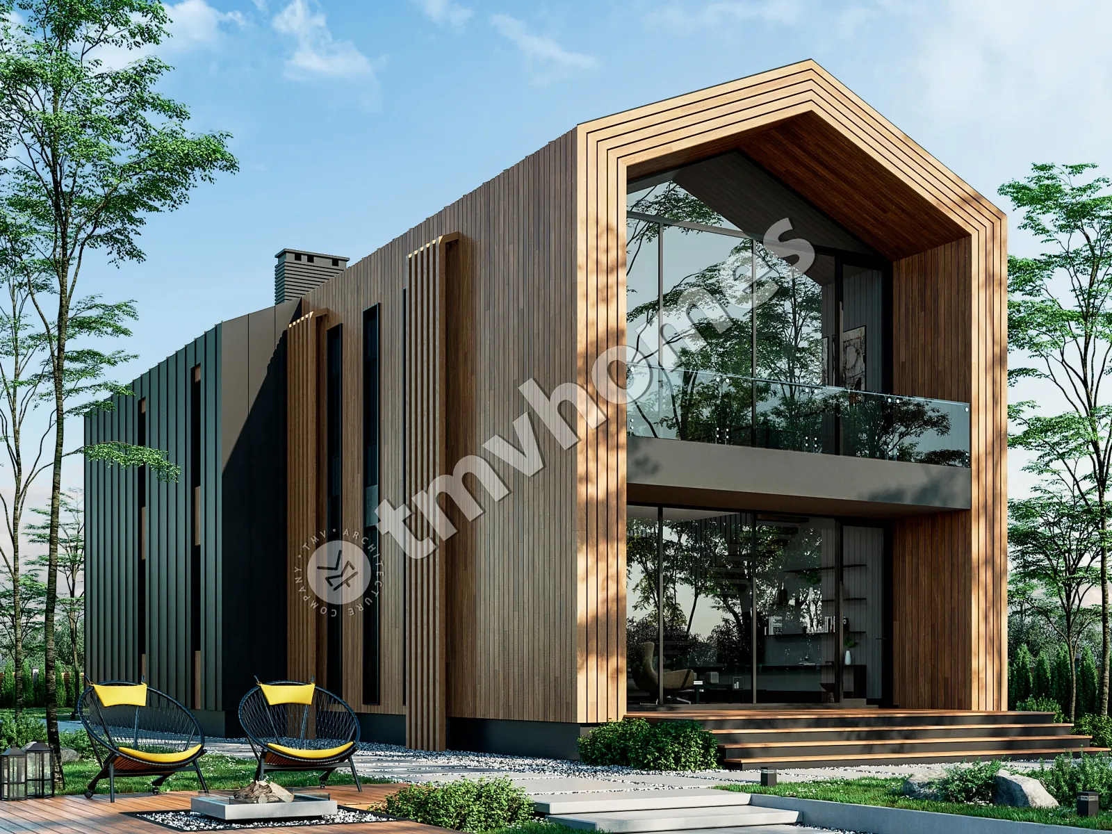 Проект TMV 101 - современный двухэтажный дом в стиле барнхаус со вторым светом, балконом и террасой. Состав помещений: прихожая, кухня-столовая, гостиная, кабинет, 2 спальни, 2 санузла, гардеробная, котельная.