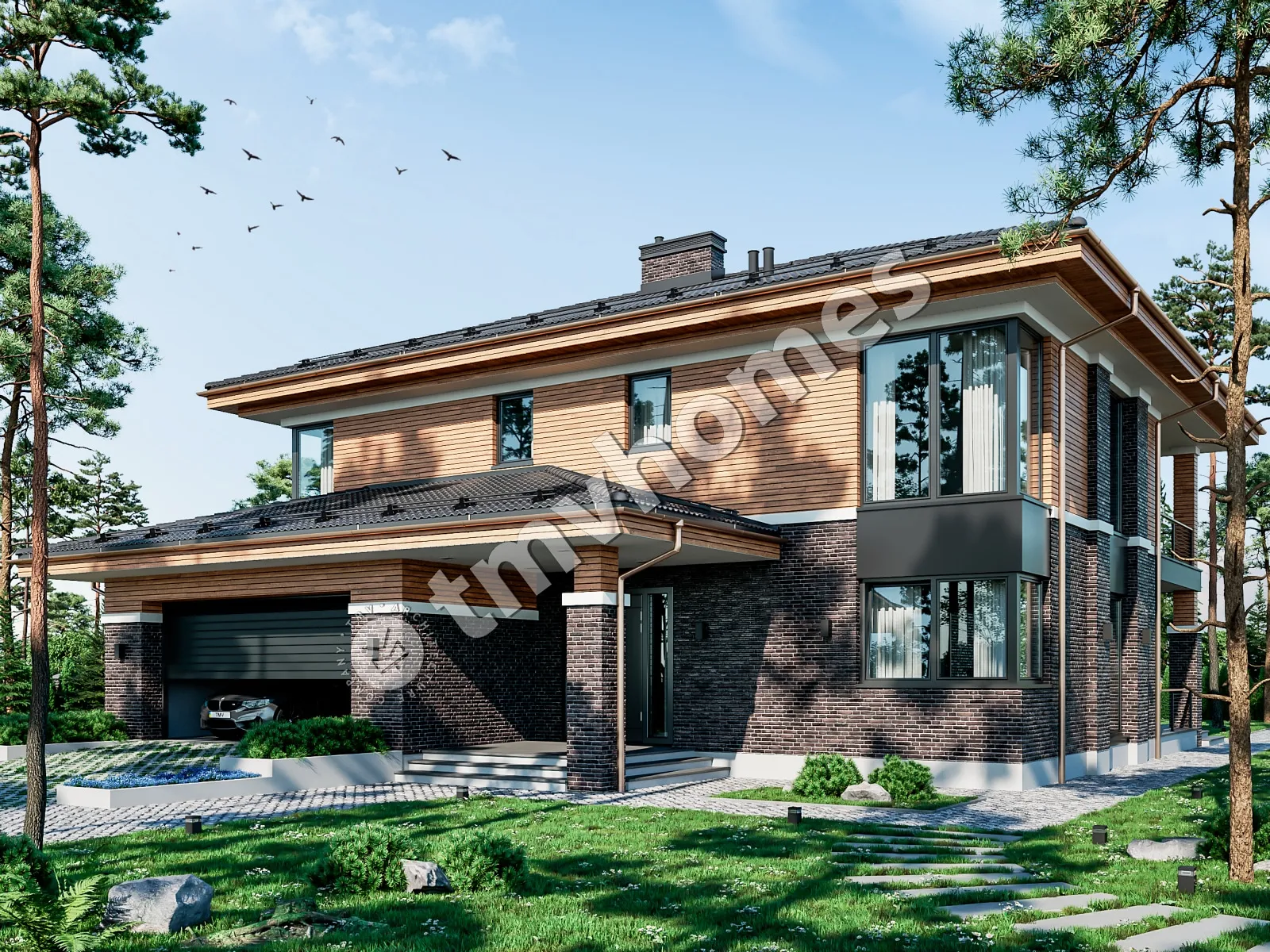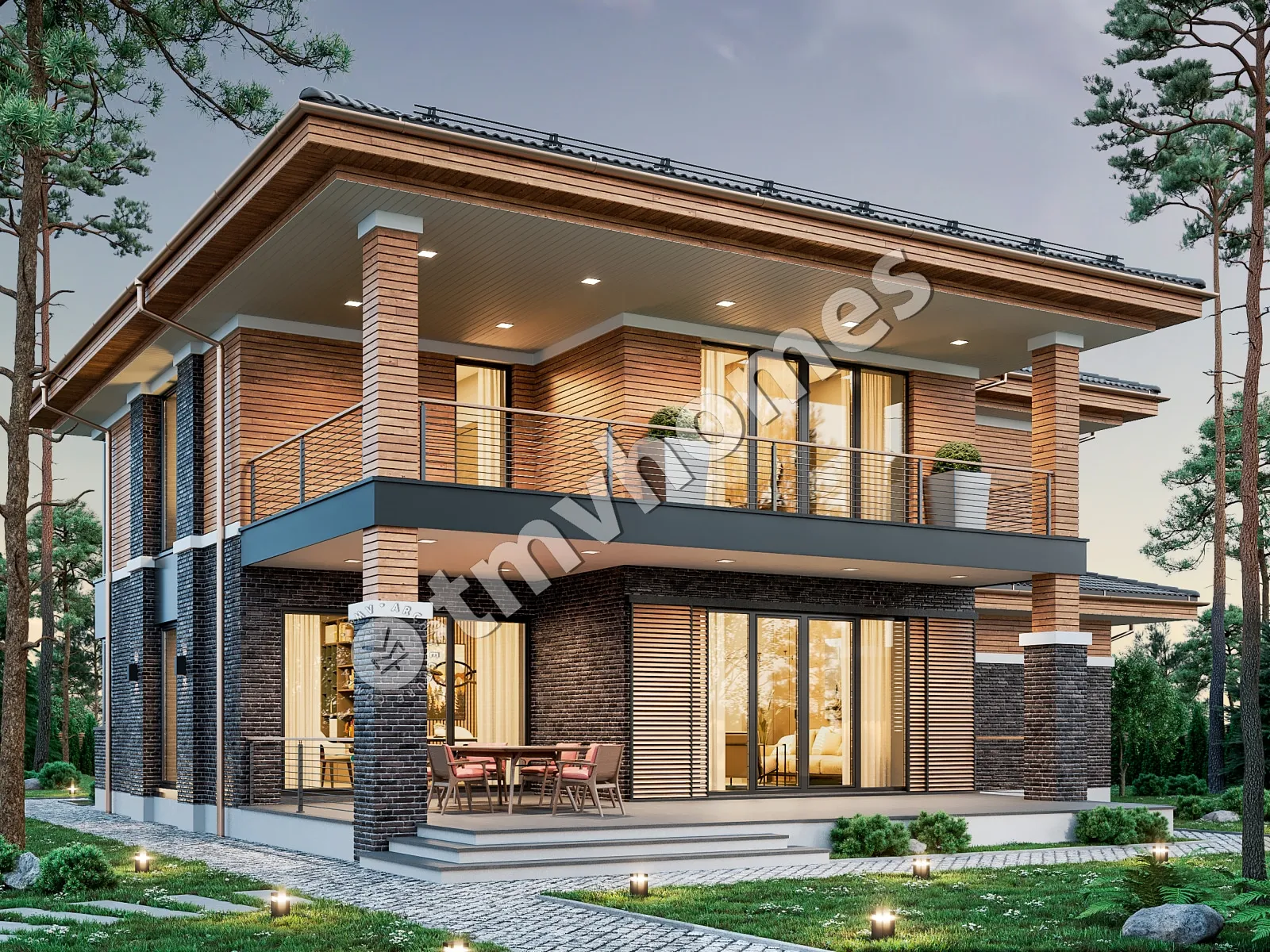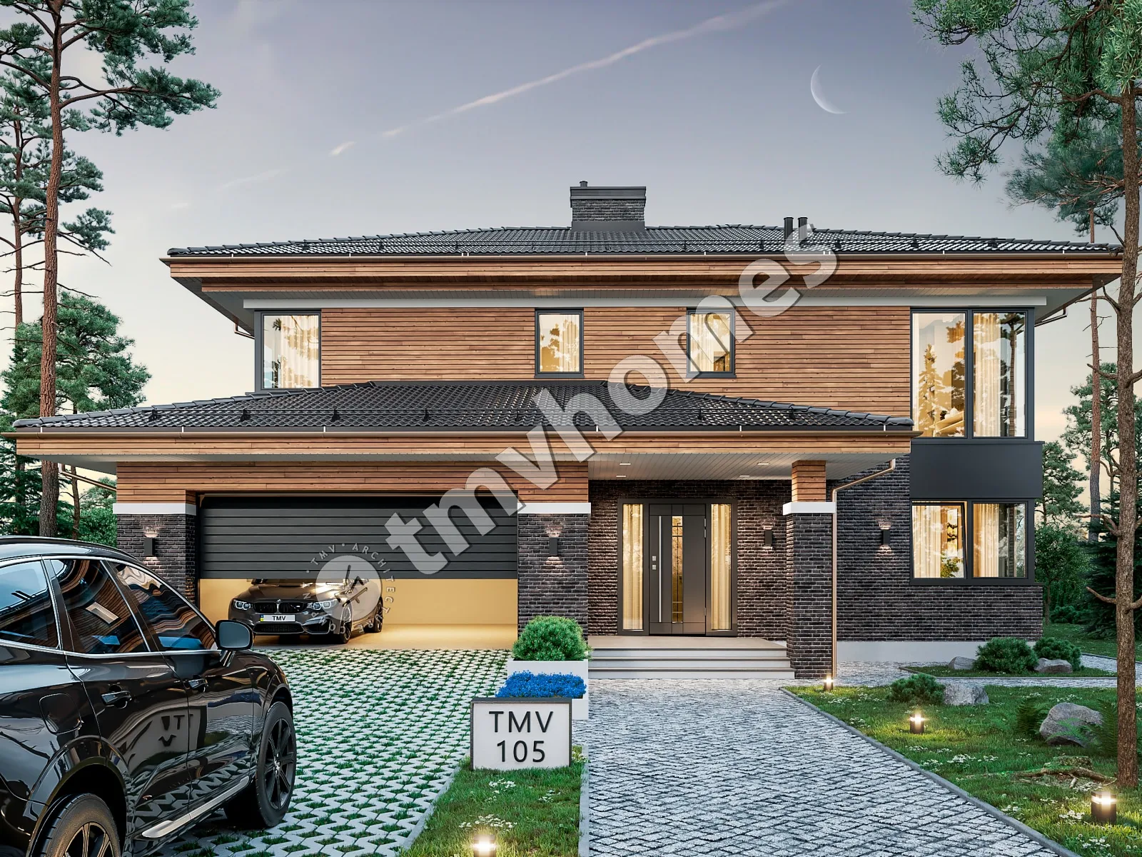 Проект TMV 105 - комфортный двухэтажный дом в стиле Райта с террасами и гаражом для 2 автомобилей. Состав помещений: прихожая, гостиная, кухня-столовая, кабинет, 4 спальни, 3 санузла, постирочная, гардеробная, кладовая, котельная.
