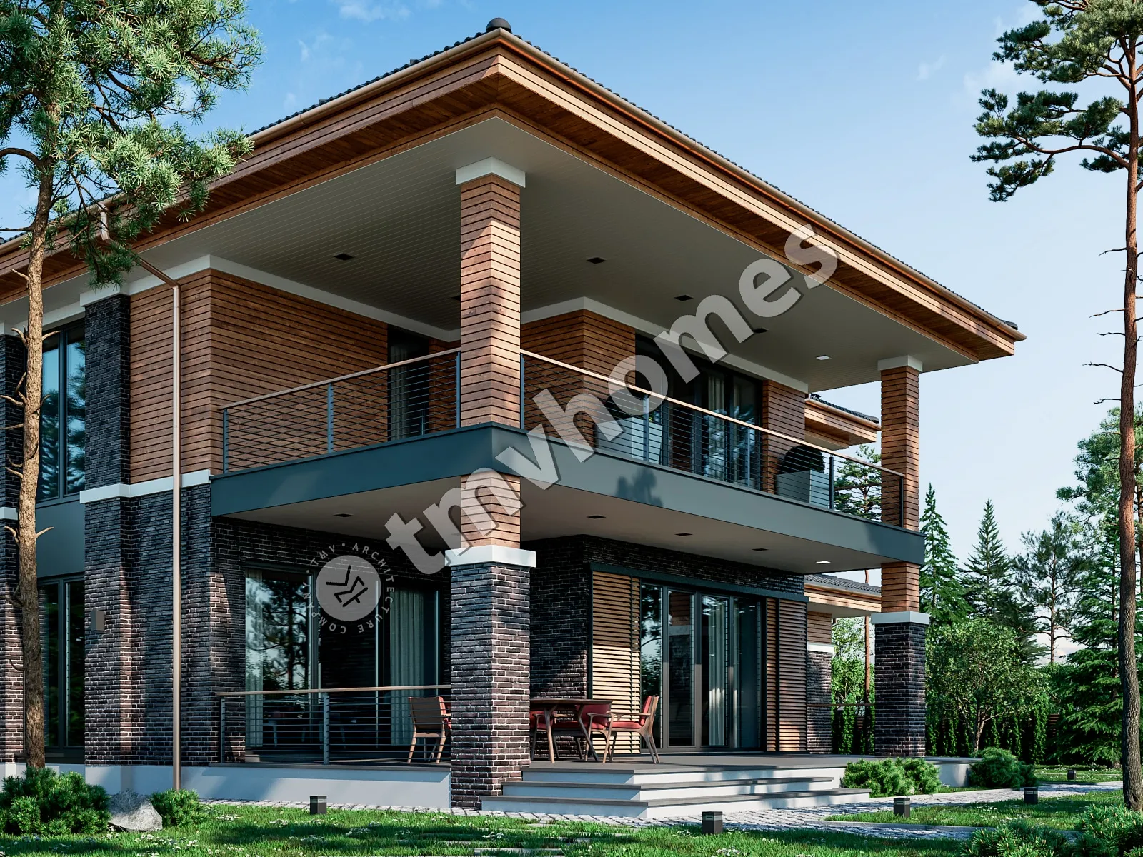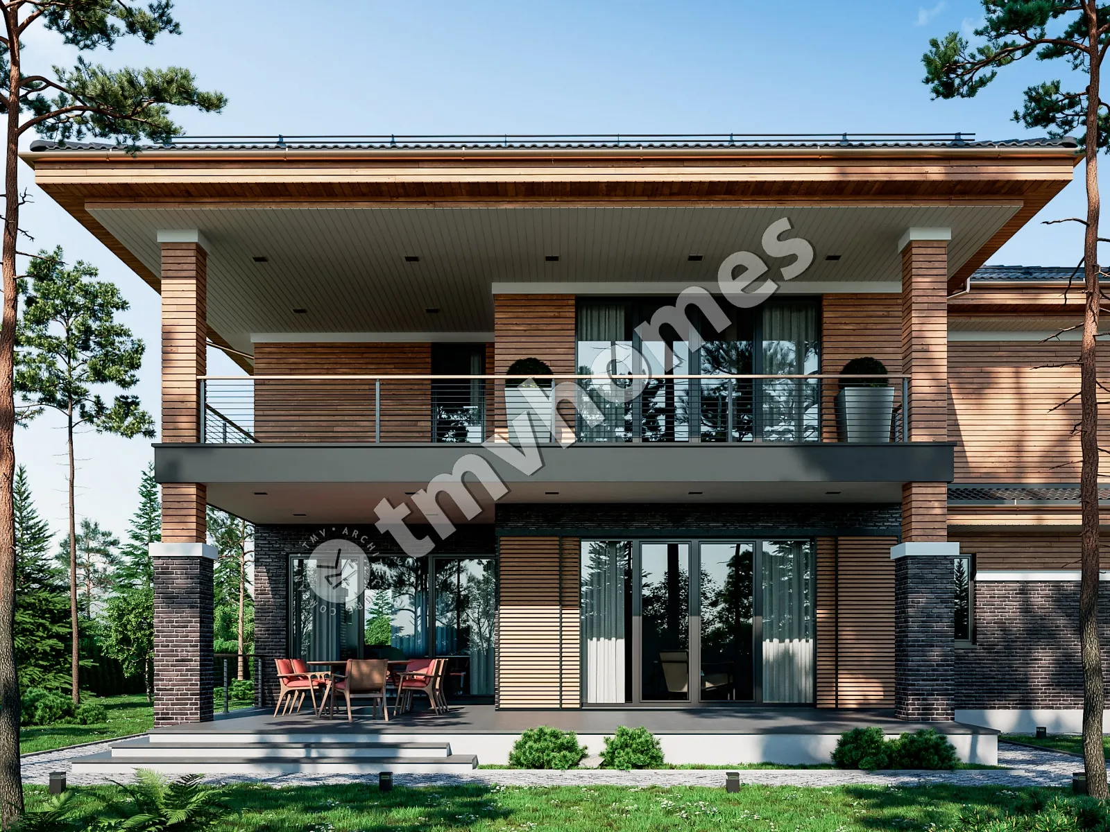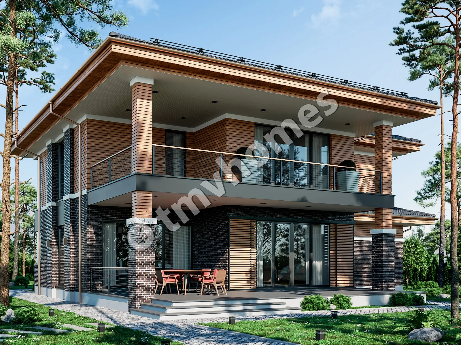 Проект TMV 105 - комфортный двухэтажный дом в стиле Райта с террасами и гаражом для 2 автомобилей. Состав помещений: прихожая, гостиная, кухня-столовая, кабинет, 4 спальни, 3 санузла, постирочная, гардеробная, кладовая, котельная.