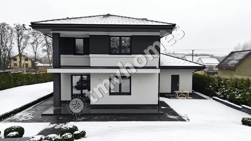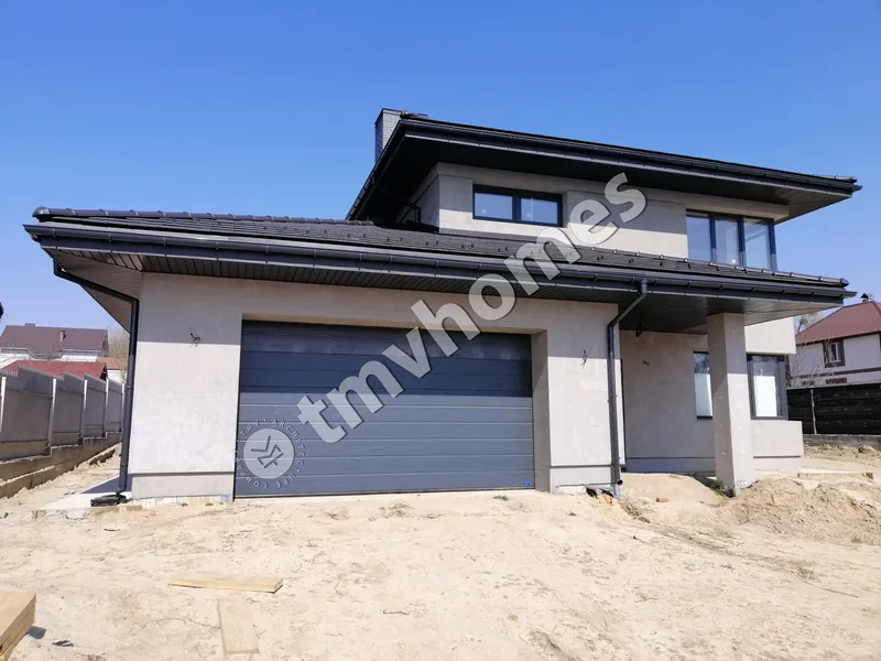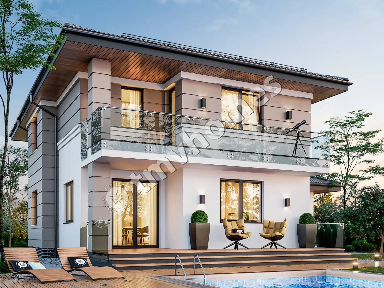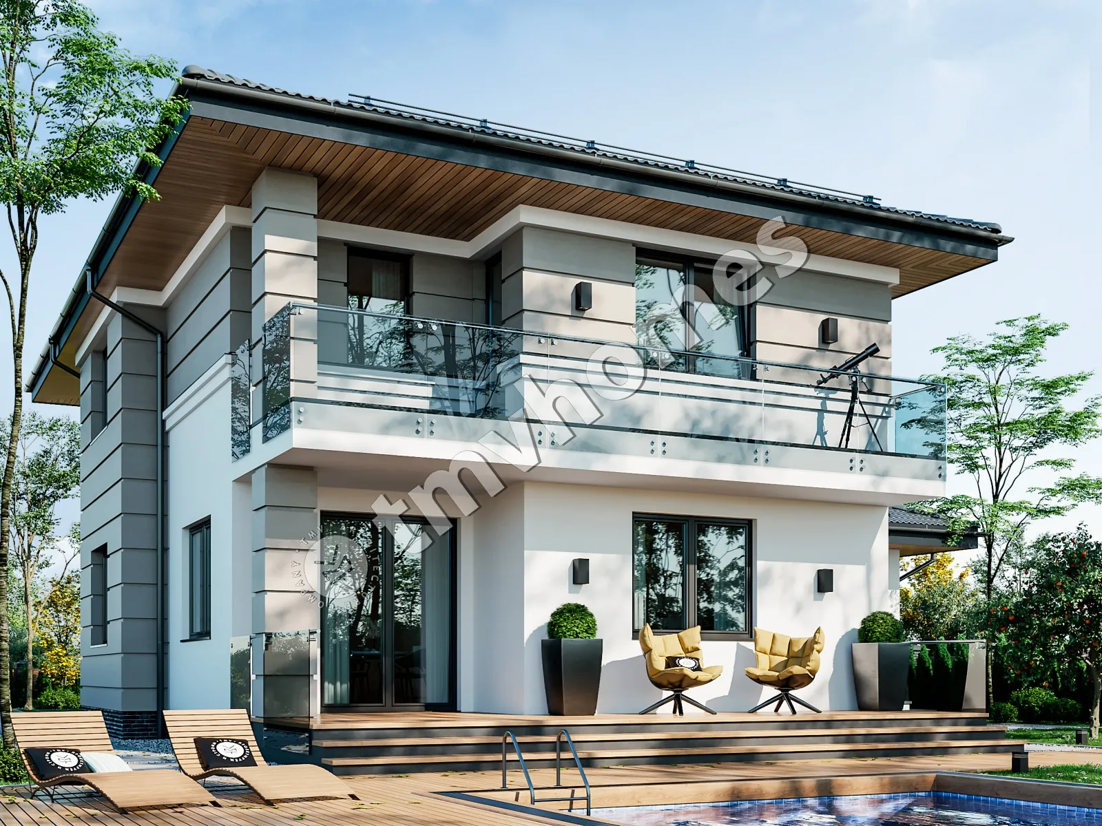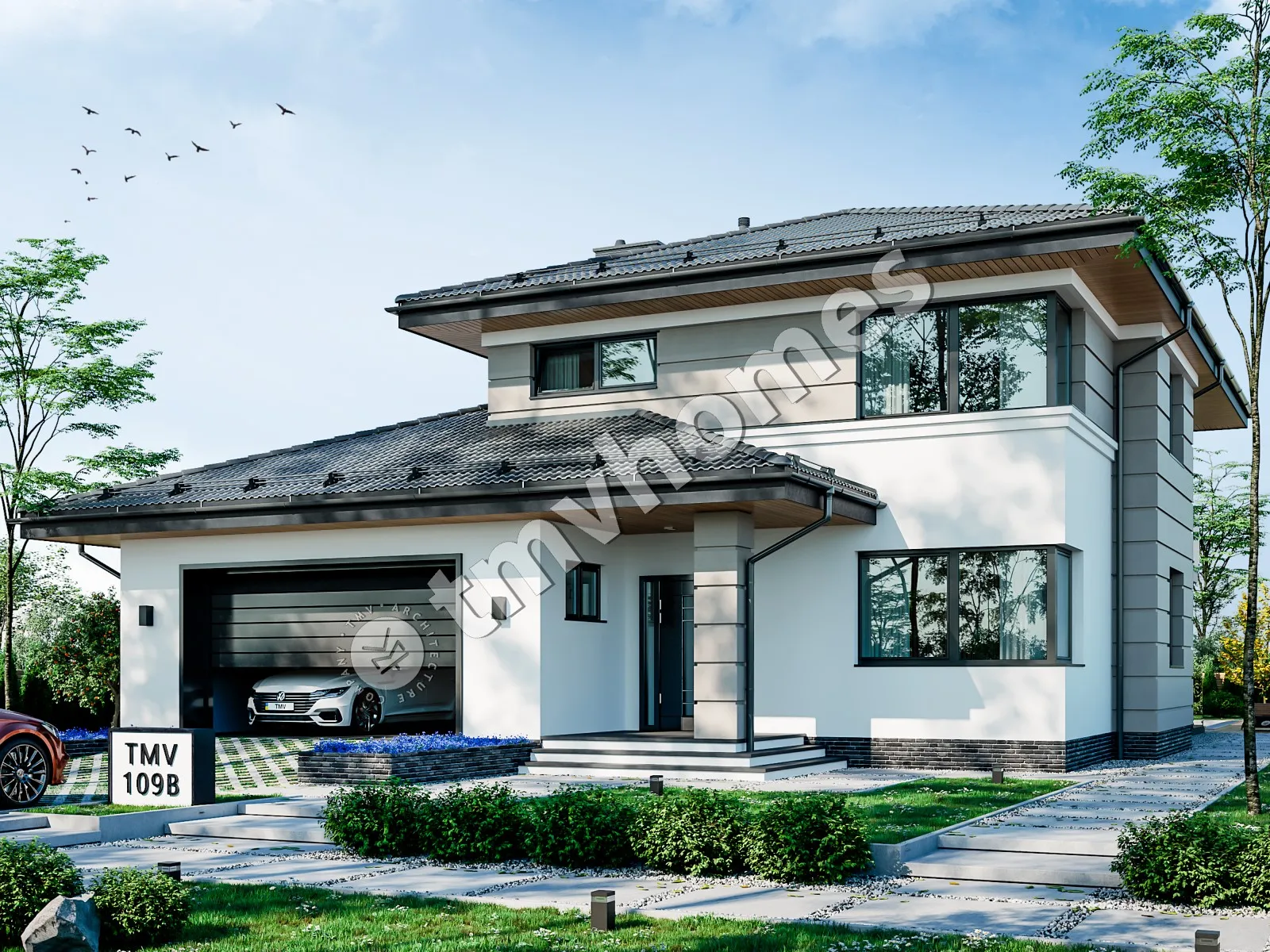 Проект TMV 109B - современный двухэтажный дом с террасой, балконом и гаражом для 2 автомобилей. Состав помещений: прихожая, гостиная, кухня-столовая, 4 спальни, 3 санузла, гардеробная, котельная.