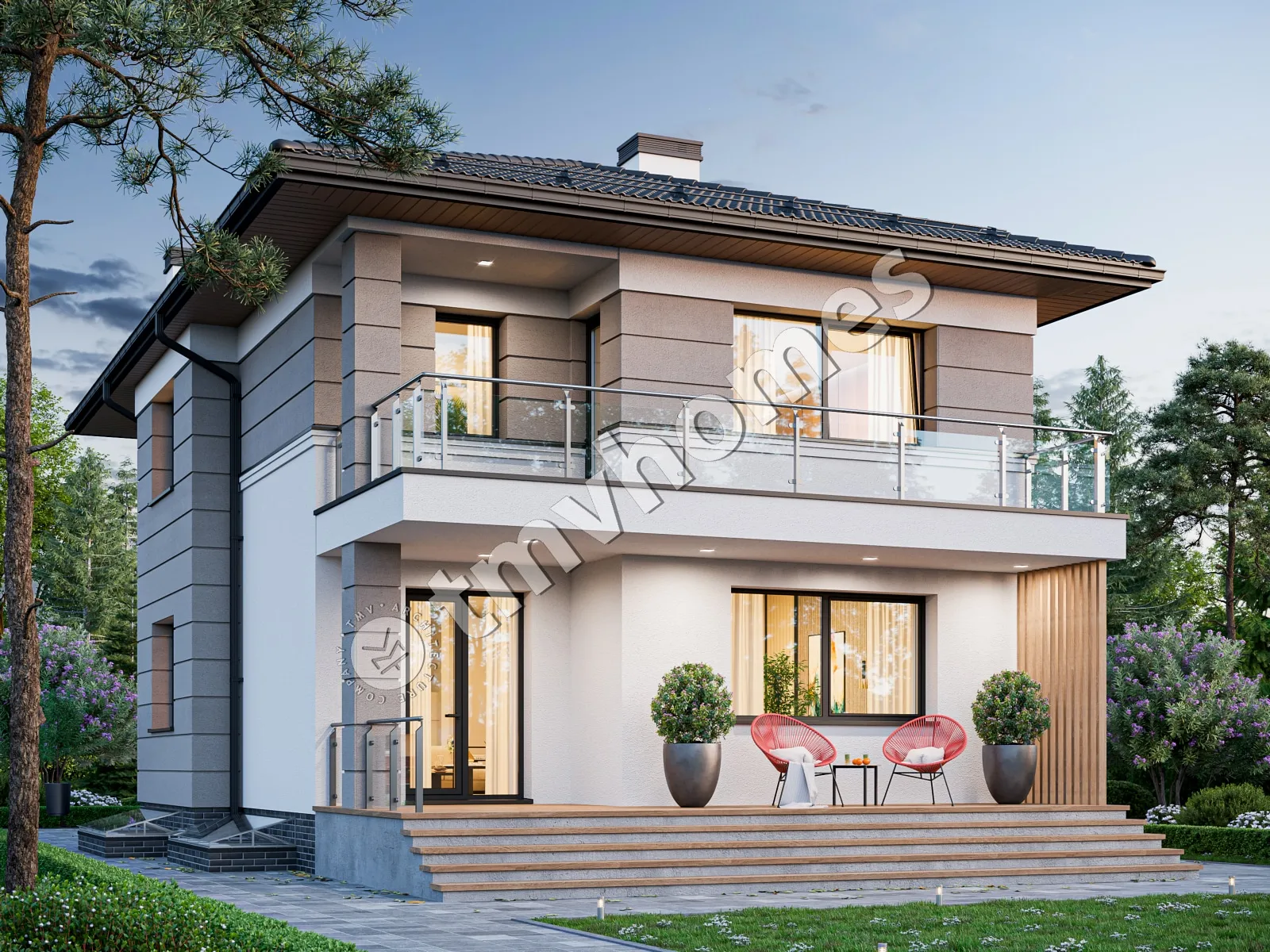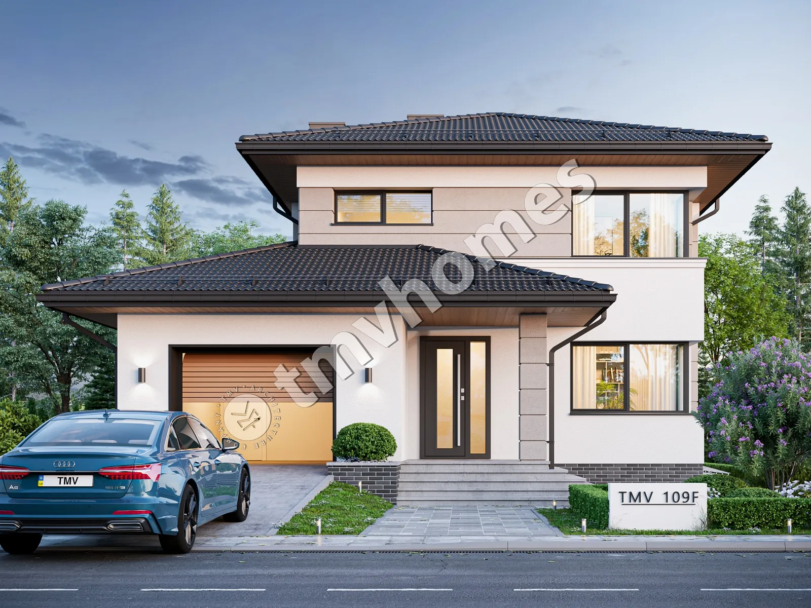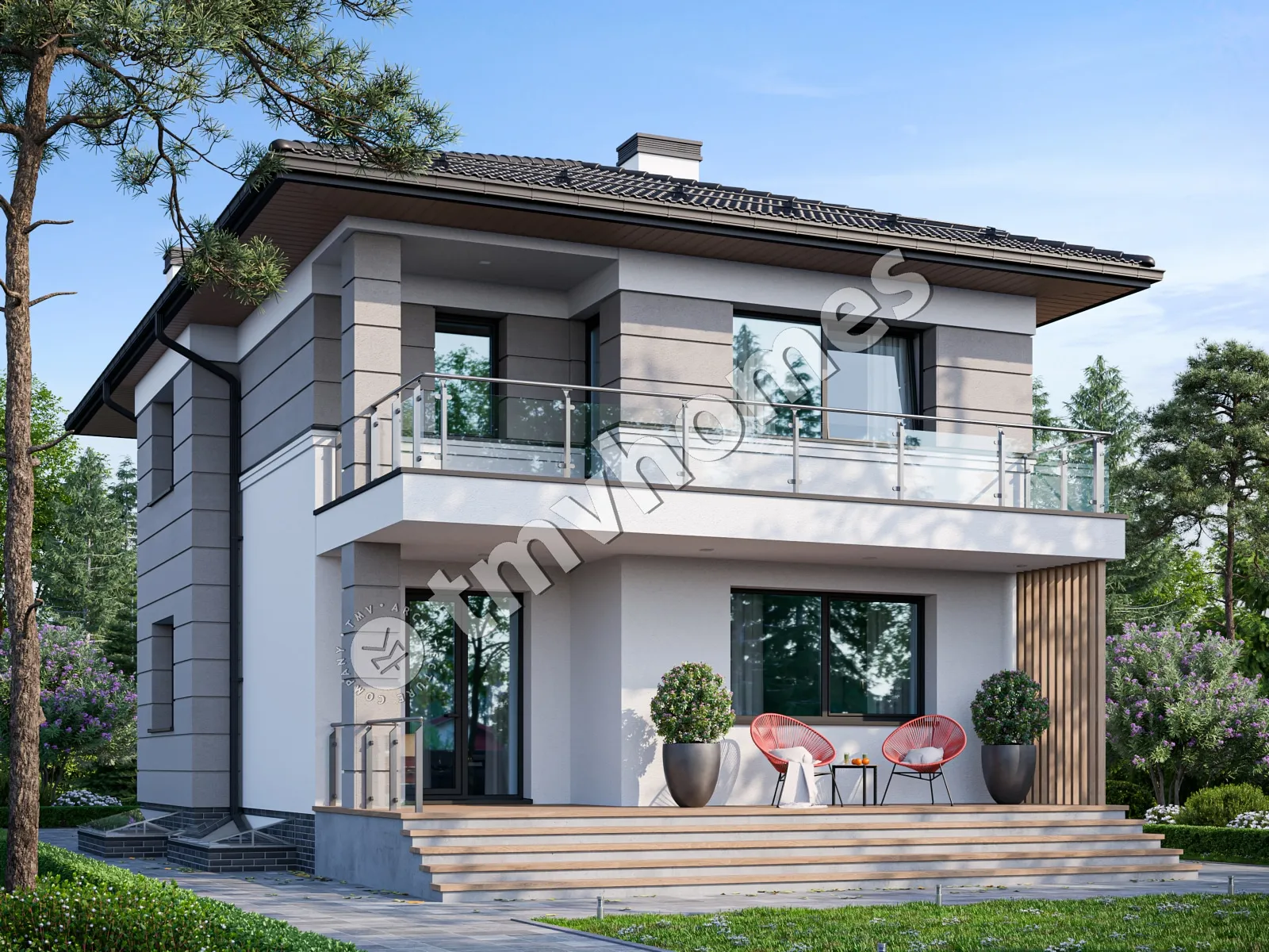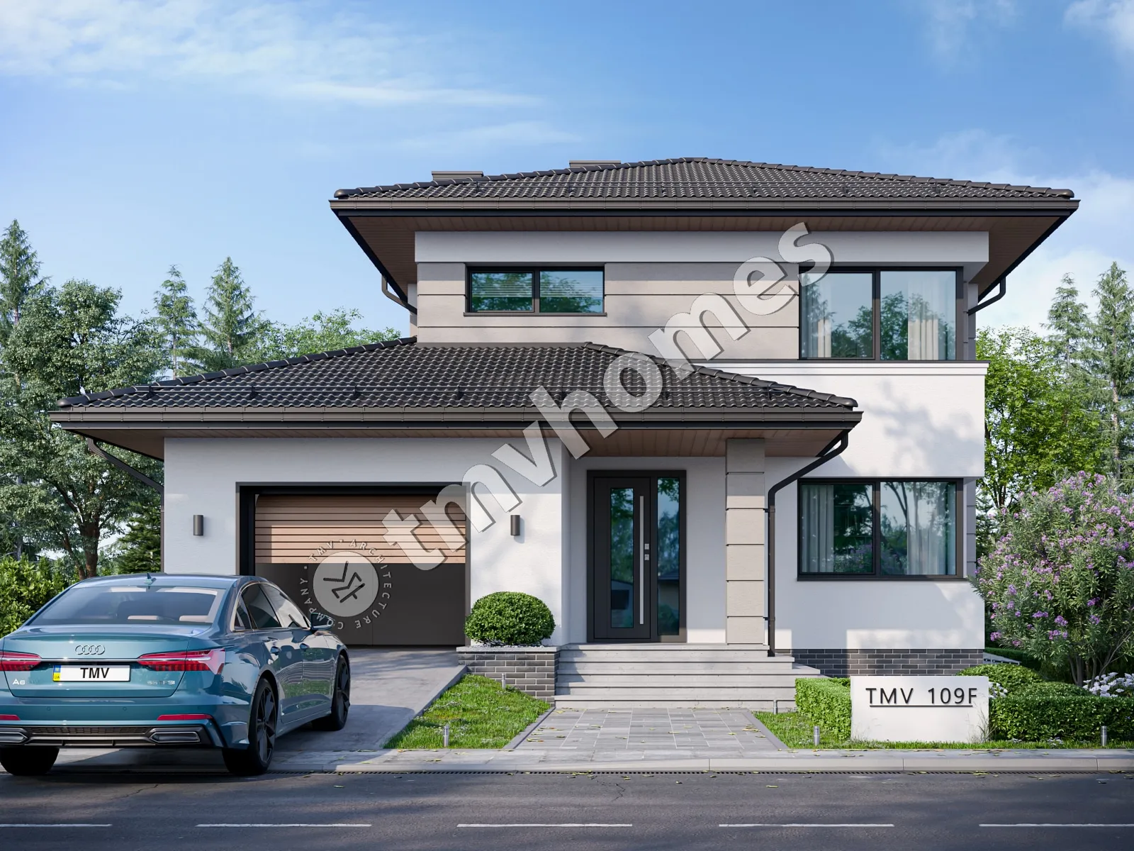 Проект TMV 109F - двухэтажный дом с цокольным этажом, террасой, балконом и гаражом для 1 автомобиля. Состав помещений: хозяйственные помещения, прихожая, холл, гостиная, кухня-столовая, 4 спальни, 3 санузла, гардеробная, кладовая, котельная.