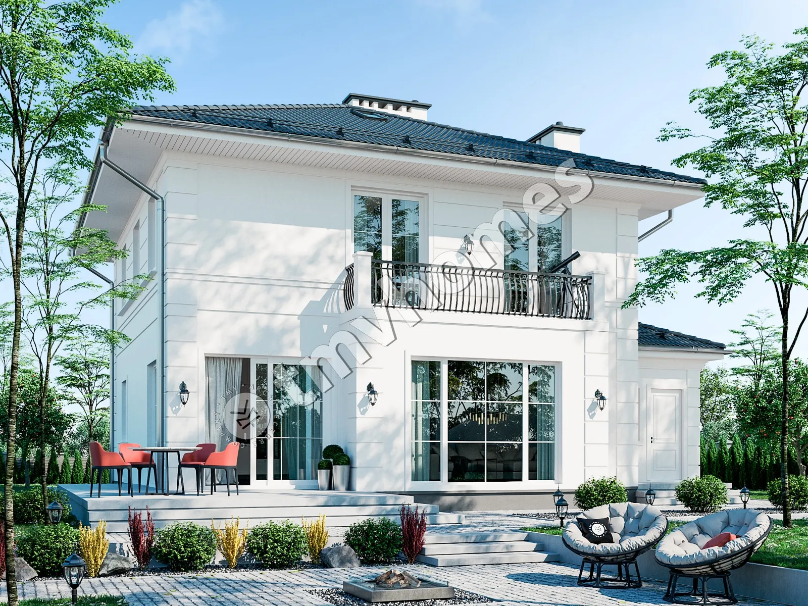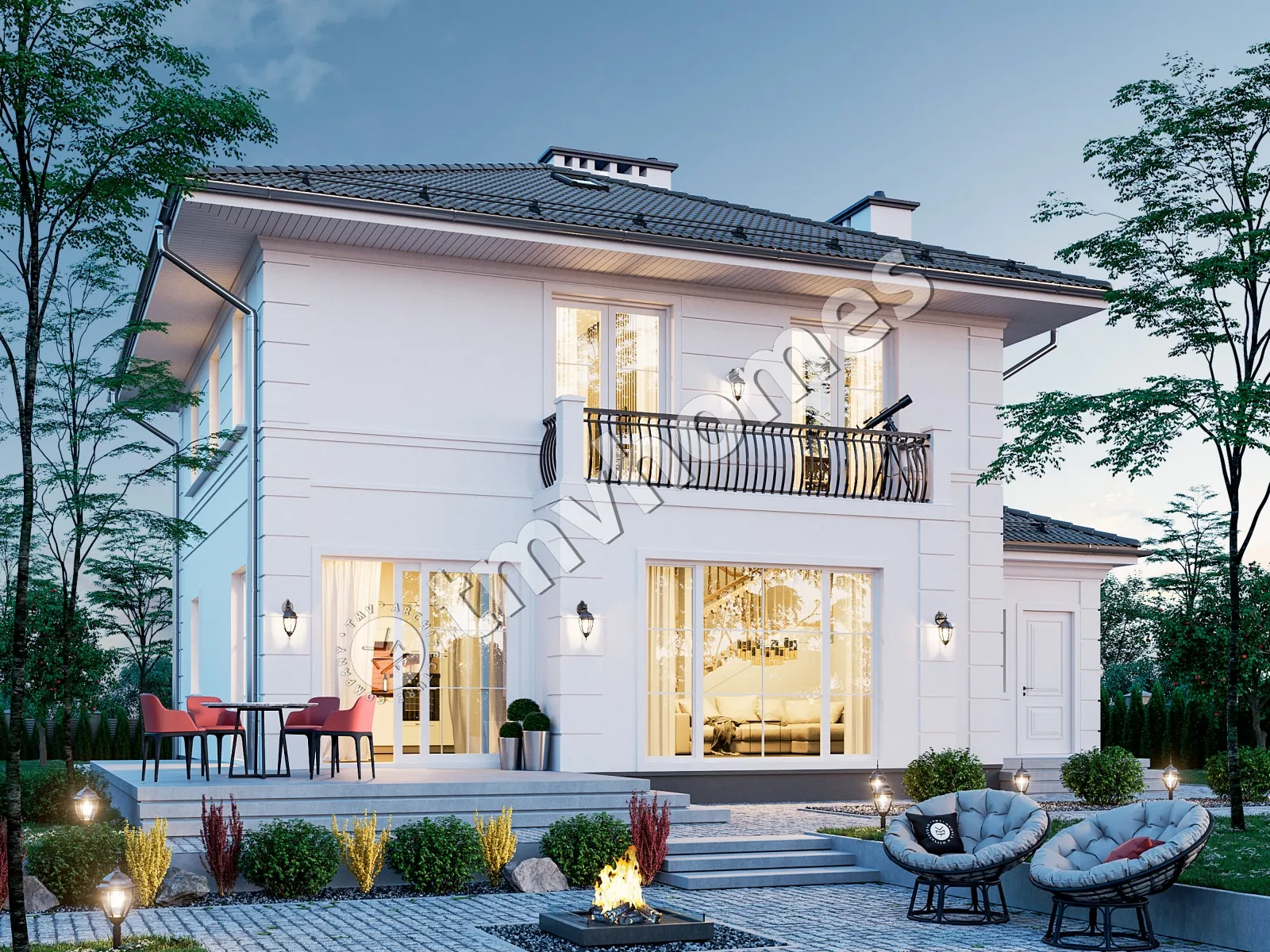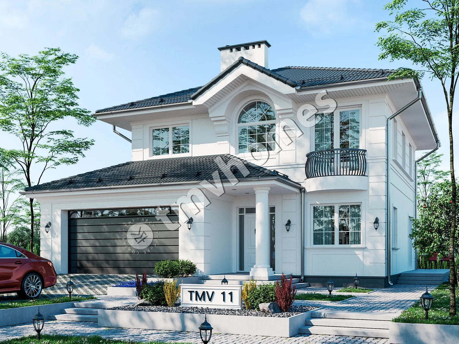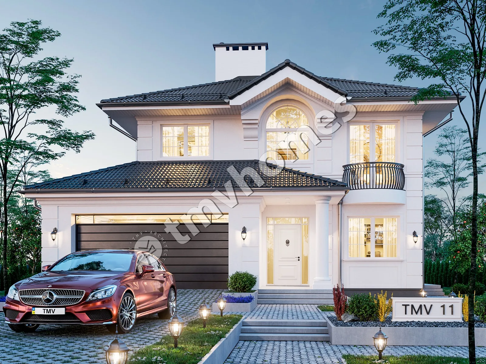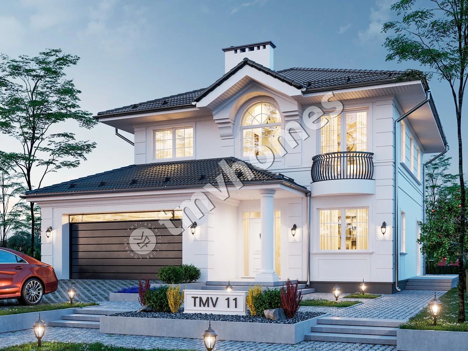 Проект TMV 11 - классический двухэтажный особняк с террасой и гаражом для 2 автомобилей. Состав помещений: прихожая, кухня-столовая, гостиная, кабинет, 3 спальни, 3 санузла, гардеробная, котельная.