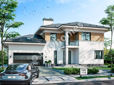 Проект TMV 110 - современный двухэтажный дом с террасой, балконом и гаражом для 2 автомобилей. Состав помещений: прихожая, холл, кухня-столовая, гостиная, кабинет, 3 спальни, 3 санузла, комната отдыха, гардеробная, кладовая, котельная.