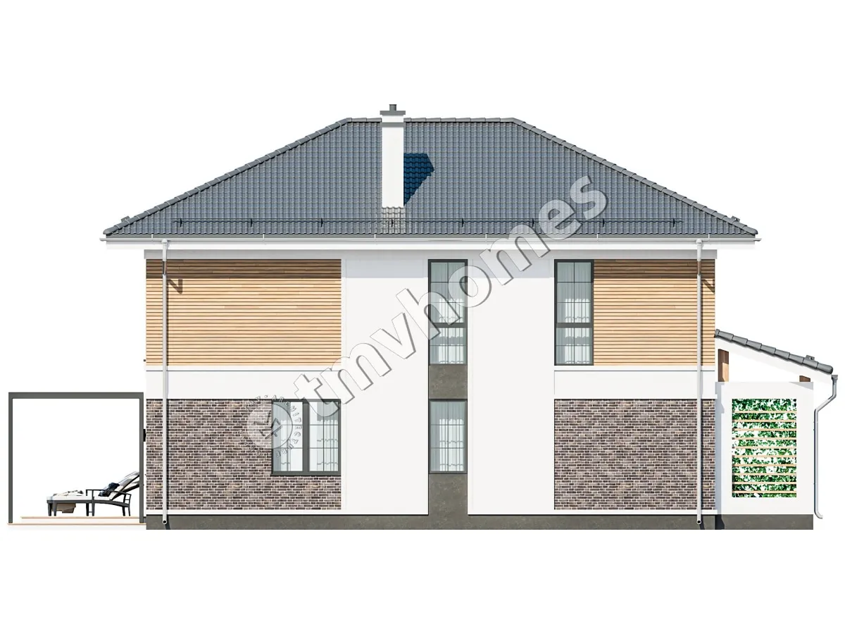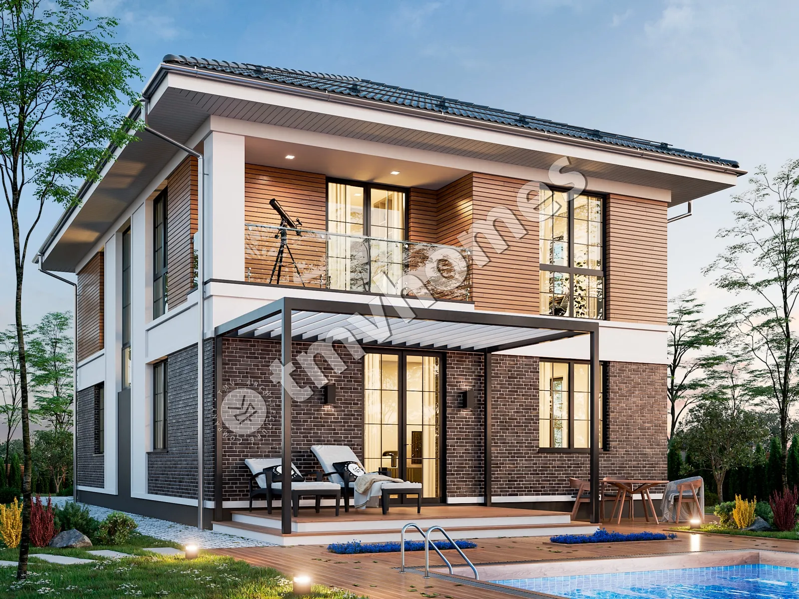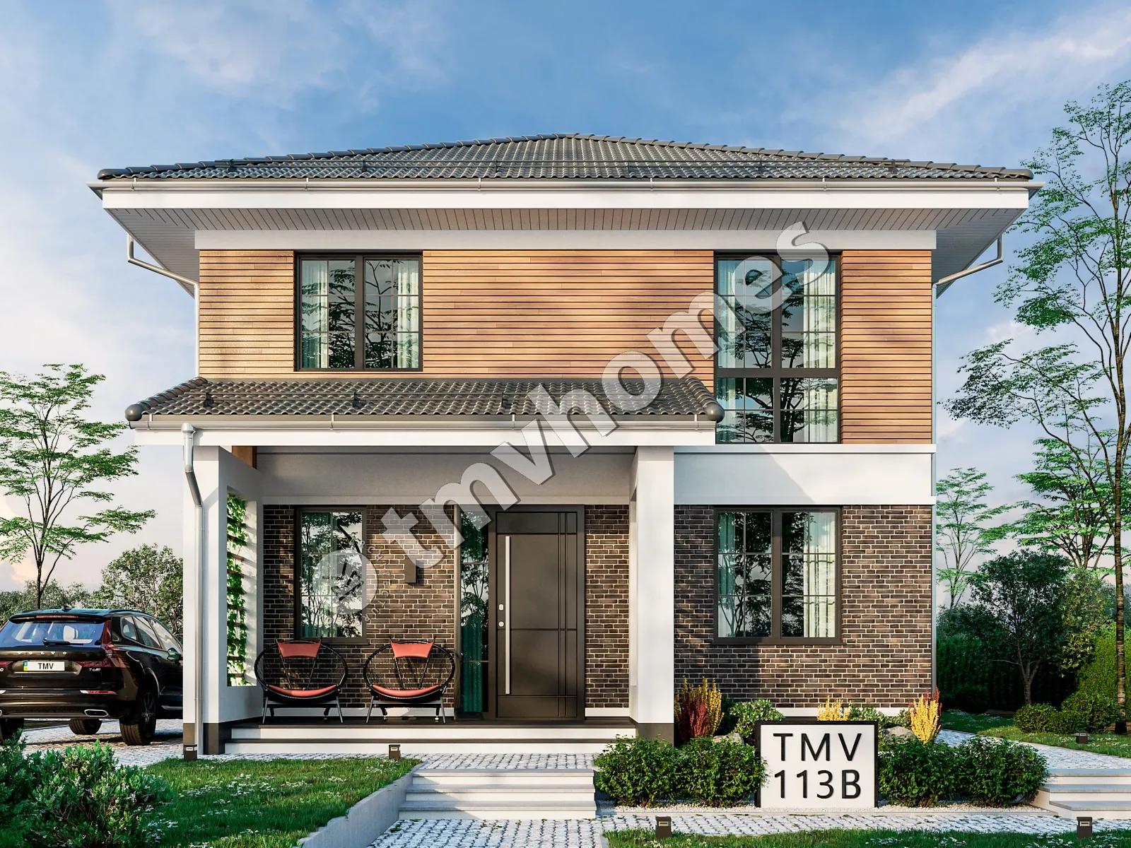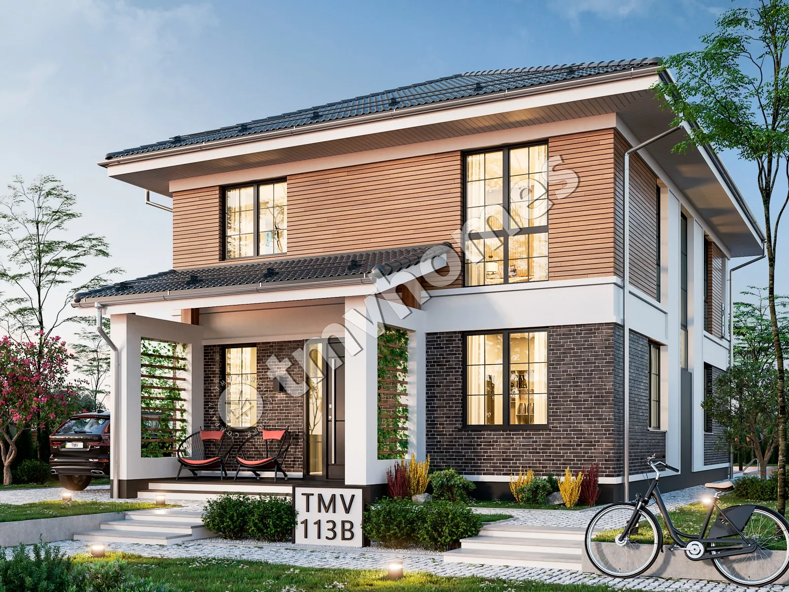 Проект TMV 113B - двухэтажный дом без гаража c террасой и балконом. Состав помещений: прихожая, гостиная, кухня-столовая, кабинет, 4 спальни, 2 санузла, гардеробная, кладовая, котельная.