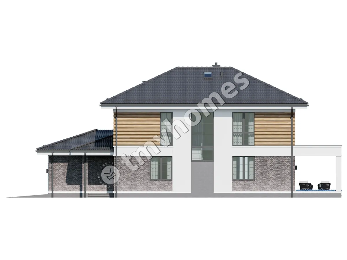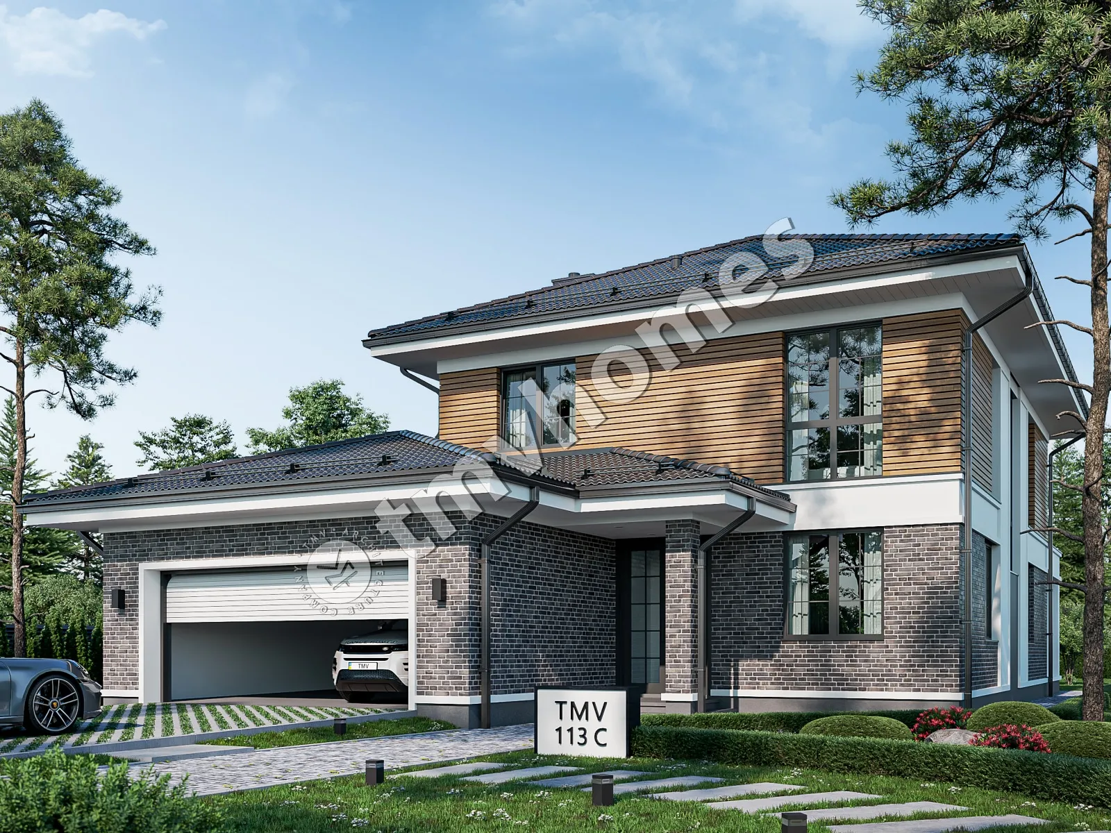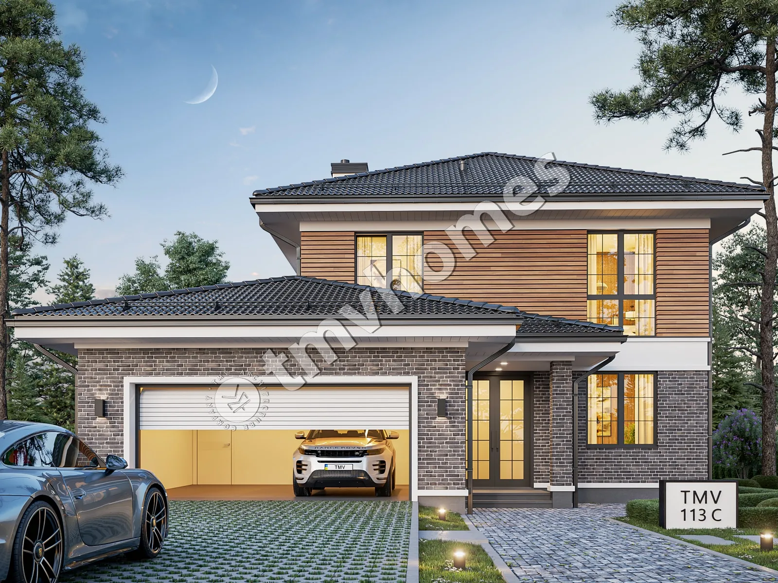 Проект TMV 113C - двухэтажный дом c террасой и гаражом для 2 автомобилей. Состав помещений: прихожая, гостиная, кухня-столовая, 4 спальни, 3 санузла, гардеробная, кладовая, котельная.