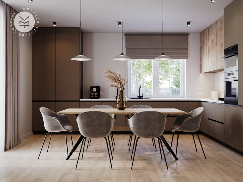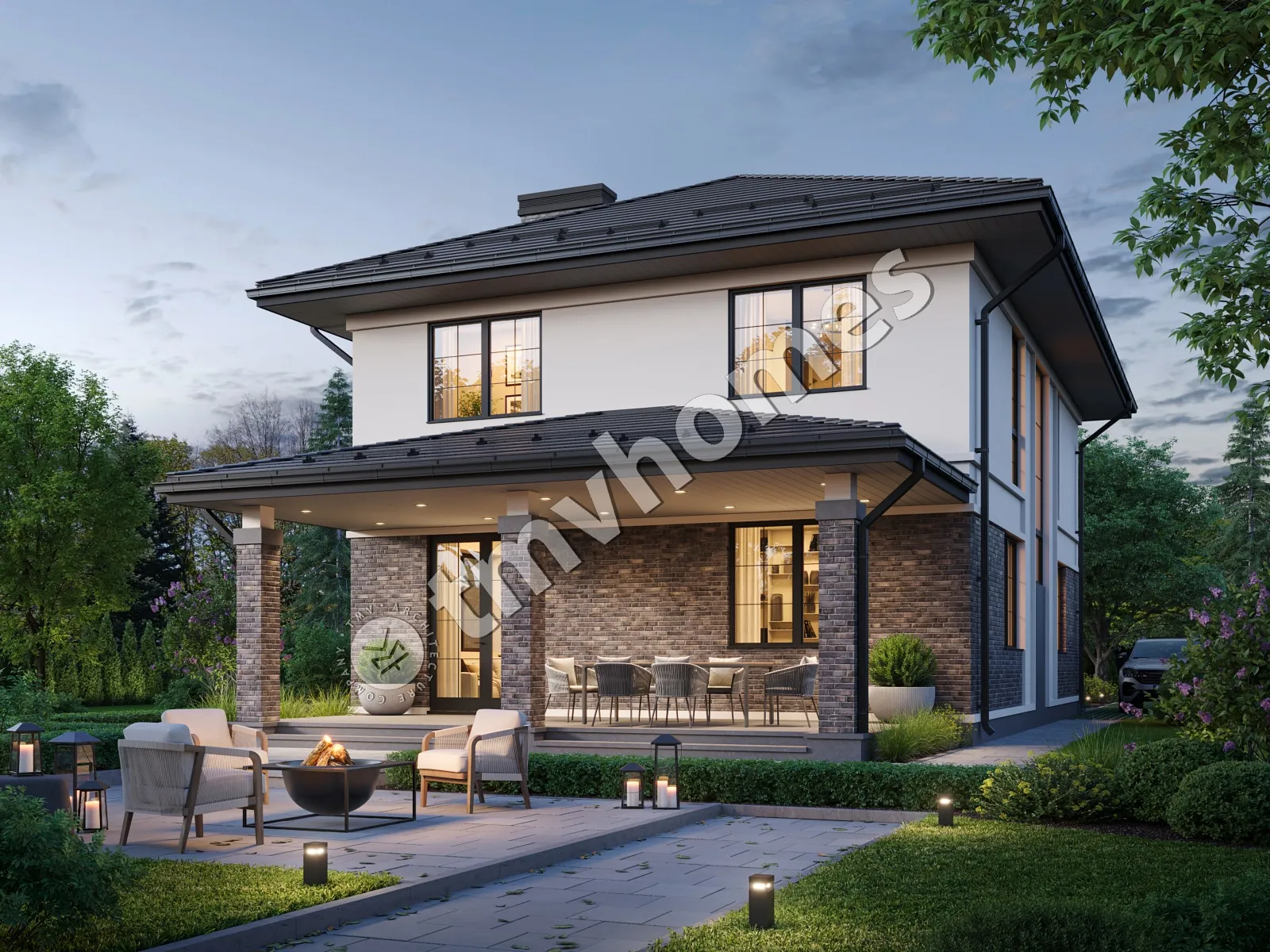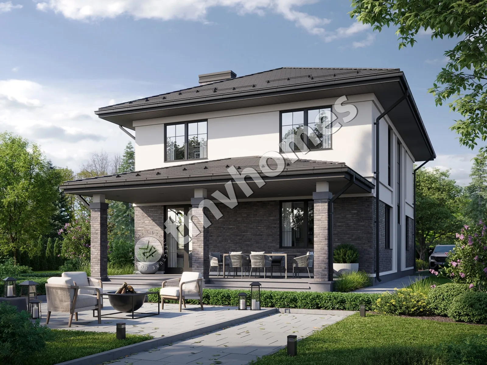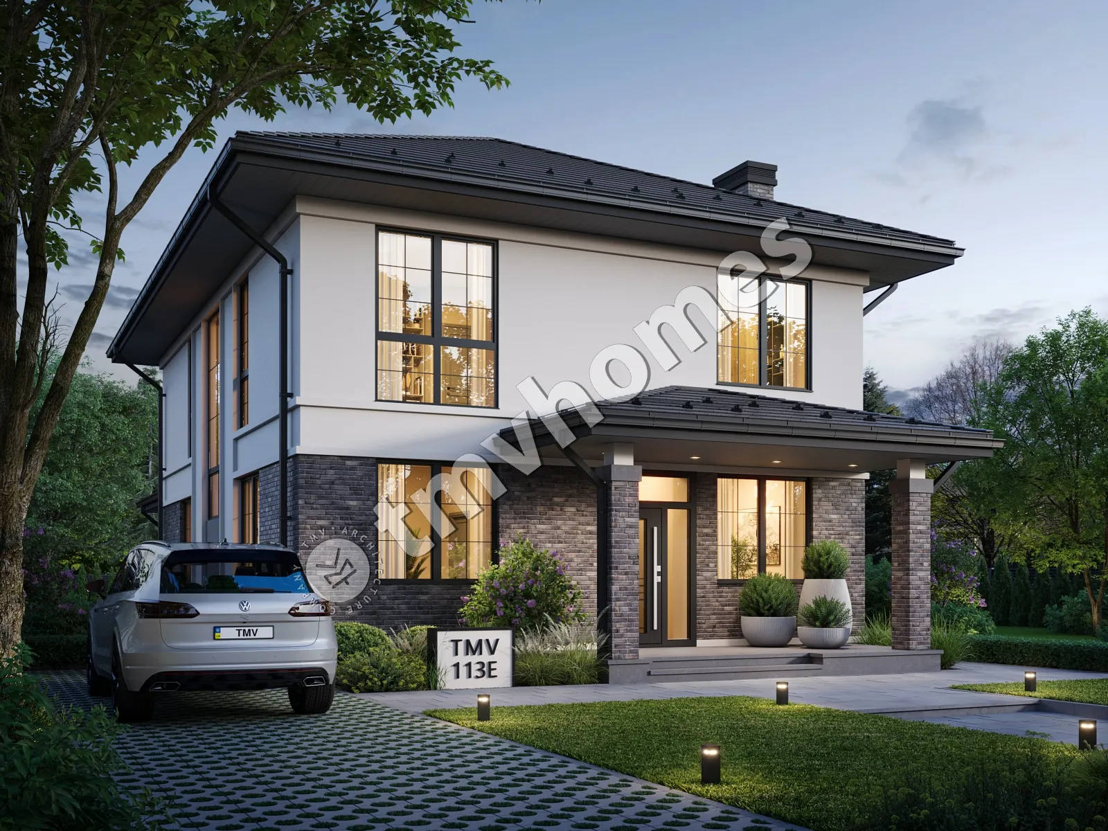 Проект TMV 113E - современный двухэтажный дом с удобной планировкой и крытой террасой. Состав помещений: прихожая, холл, кухня-гостиная, 4 спальни, 3 санузла, гардеробная, кладовая, котельная.