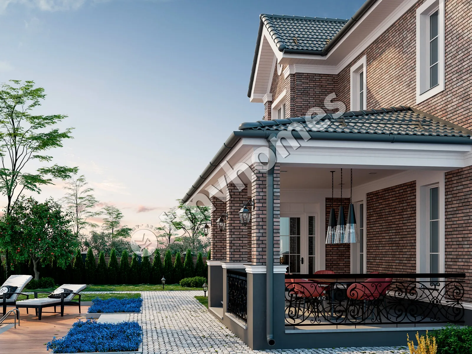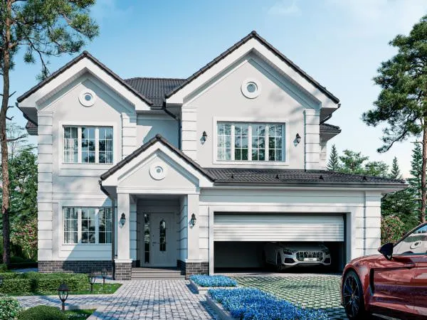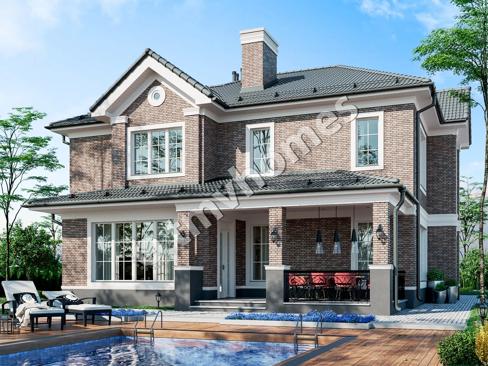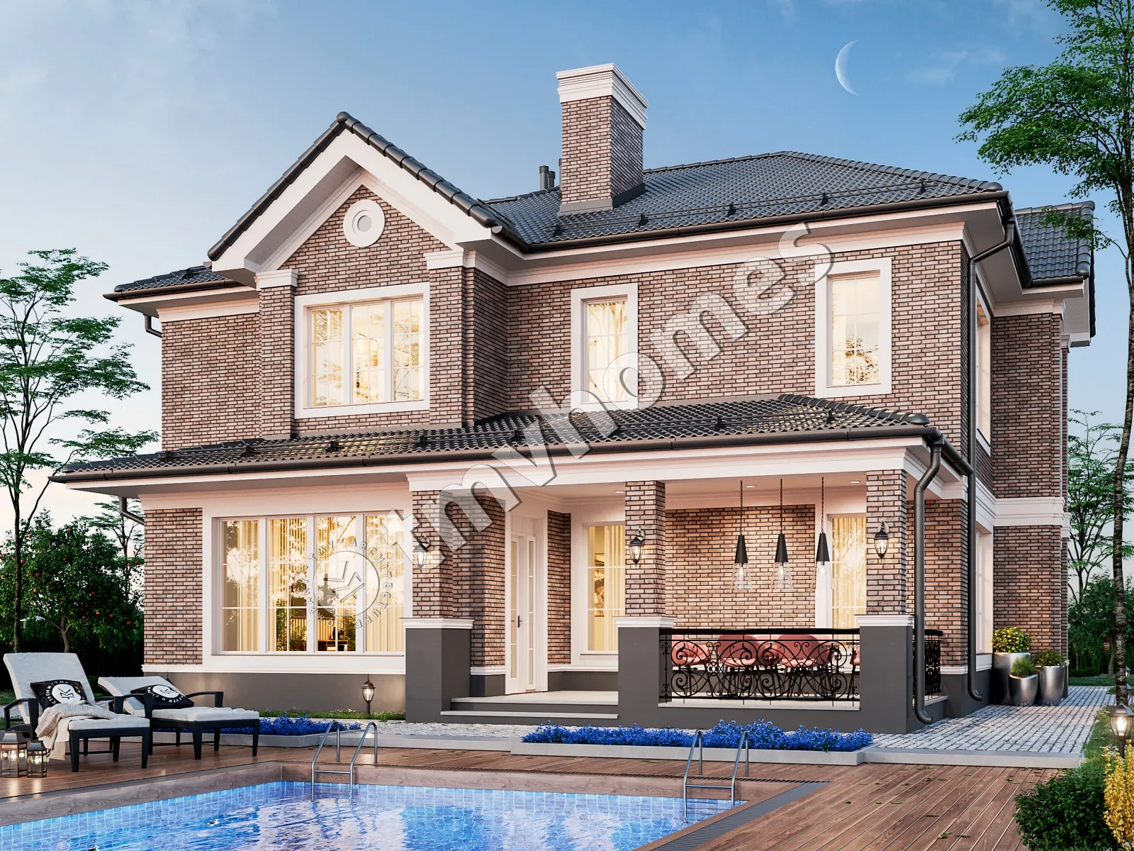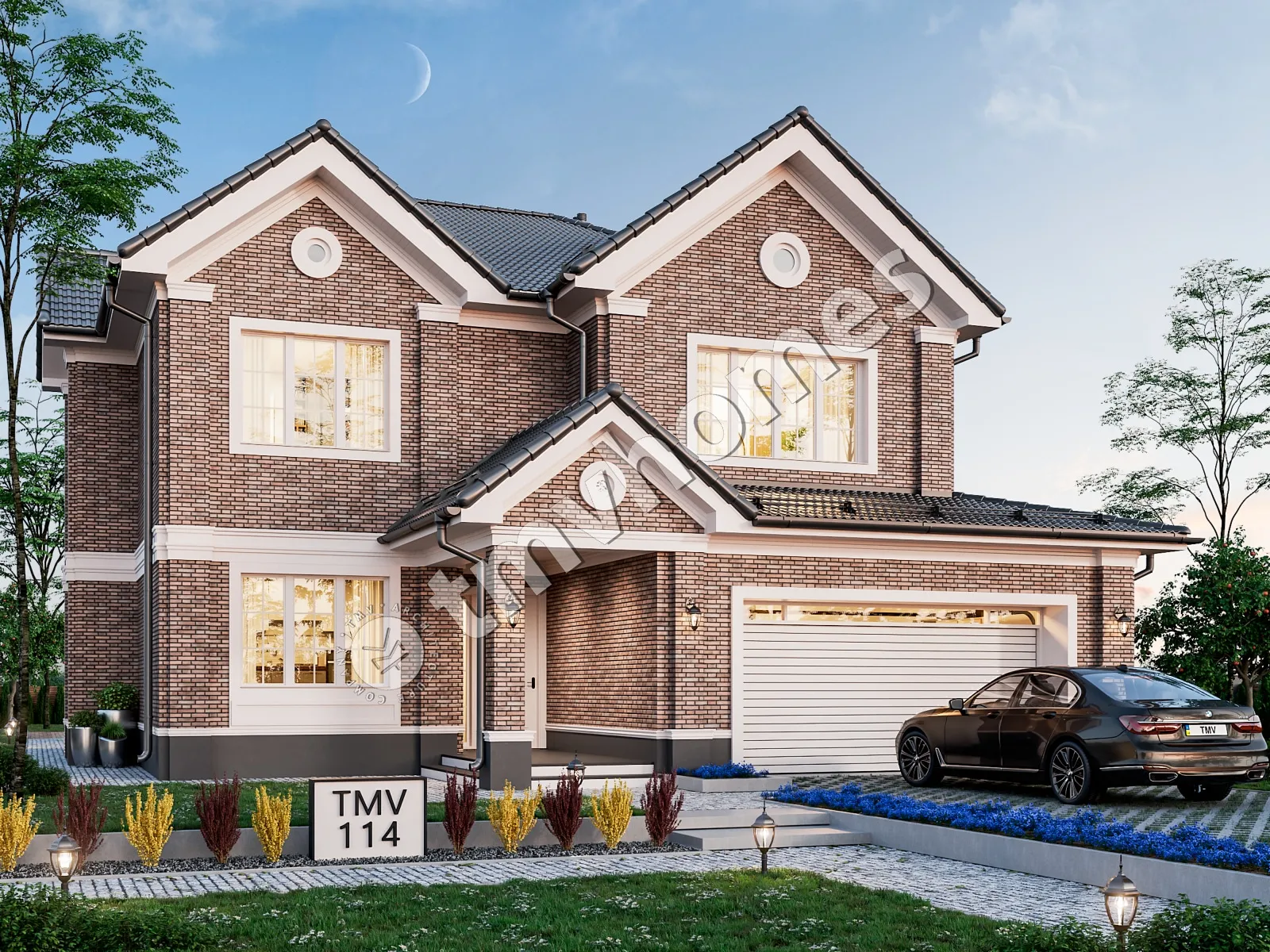 Проект TMV 114 - классический двухэтажный особняк в английском стиле, с террасой и гаражом для 2 автомобилей. Состав помещений: прихожая, холл, кабинет, гостиная, кухня-столовая, 4 спальни, 4 санузла, гардеробная, прачечная, кладовая, котельная.