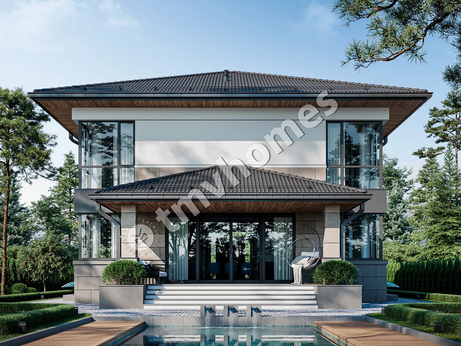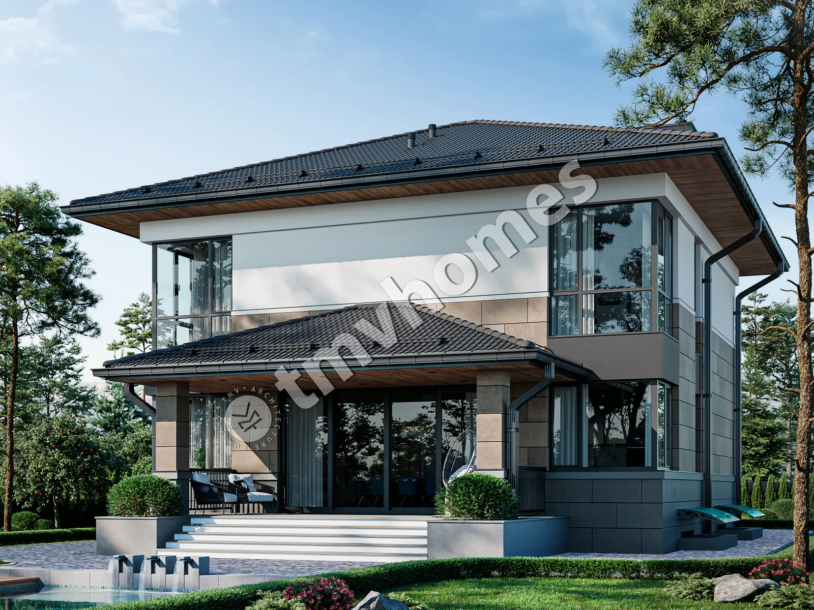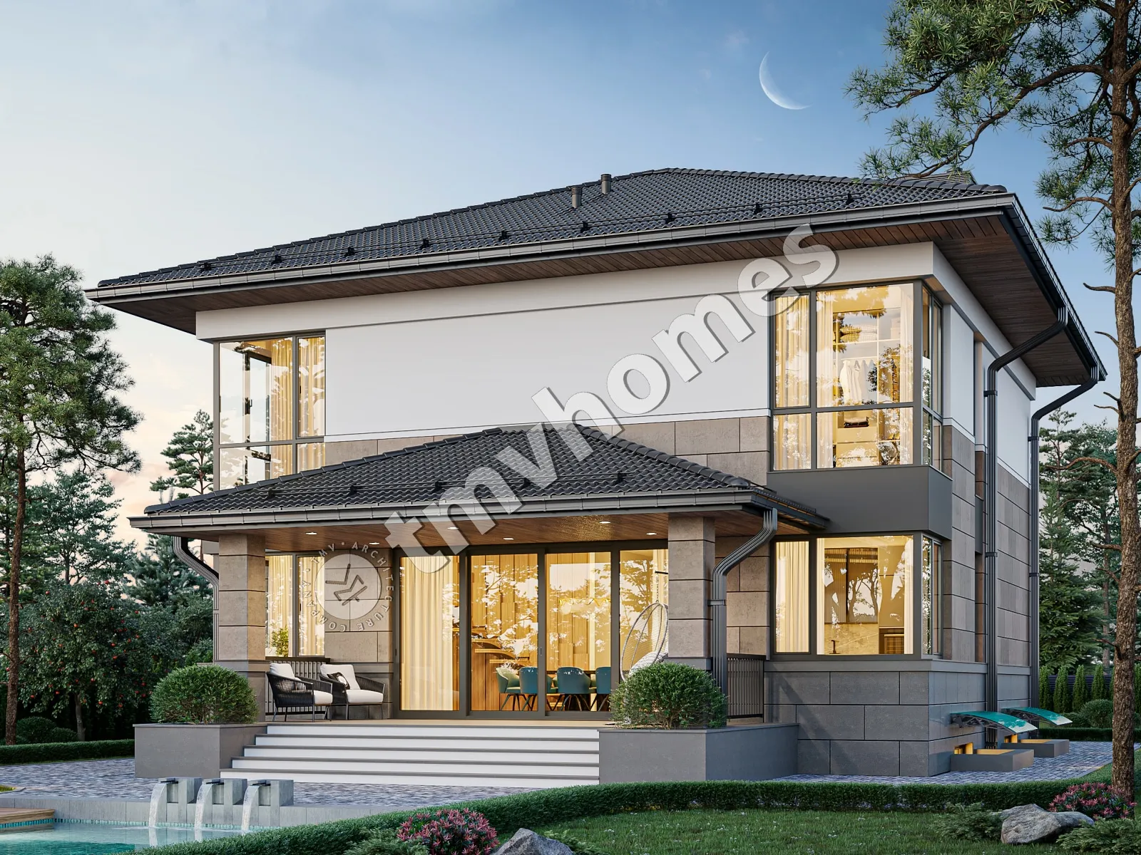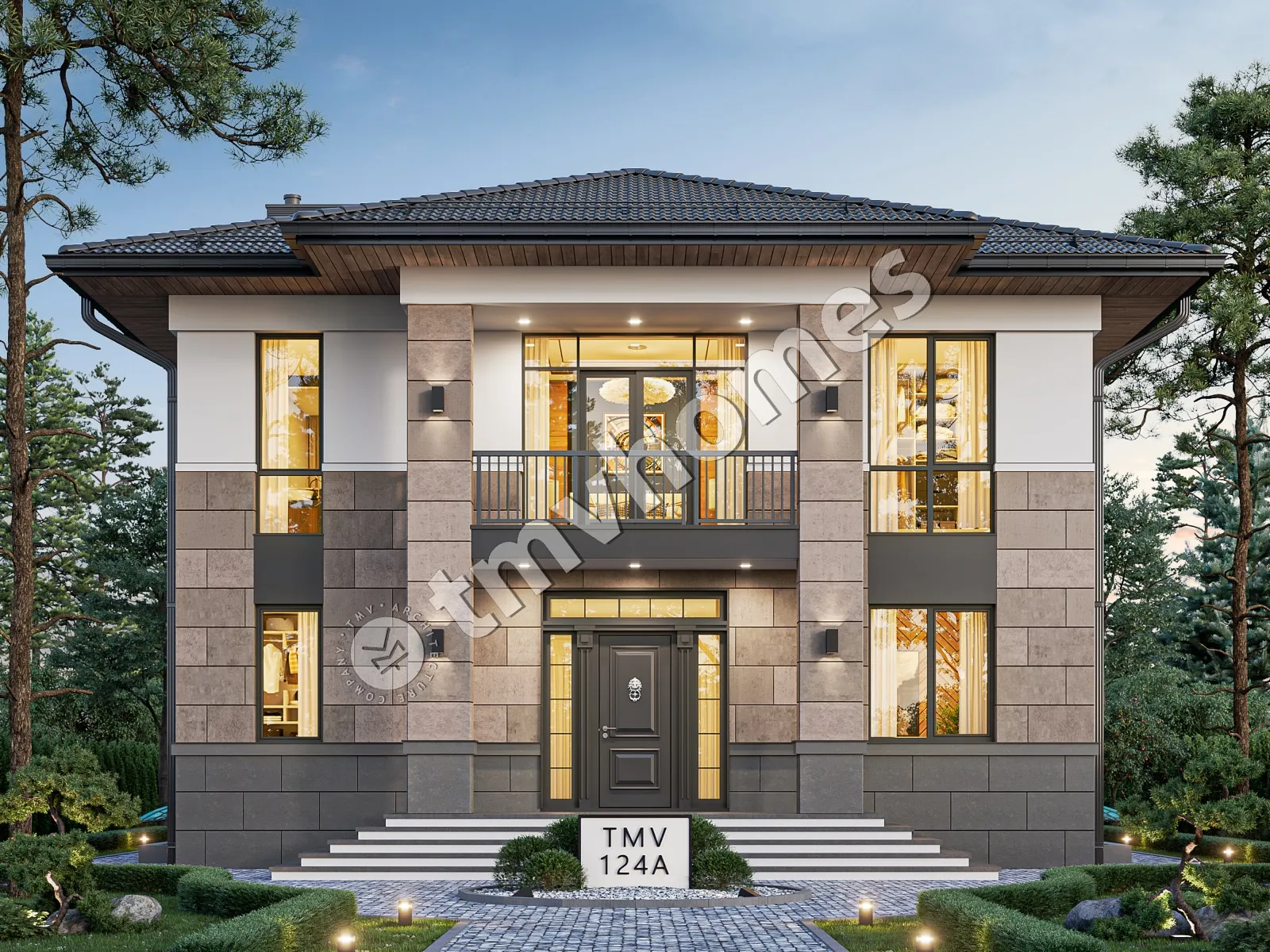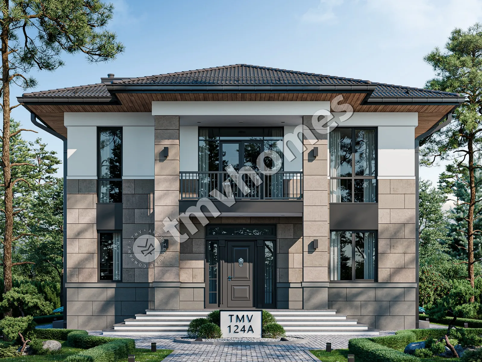 Проект TMV 124A - классический двухэтажный особняк c цокольным этажом, балконом и крытой террасой. Состав помещений: хозяйственные помещения, холл, гостиная, кухня-столовая, кабинет, 3 спальни, 3 санузла, гардеробная, кладовая, котельная.