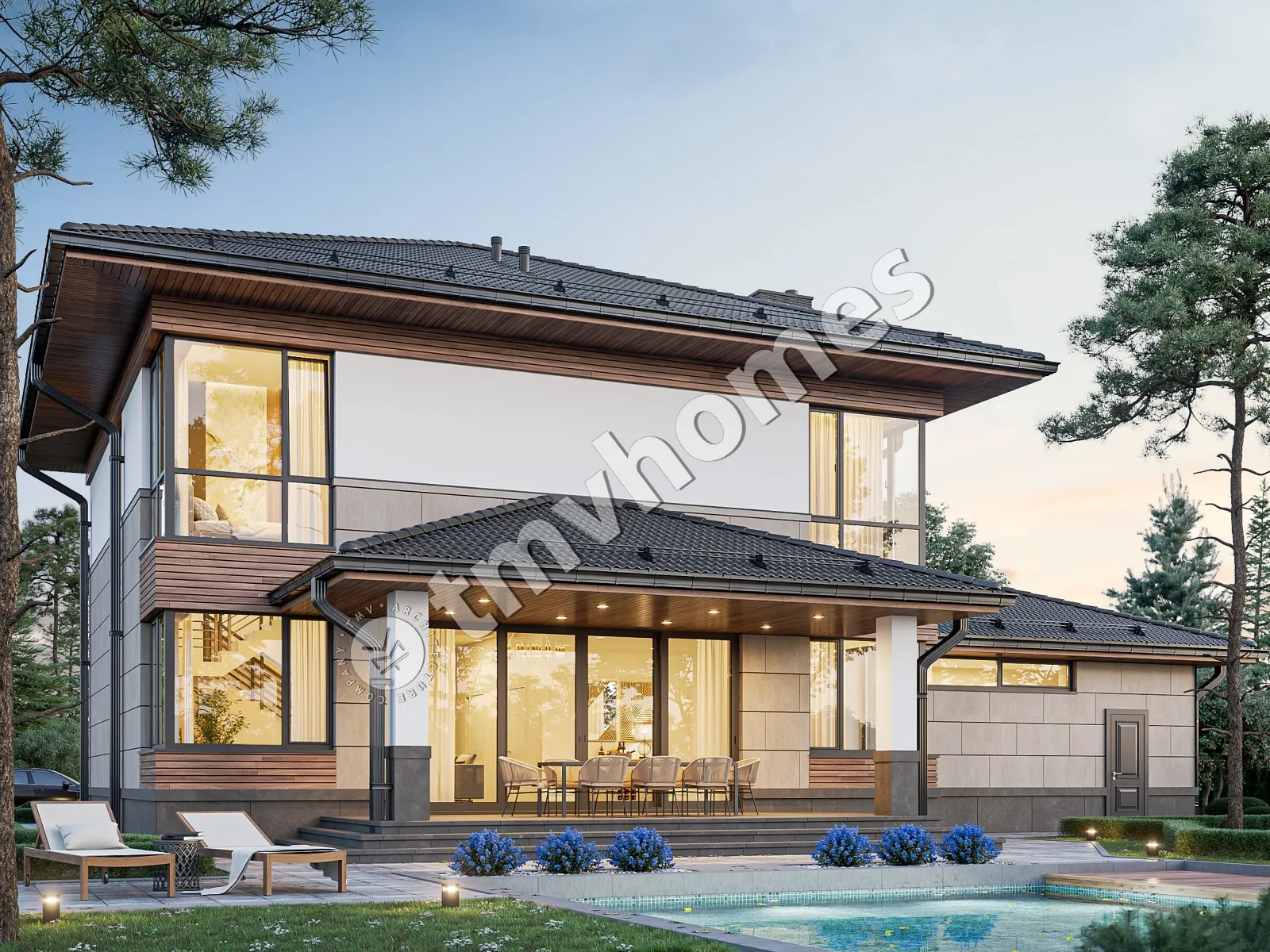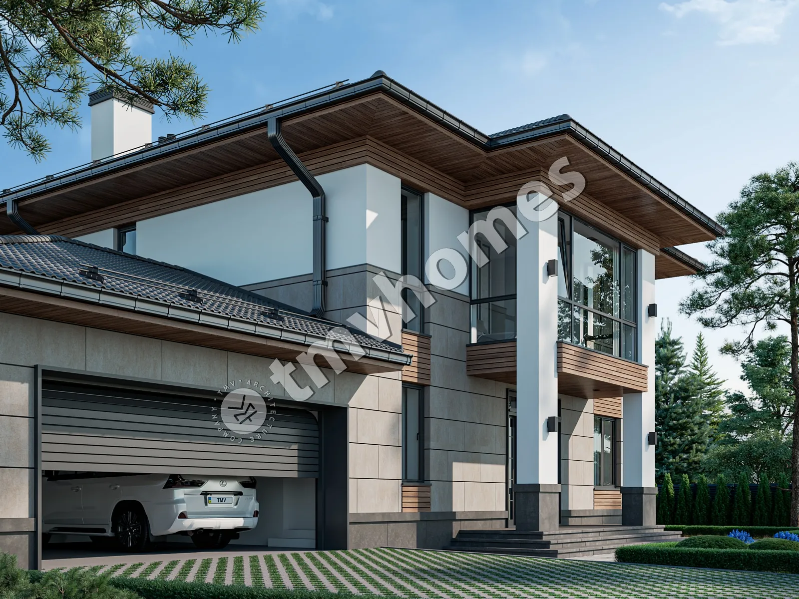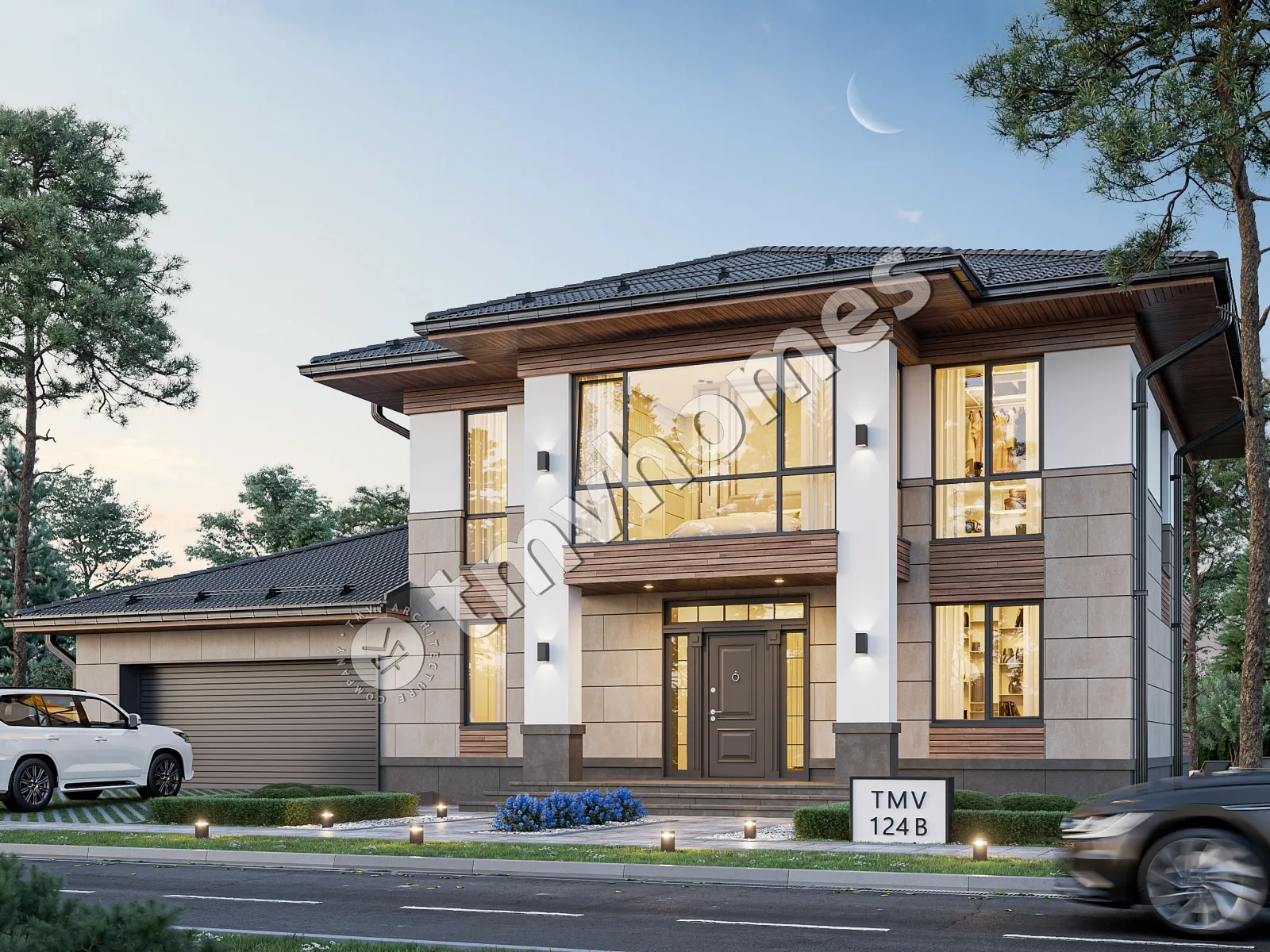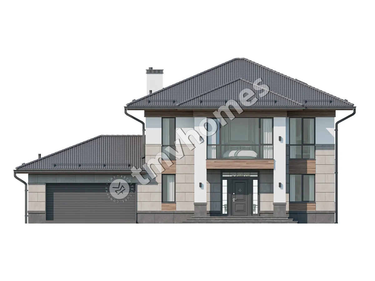 Проект TMV 124B - классический двухэтажный дом с крытой террасой и гаражом для 2 автомобилей. Состав помещений: холл, гостиная, кухня-столовая, кабинет, 3 спальни, 3 санузла, гардеробная, кладовая, котельная.