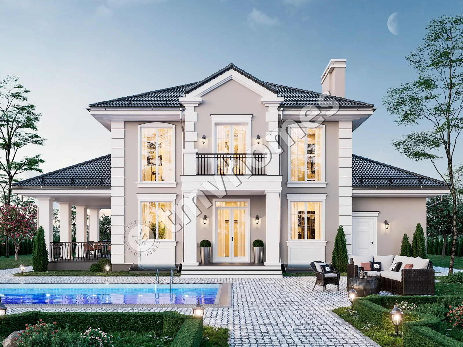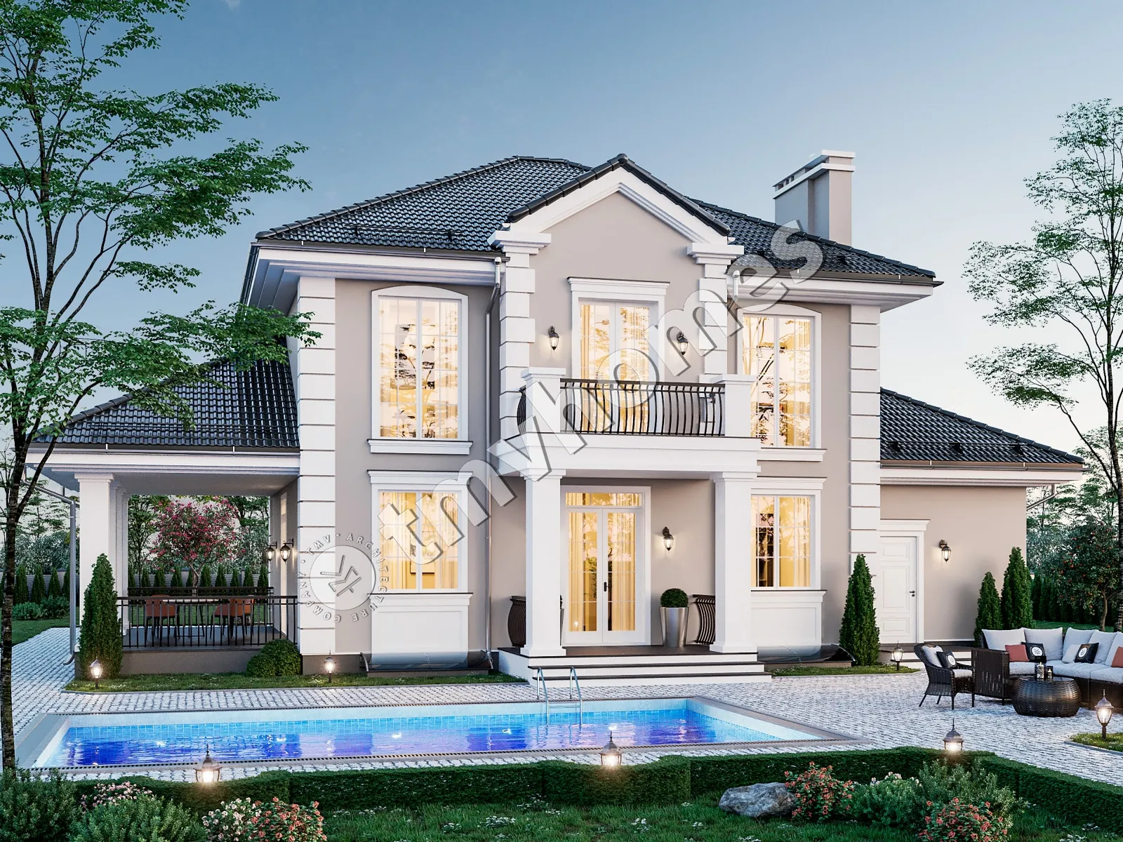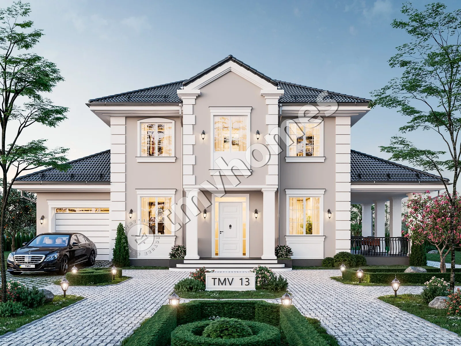 Проект TMV 13 - классический двухэтажный особняк с цокольным этажом, террасой, балконом и гаражом для 1 автомобиля. Состав помещений: прихожая, холл, кухня-столовая, 3 спальни, 2 санузла, комната отдыха, хозяйственные помещения, кладовая, гардеробная.