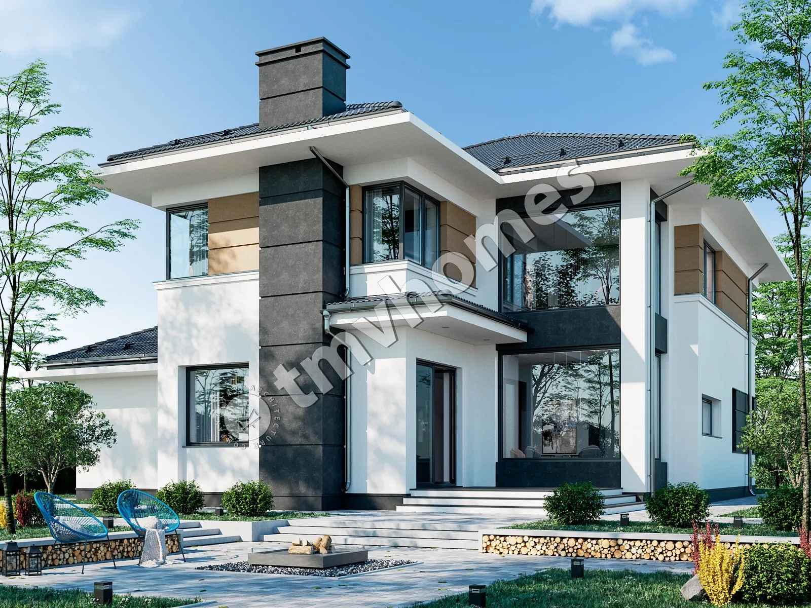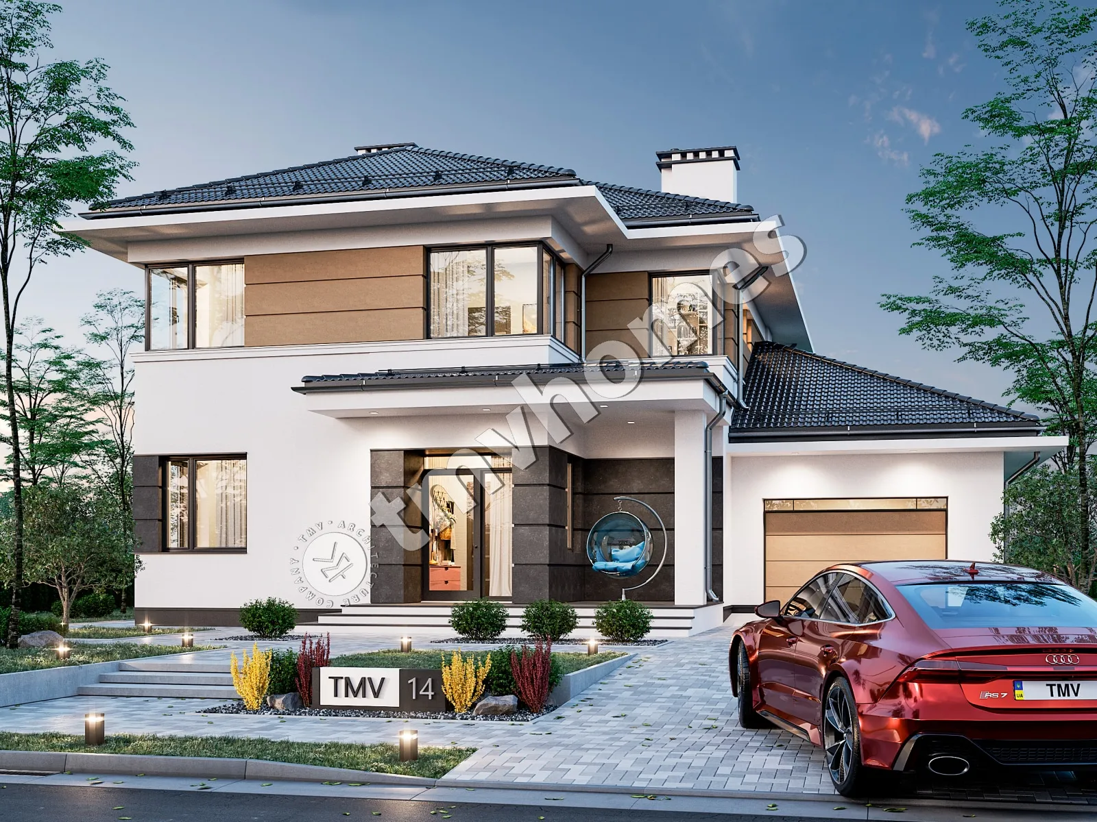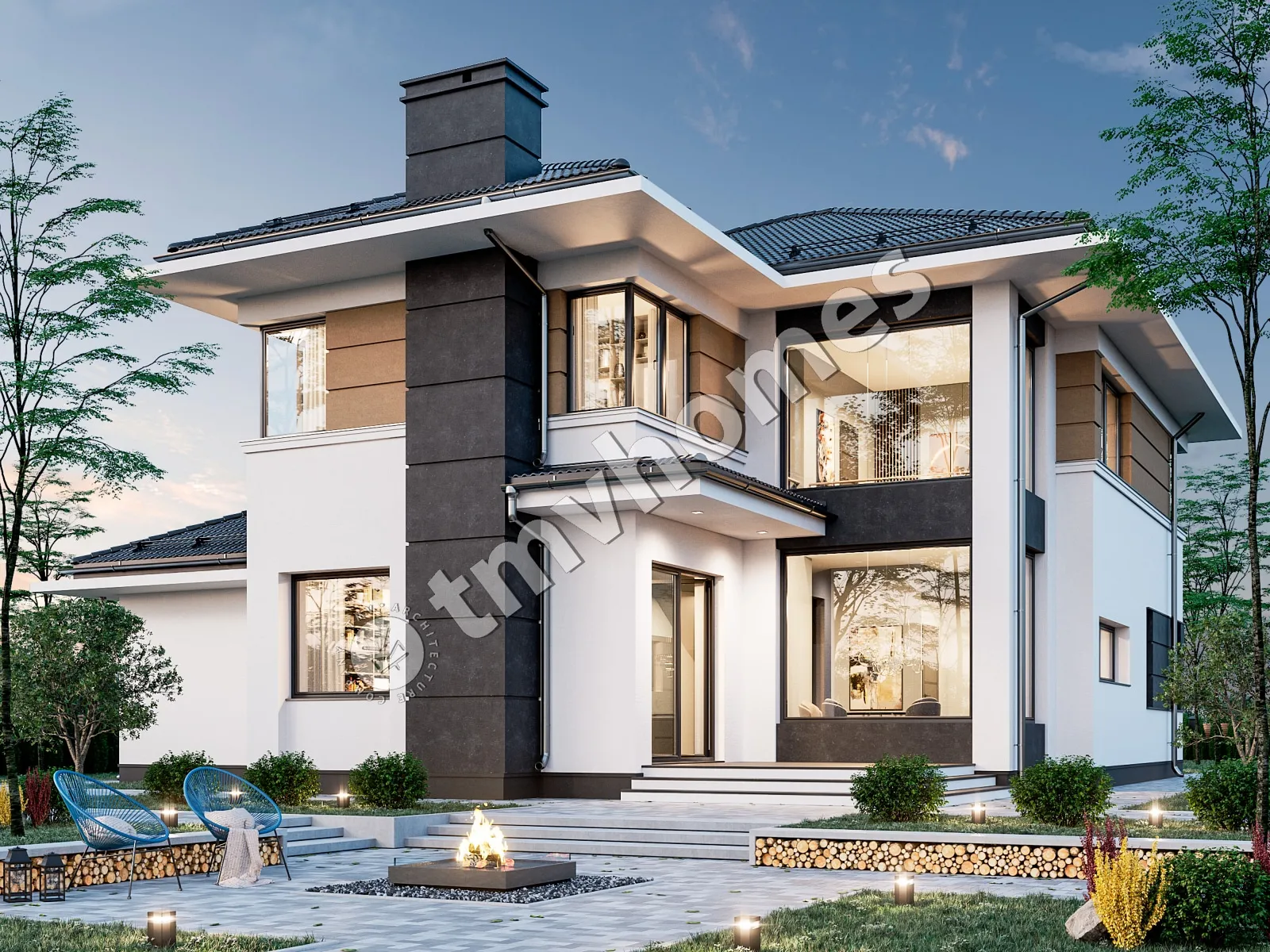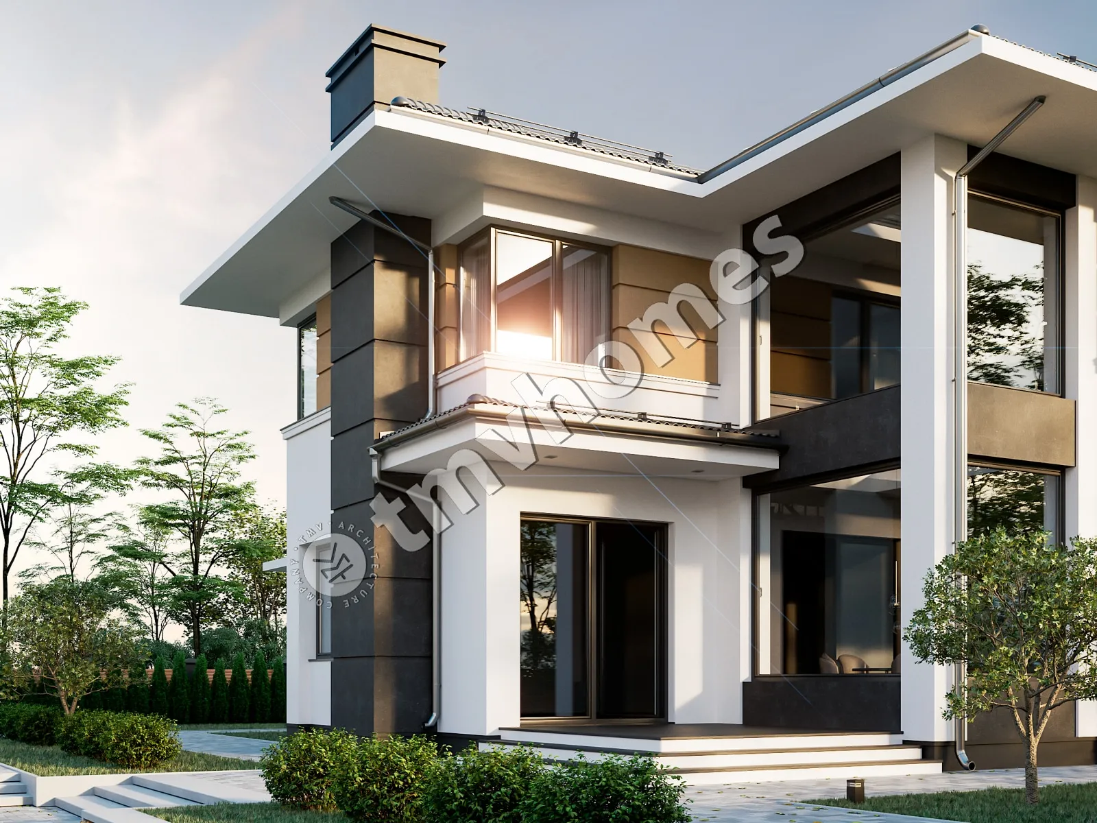 Проект TMV 14 - современный двухэтажный дом со вторым светом и гаражом для 1 автомобиля. Состав помещений: прихожая, холл, кухня-столовая, гостиная, 5 спален, 3 санузла, постирочная, гардеробная, кладовая, котельная.