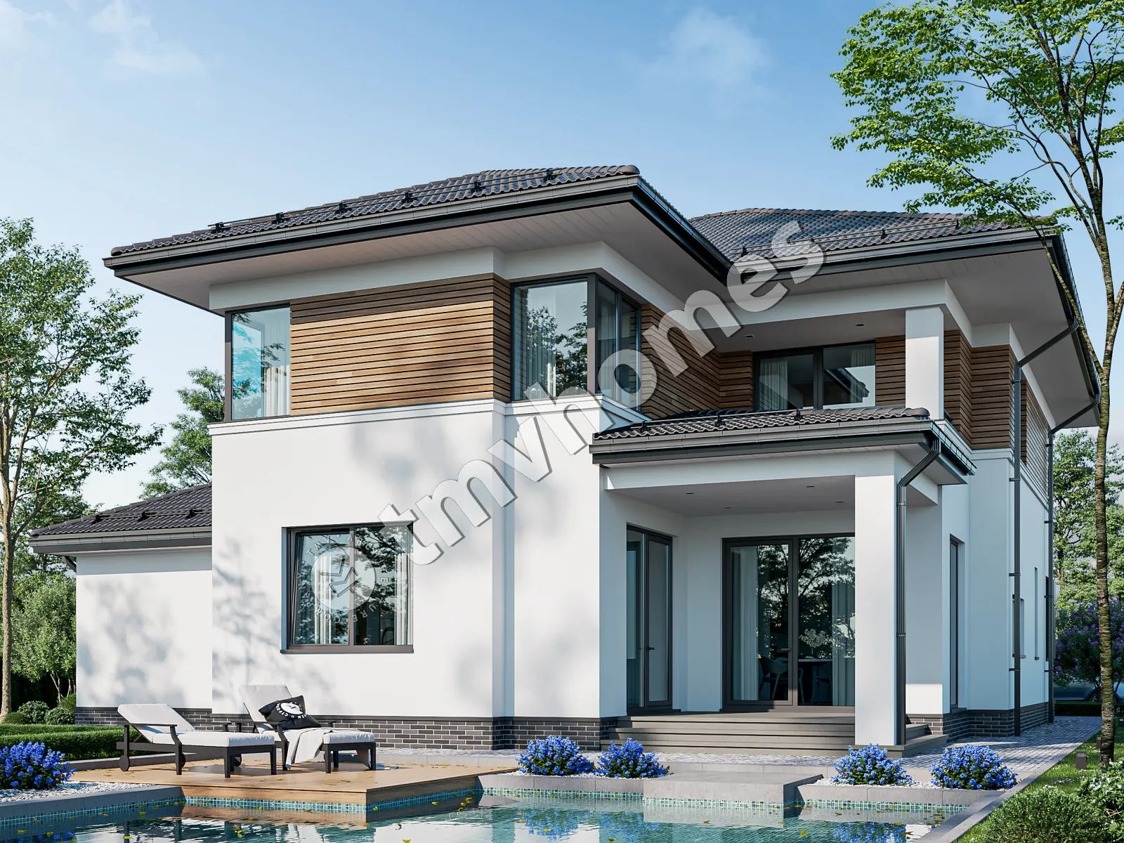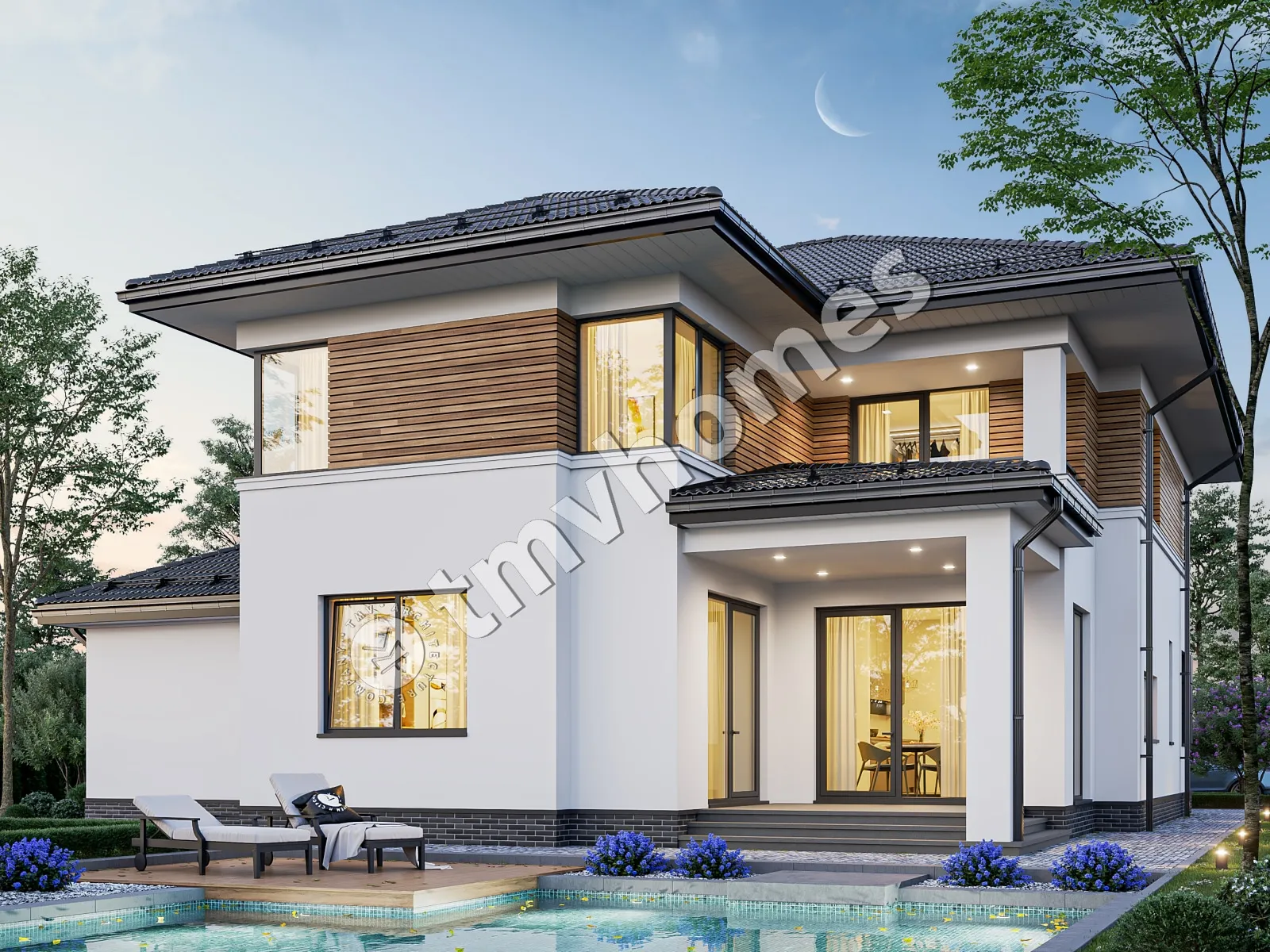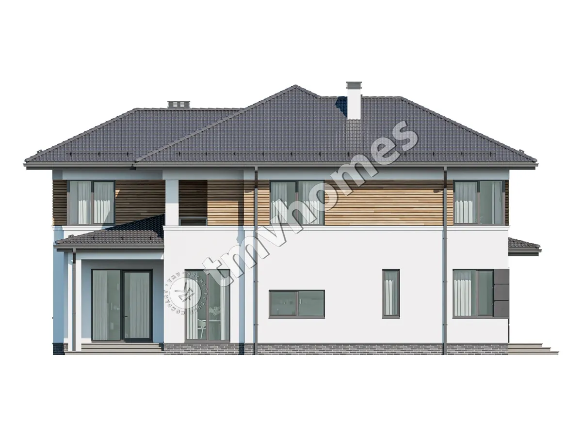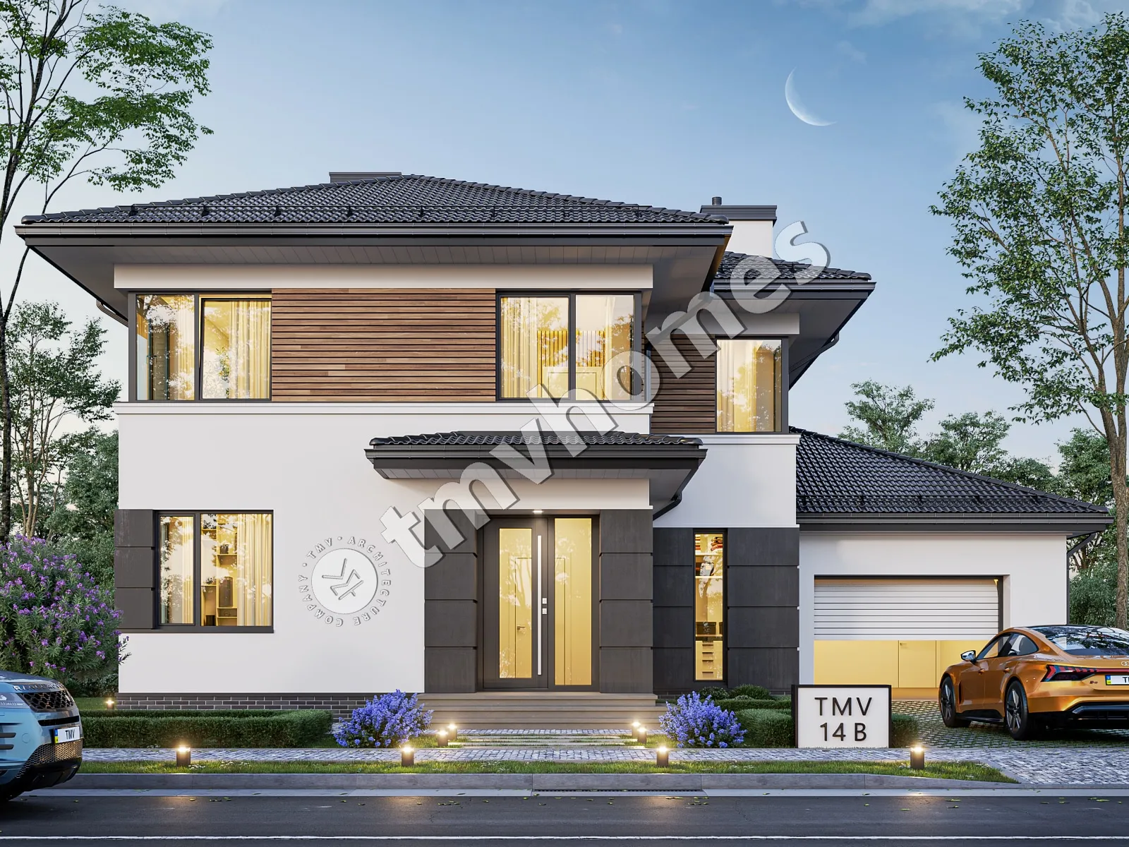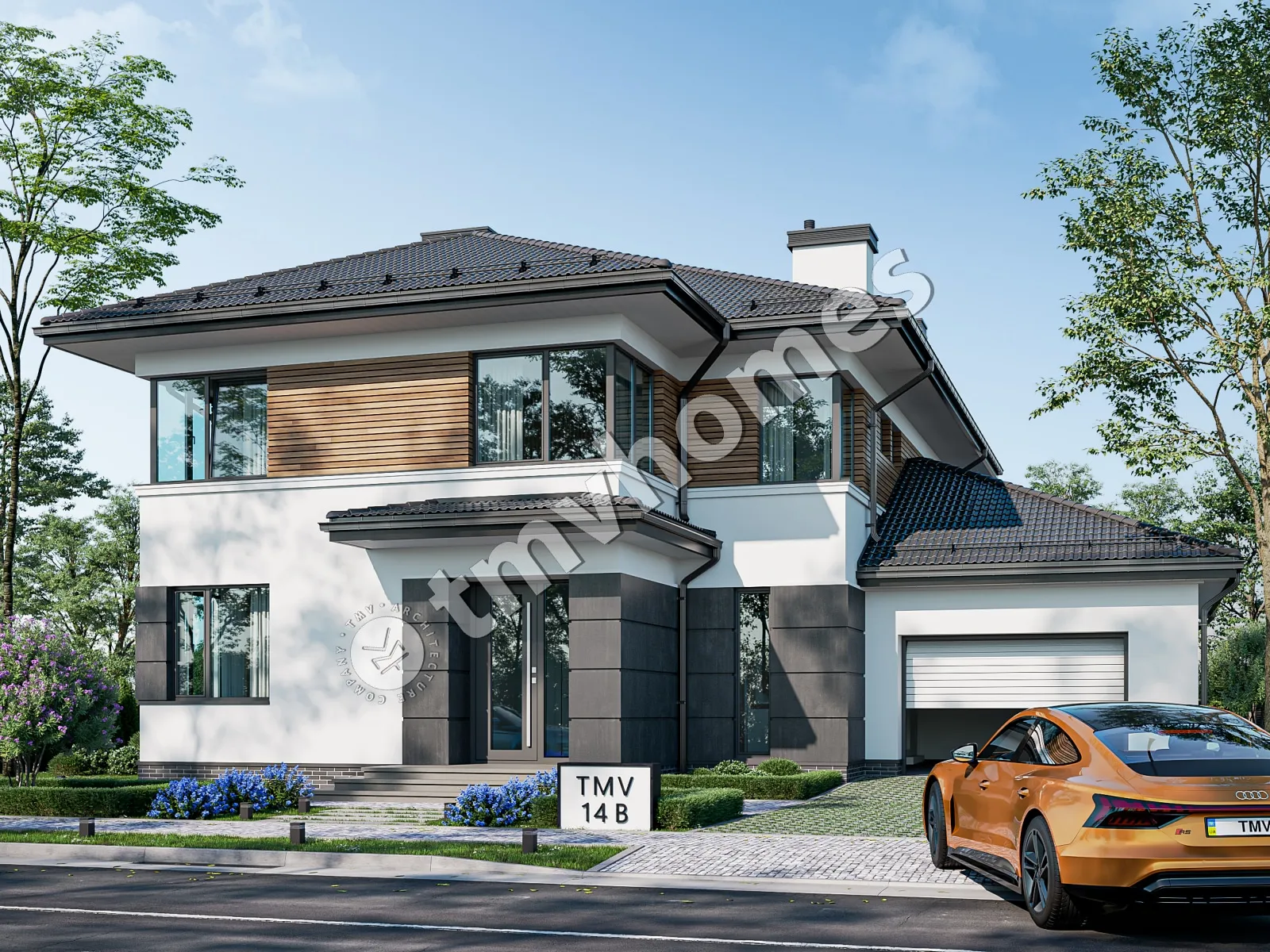 Проект TMV 14B - современный двухэтажный дом с терассой, балконом и гаражом для 1 автомобиля. Состав помещений: прихожая, холл, кухня-столовая, гостиная, 5 спален, 3 санузла, постирочная, гардеробная, кладовая, котельная.