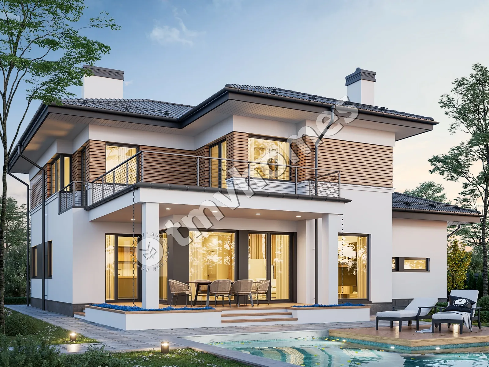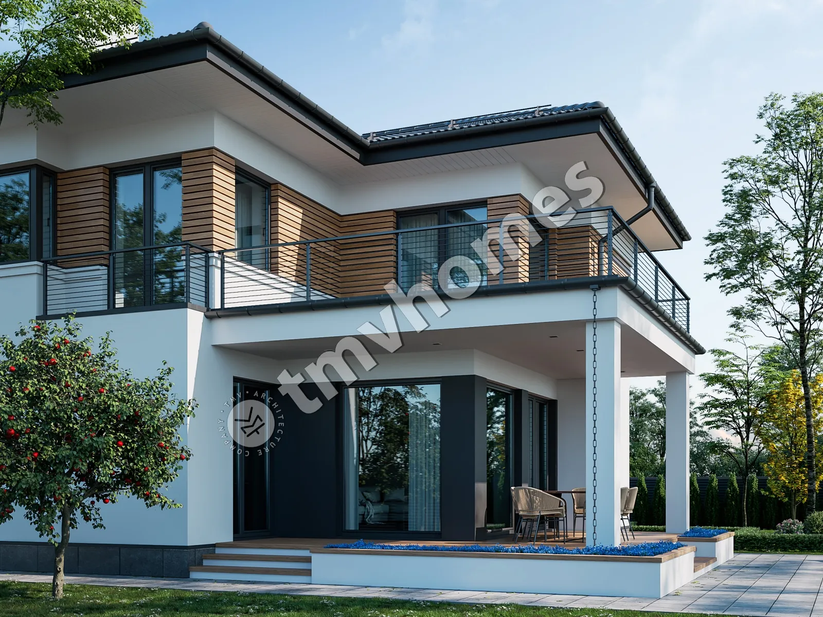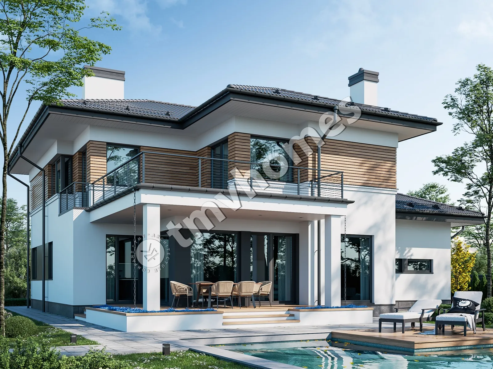 Проект TMV 15A - современный двухэтажный дом с террасами, балконом и гаражом для 2 автомобилей. Состав помещений: прихожая, холл, кухня-столовая, гостиная, кабинет, 3 спальни, 3 санузла, комната отдыха, гардеробная, кладовая, котельная.