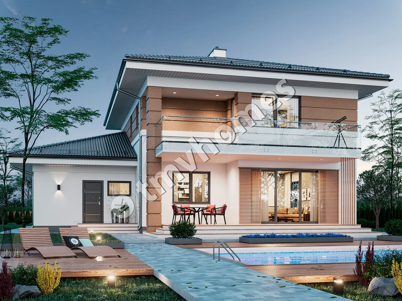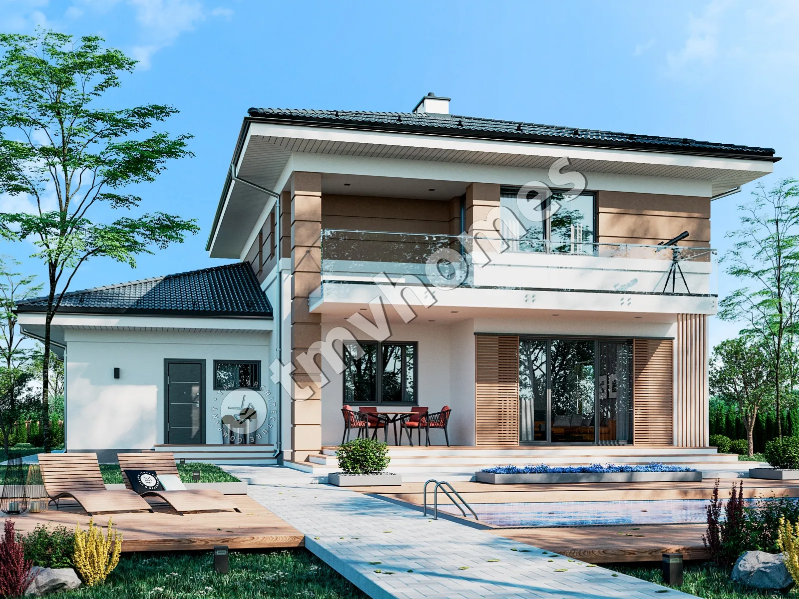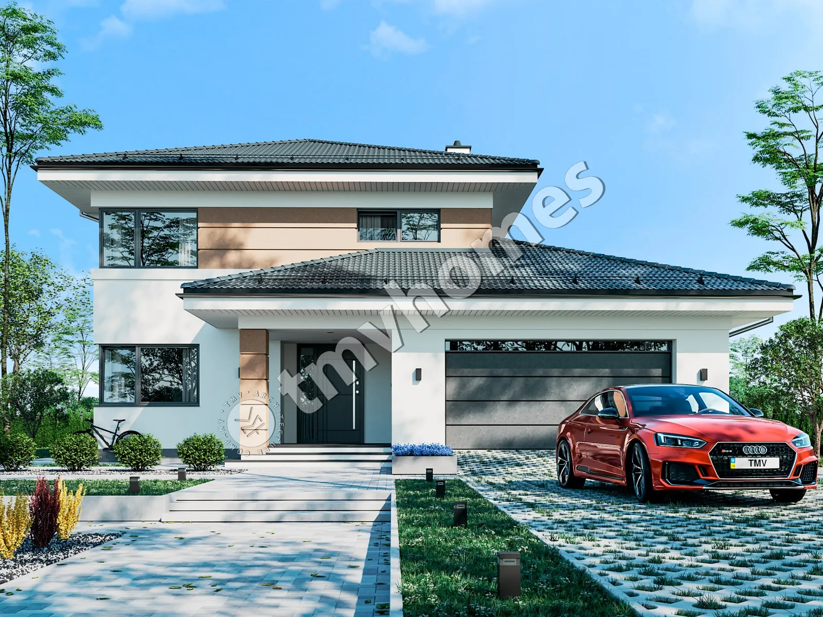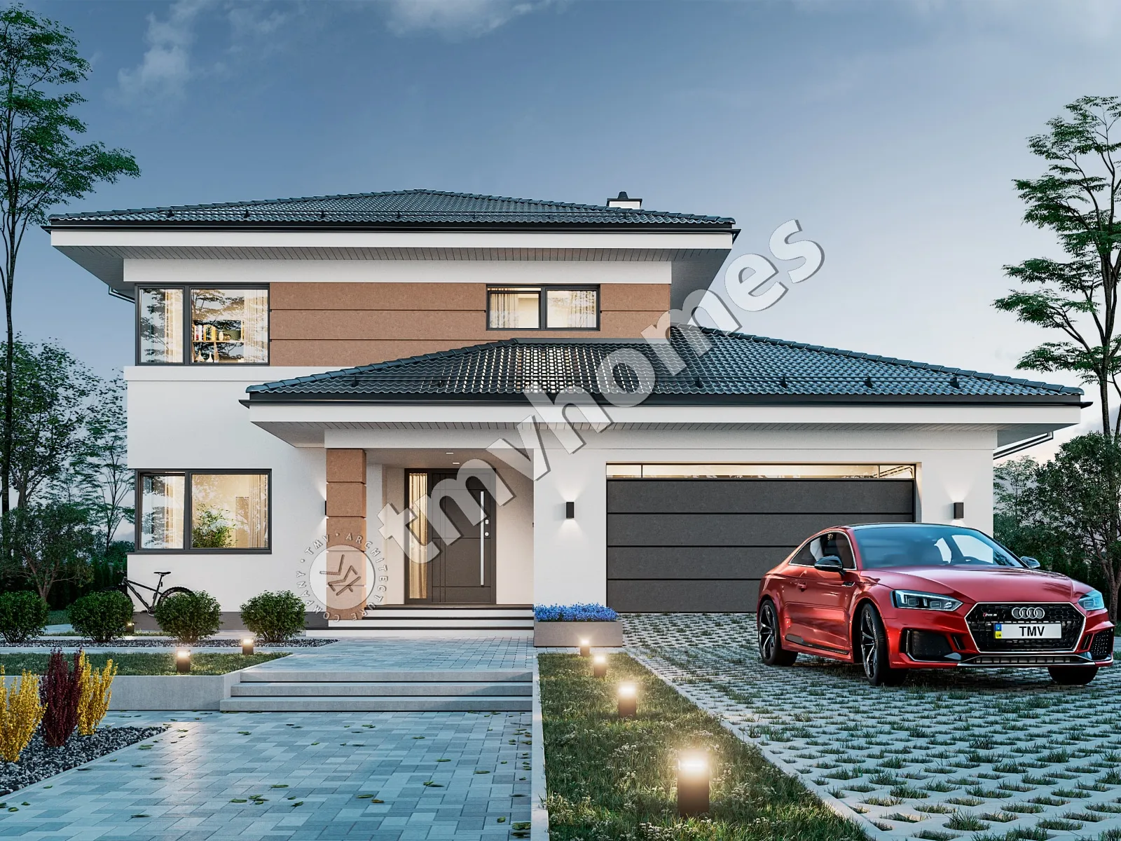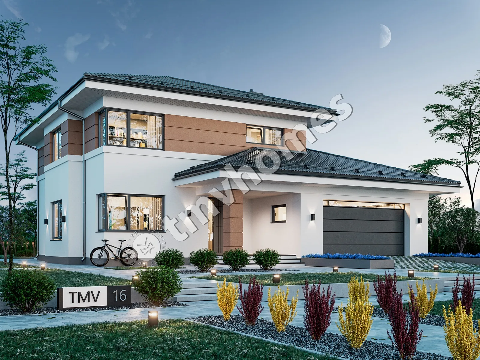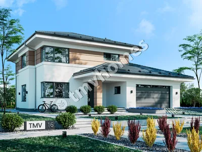 Проект TMV 16 - двухэтажный дом с террасой, балконом и гаражом для 2 автомобилей. Состав помещений: прихожая, холл, кухня-столовая, гостиная, кабинет, 3 спальни, 3 санузла, гардеробная, кладовая, инвентарная, котельная.