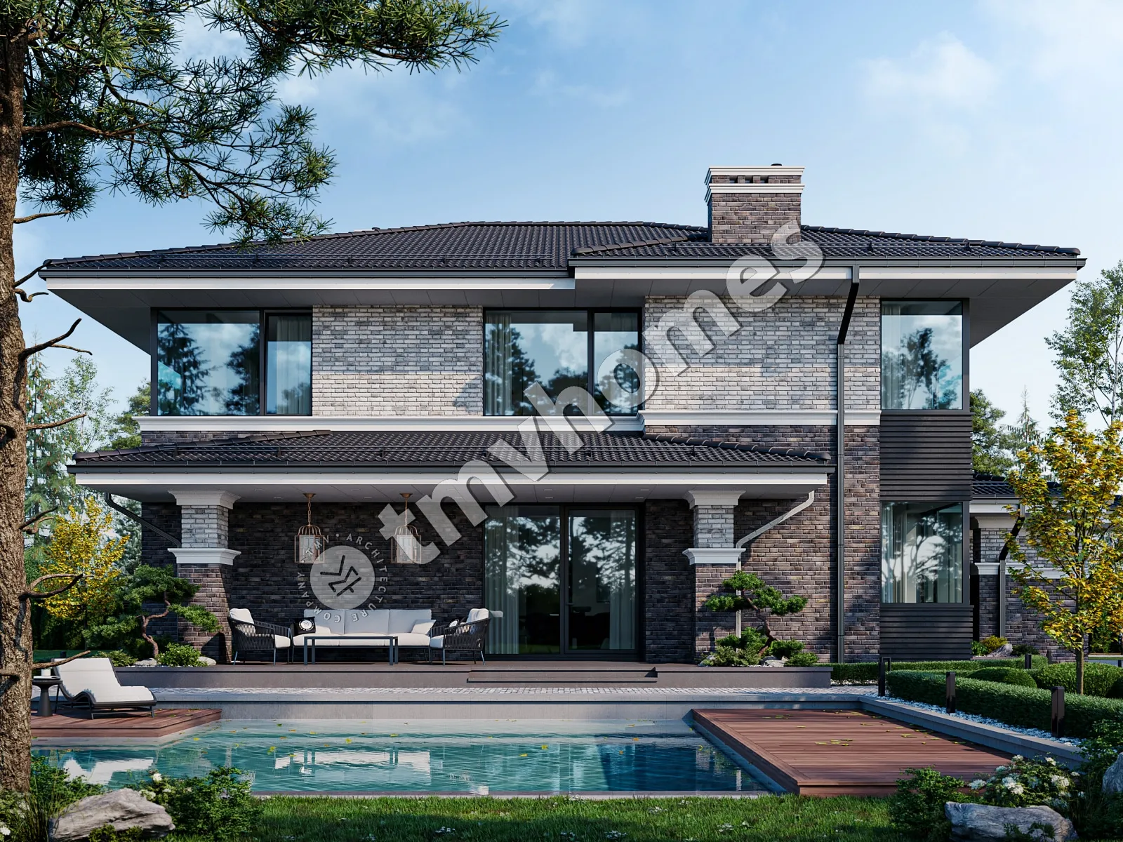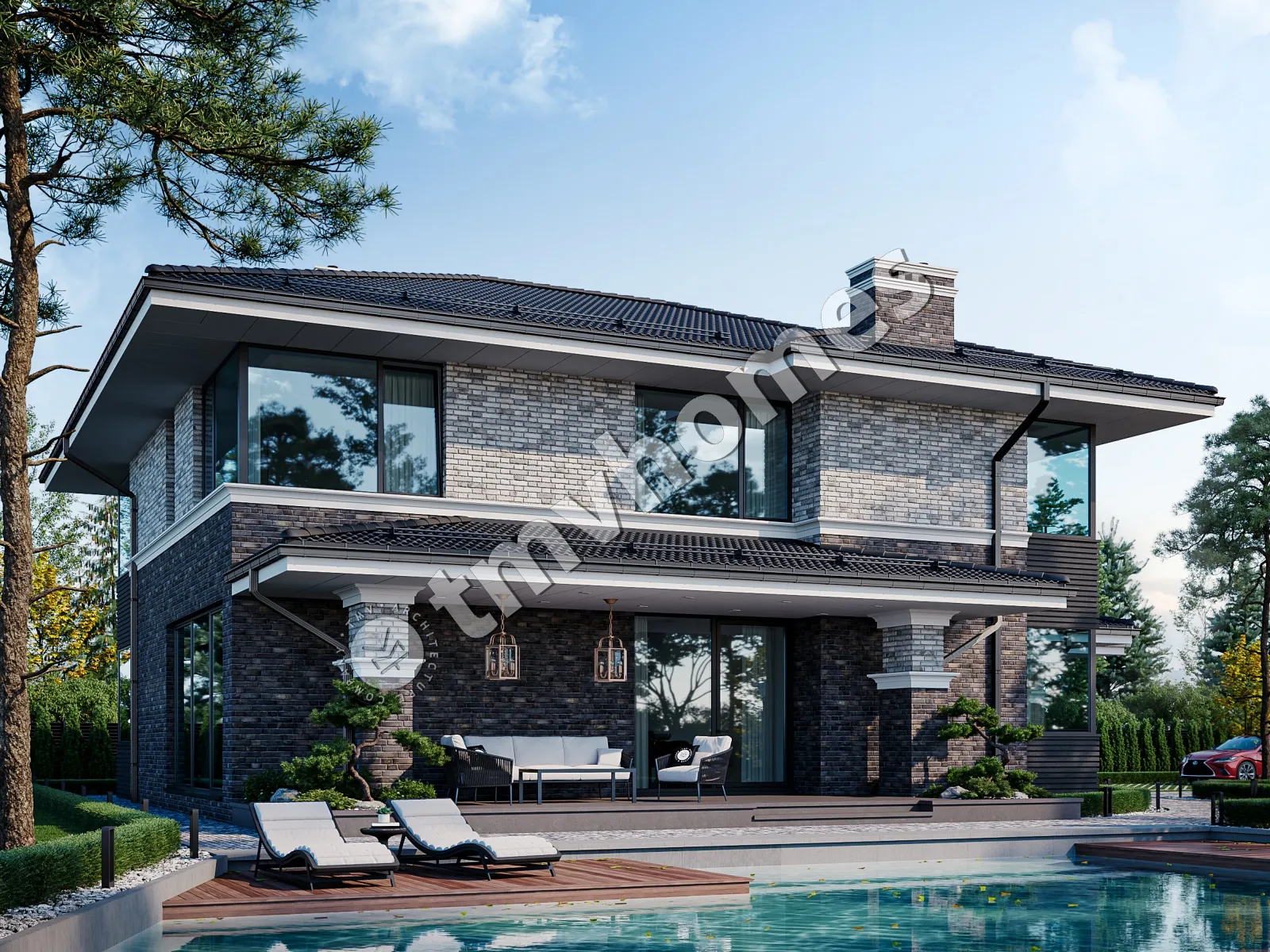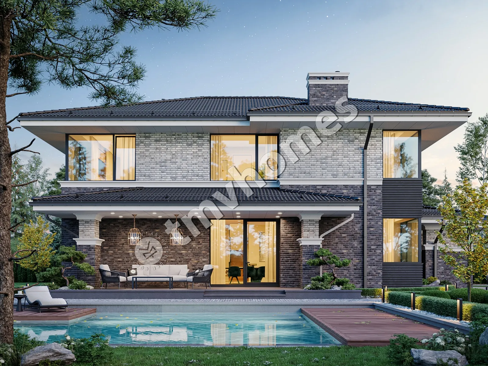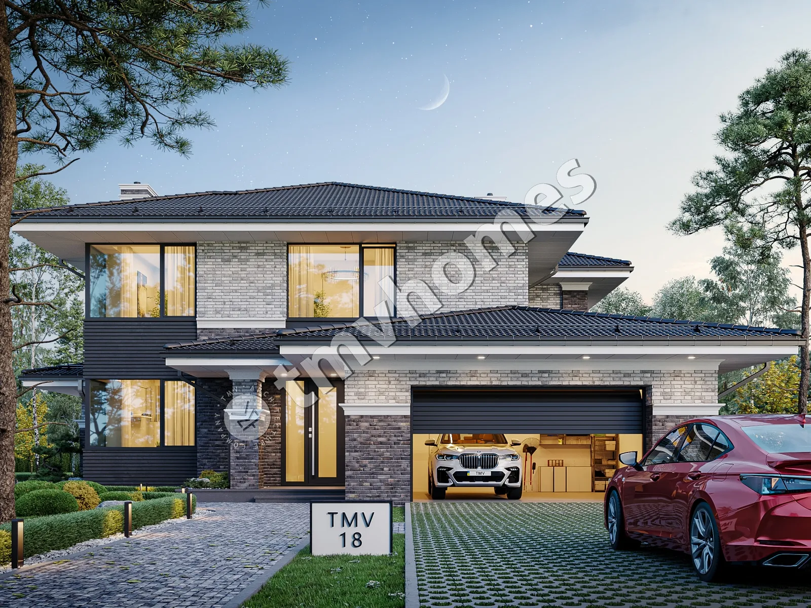 Проект TMV 18 - комфортный кирпичный двухэтажный дом с крытой террасой и гаражом для 2 автомобилей. Состав помещений: прихожая, холл, гостиная, кухня-столовая, кабинет, 4 спальни, 3 санузла, гардеробная, кладовая, котельная.