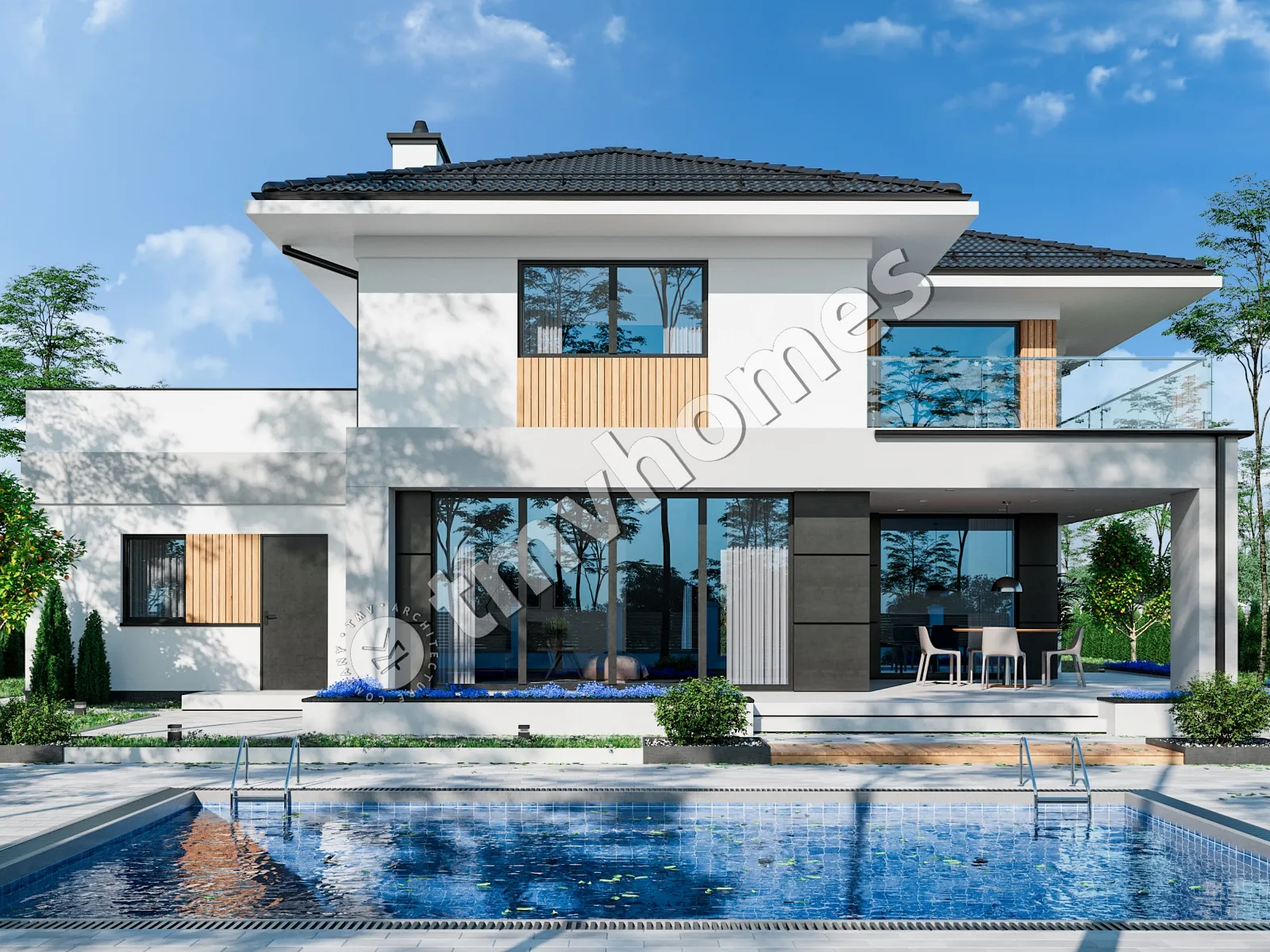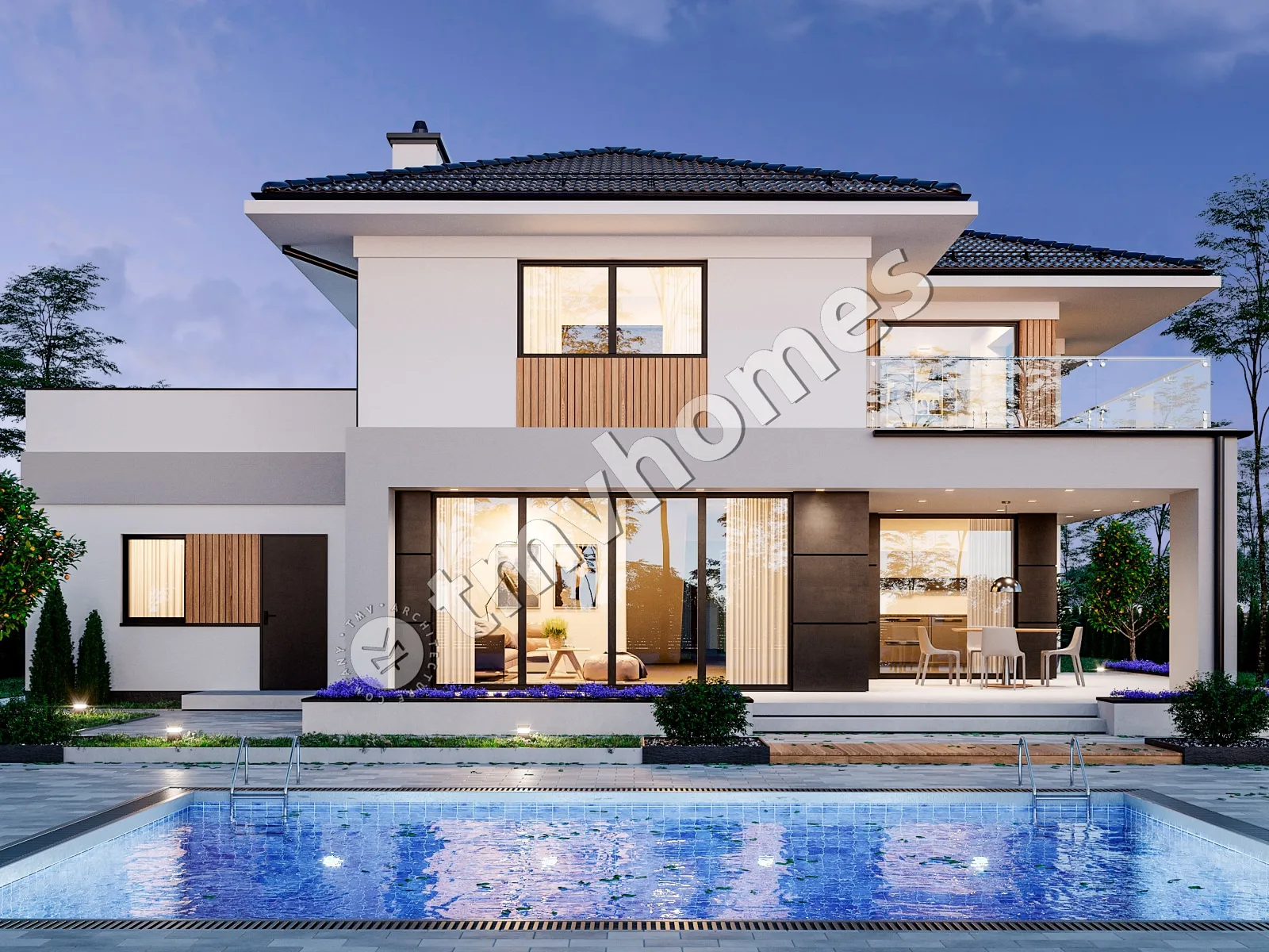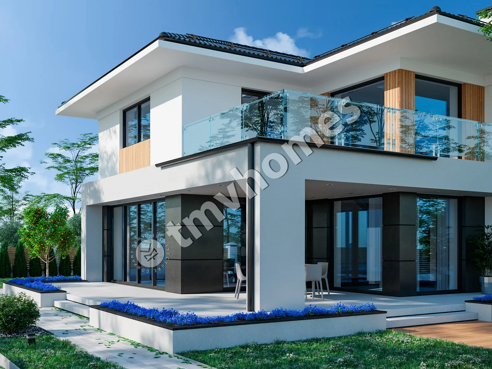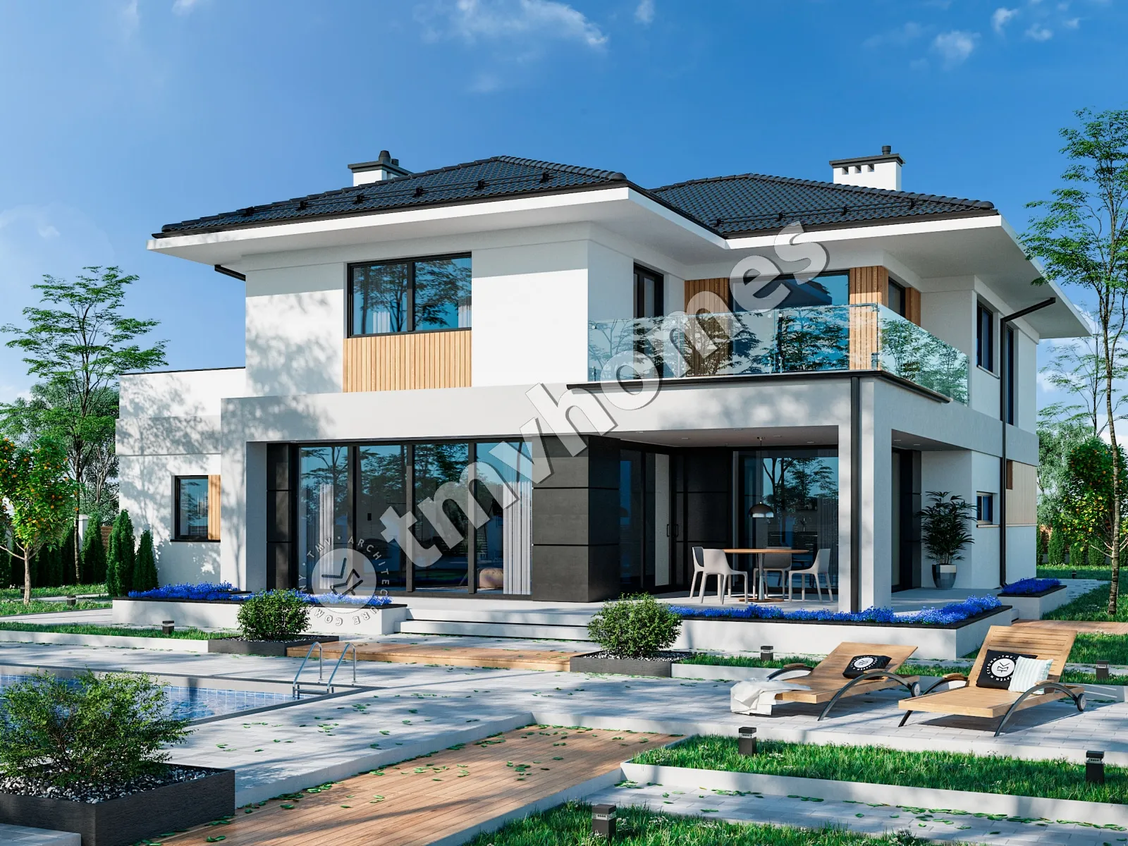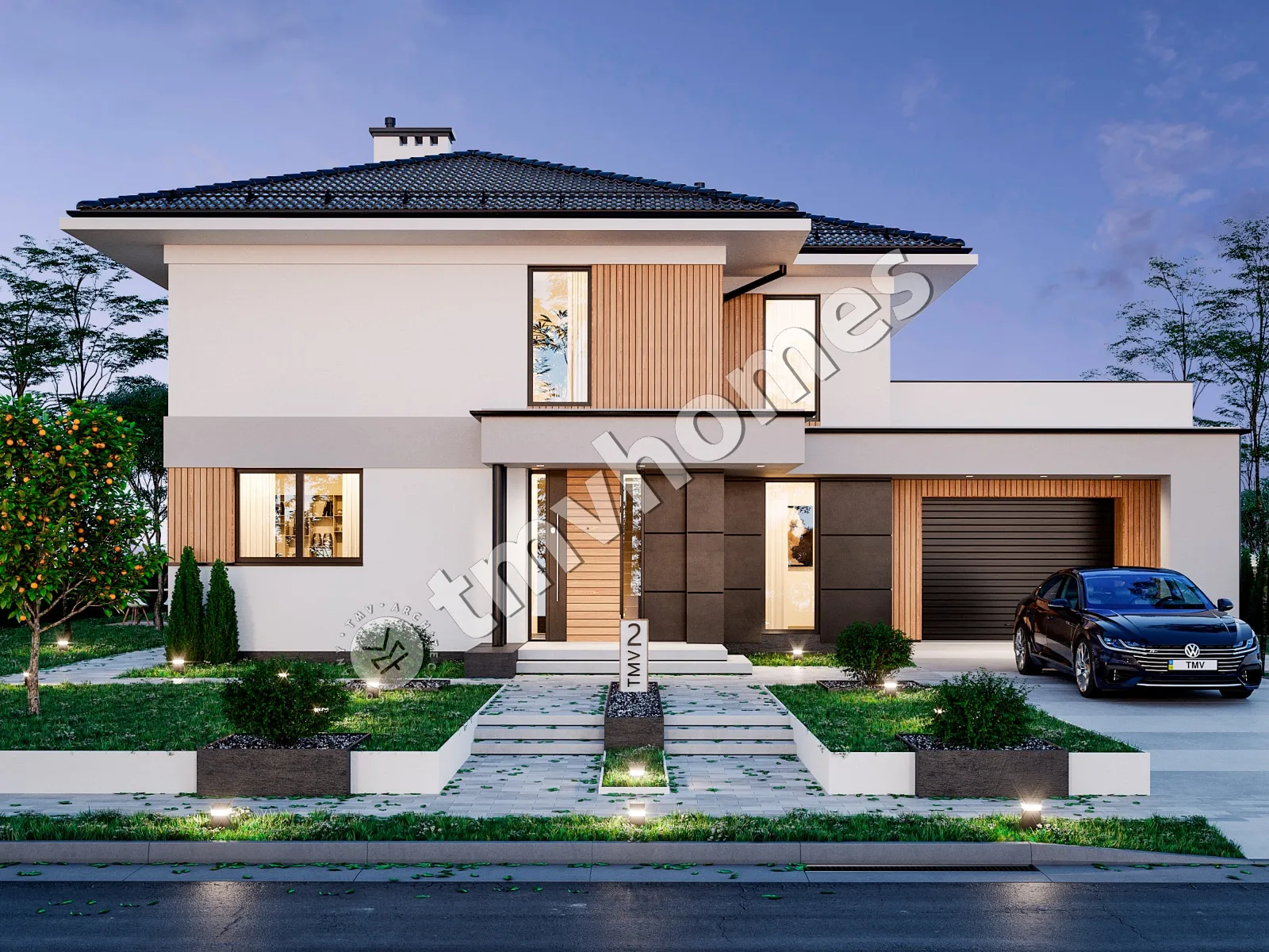 Проект TMV 2 - современный двухэтажный дом со вторым светом, террасами и гаражом для 2 автомобилей. Состав помещений: прихожая, холл, кухня-столовая, гостиная, 3 спальни, 2 санузла, гардеробная, инвентарная, кладовая, котельная.