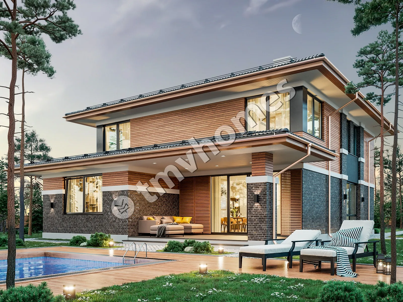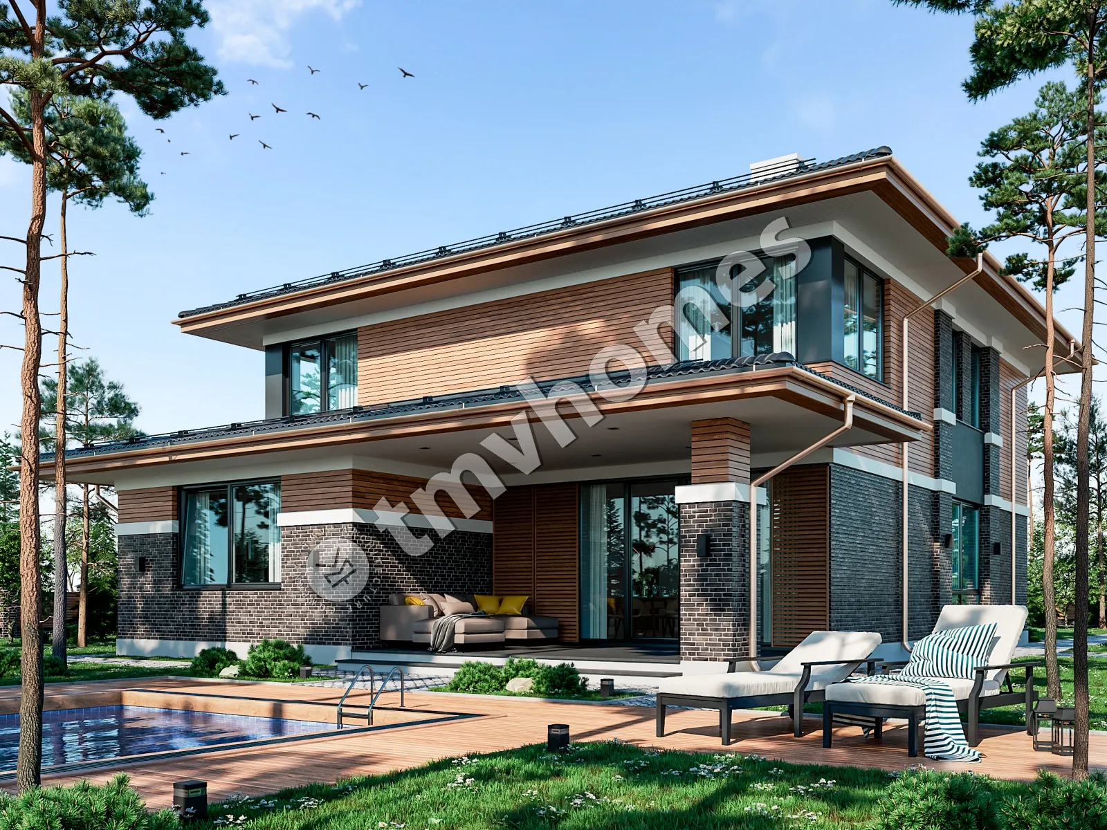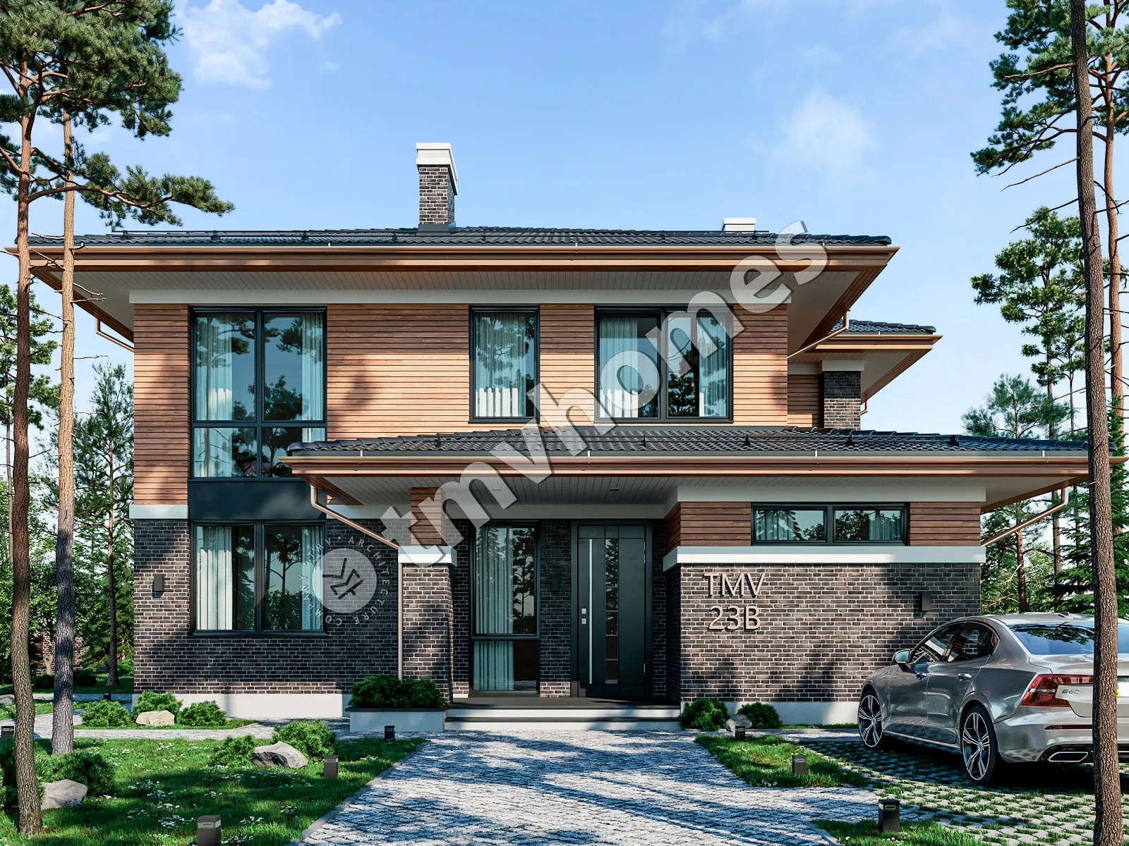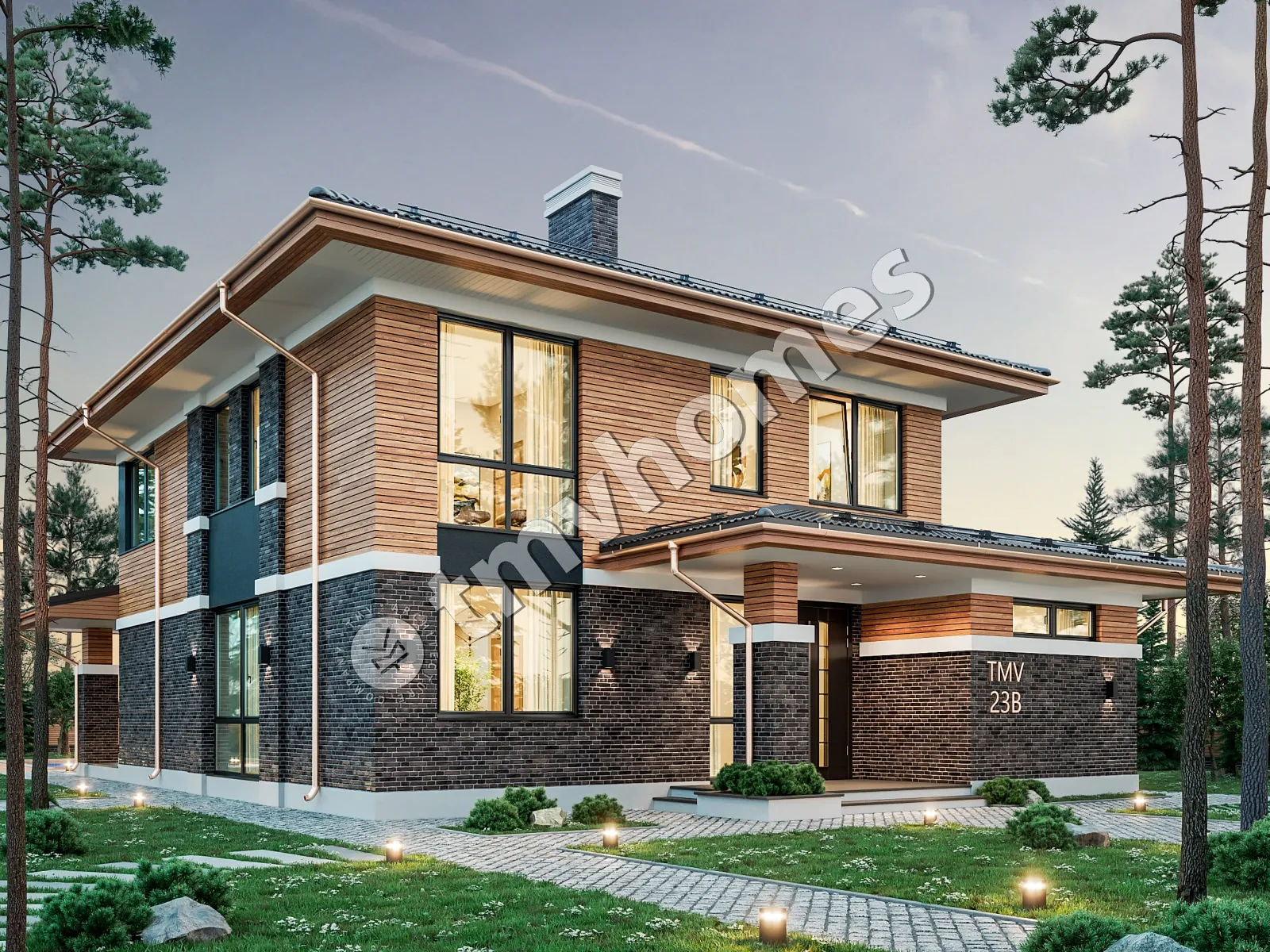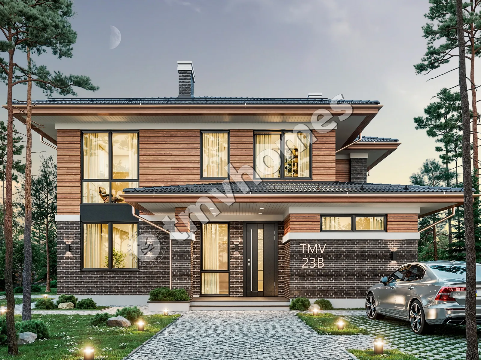 Проект TMV 23B - двухэтажный дом в стиле Райта с террасой. Состав помещений: прихожая, холл, гостиная, кухня-столовая, кабинет, 4 спальни, 3 санузла, постирочная, гардеробная, котельная.