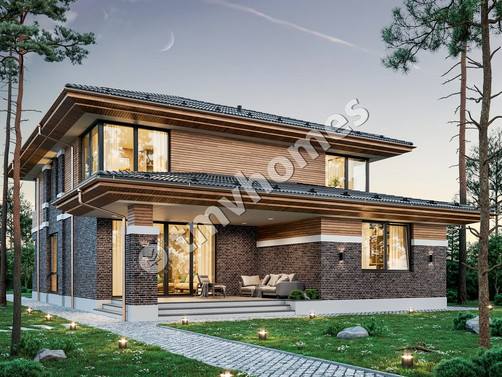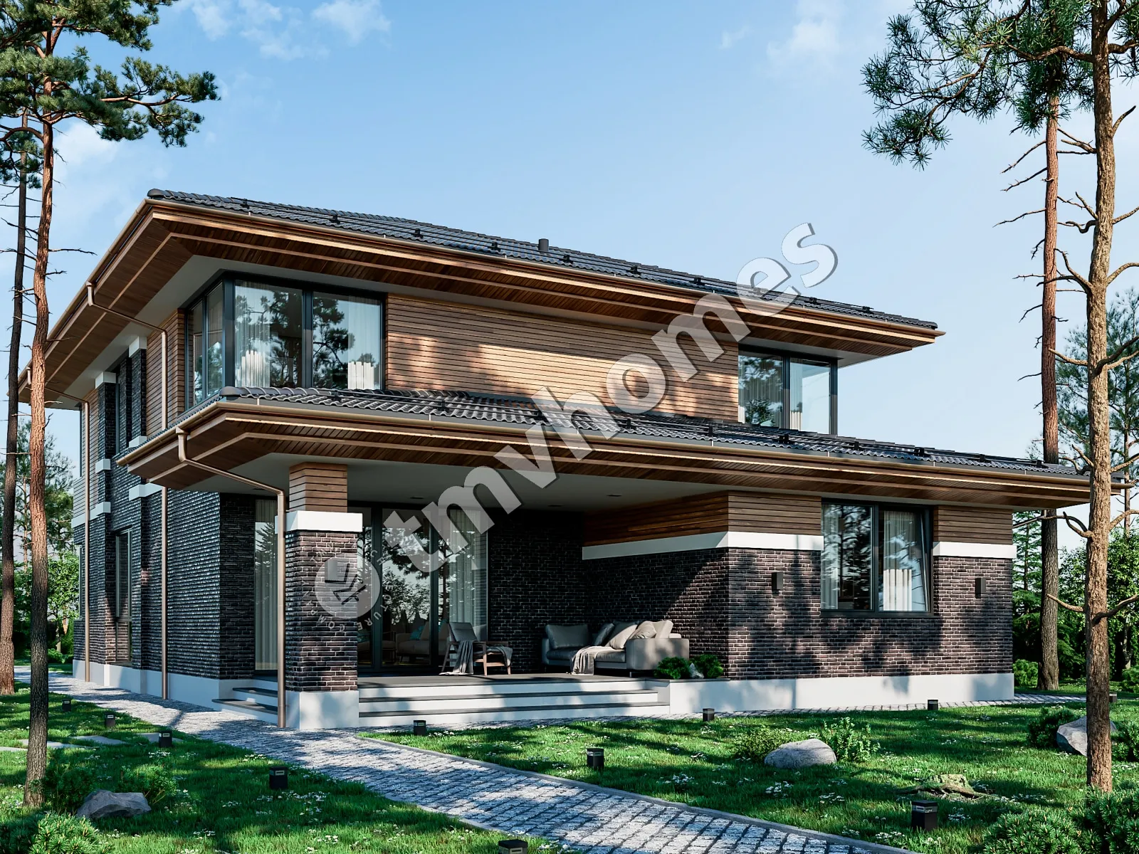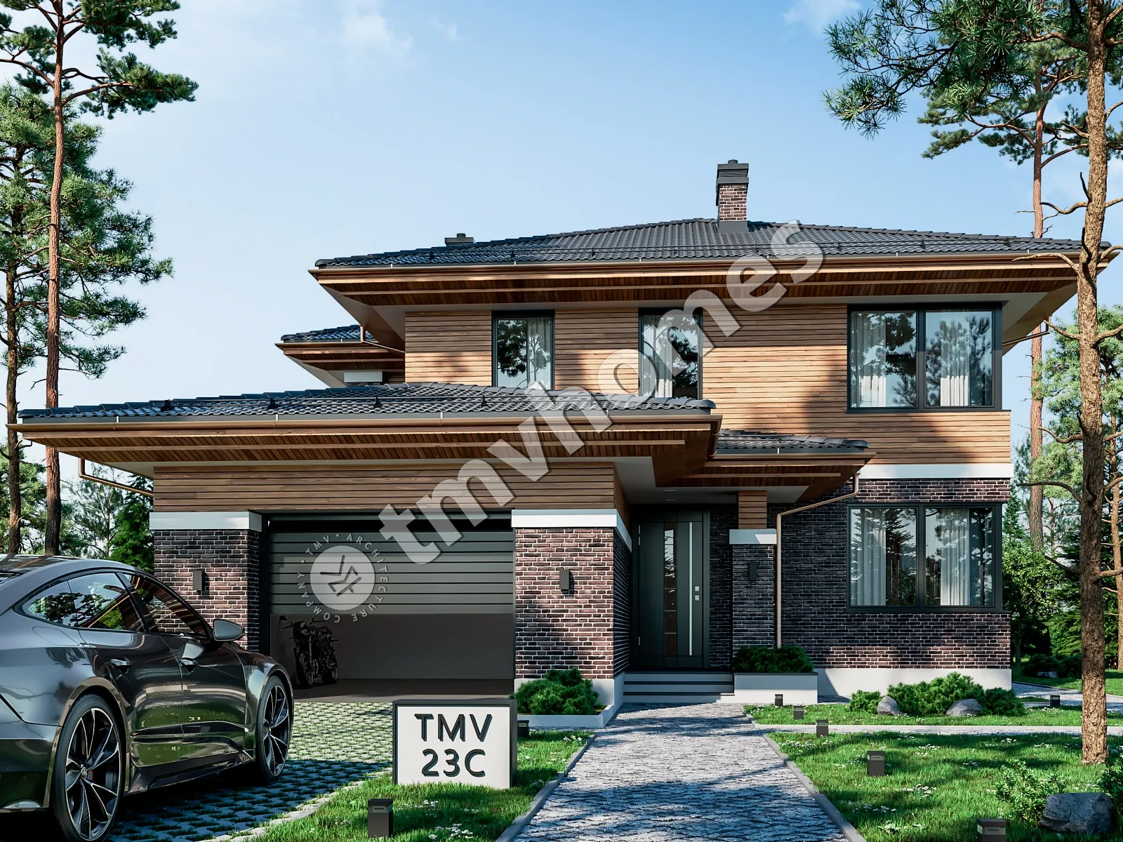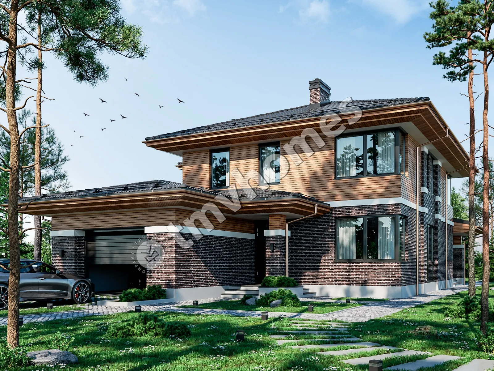 Проект TMV 23C - комфортный двухэтажный дом в стиле Райта с гаражом и террасой. Состав помещений: прихожая, холл, гостиная, кухня-столовая, 4 спальни, 4 санузла, постирочная, гардеробная, котельная.