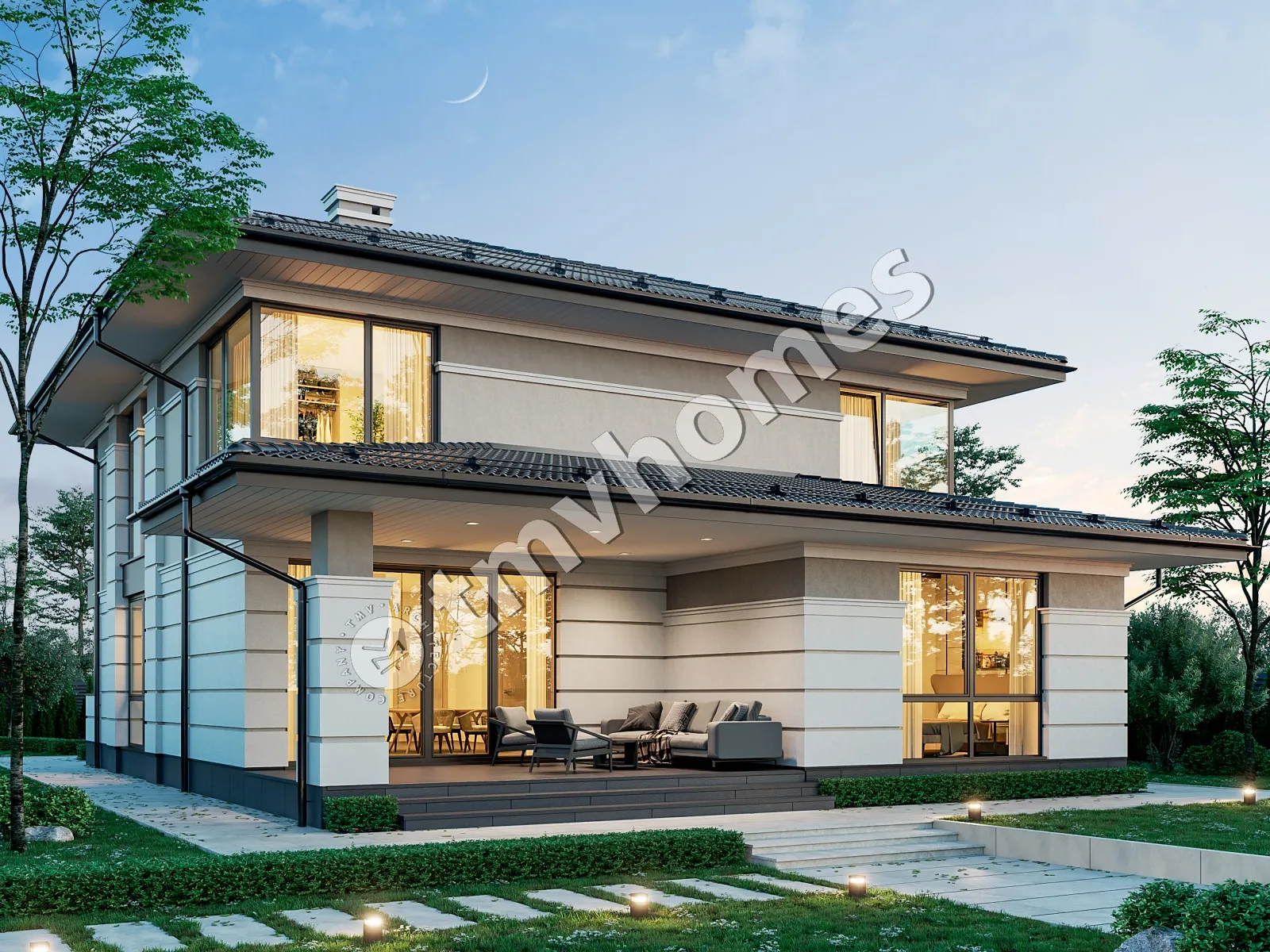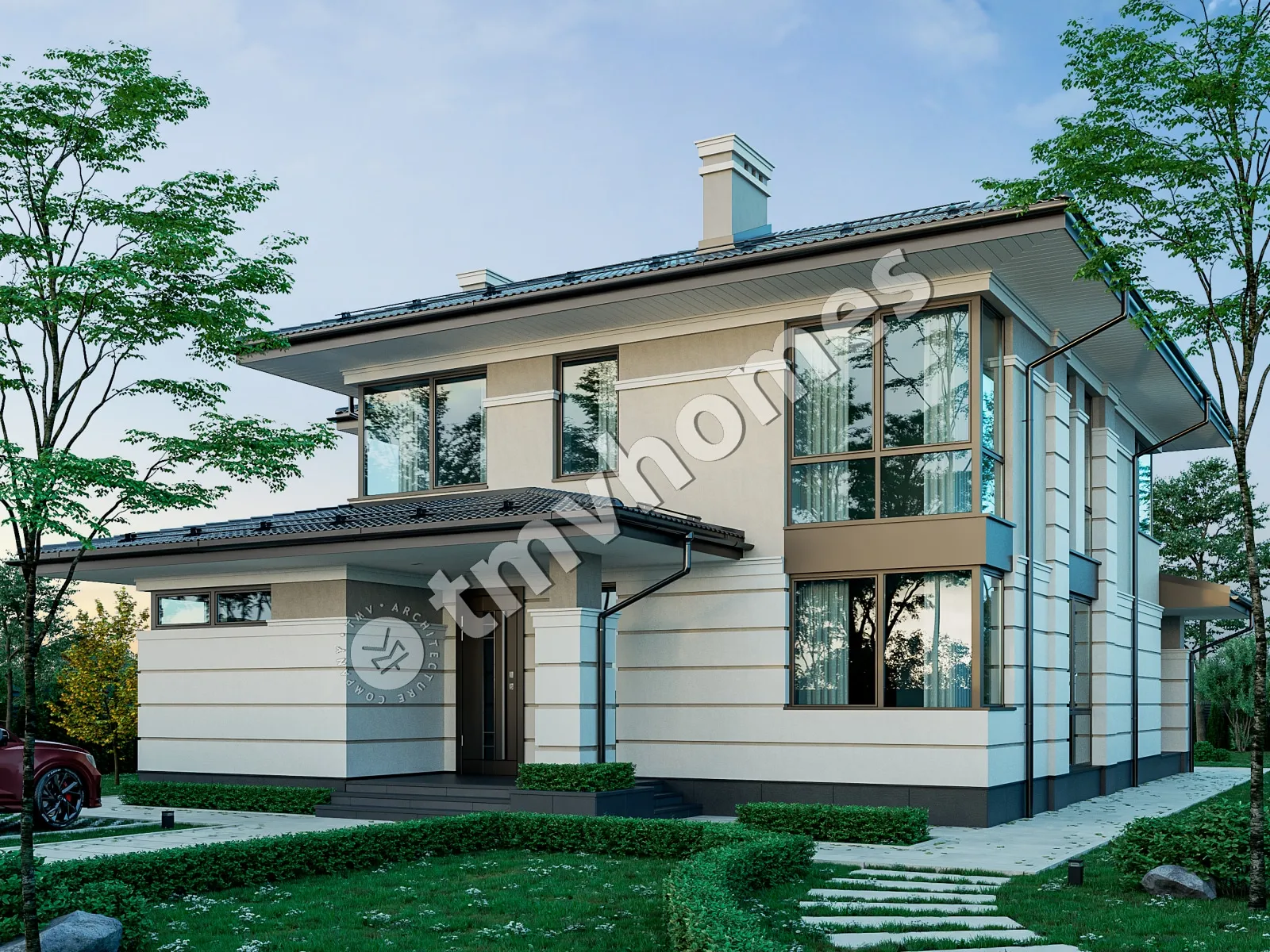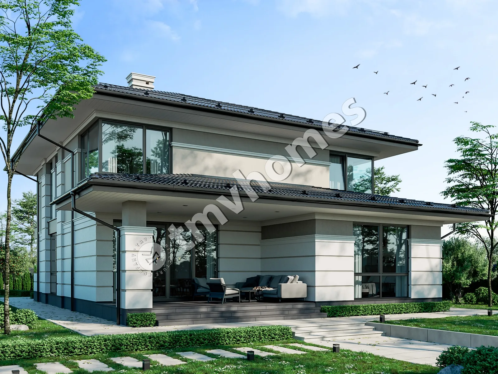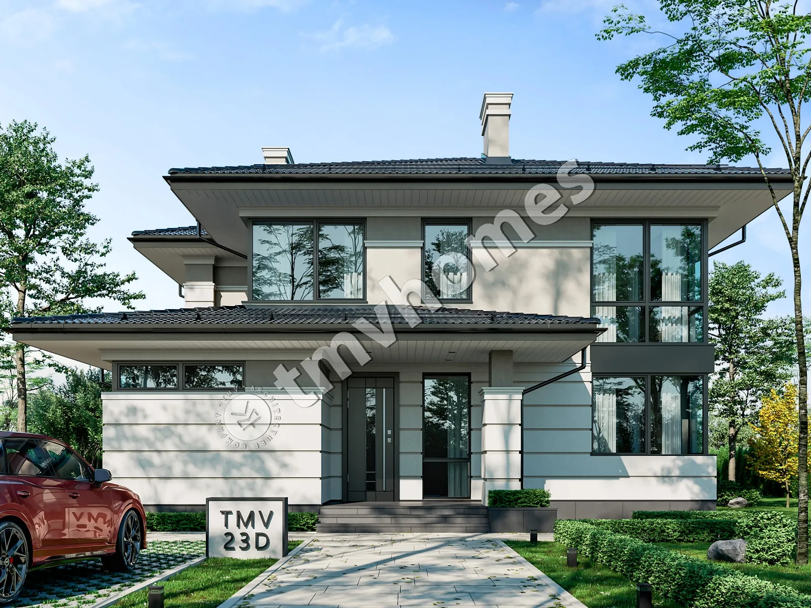 Проект TMV 23D - современный двухэтажный дом в стиле Райта с террасой. Состав помещений: прихожая, холл, гостиная, кухня-столовая, кабинет, 4 спальни, 3 санузла, прачечная, гардеробная, котельная.