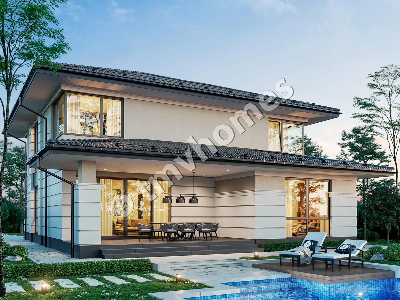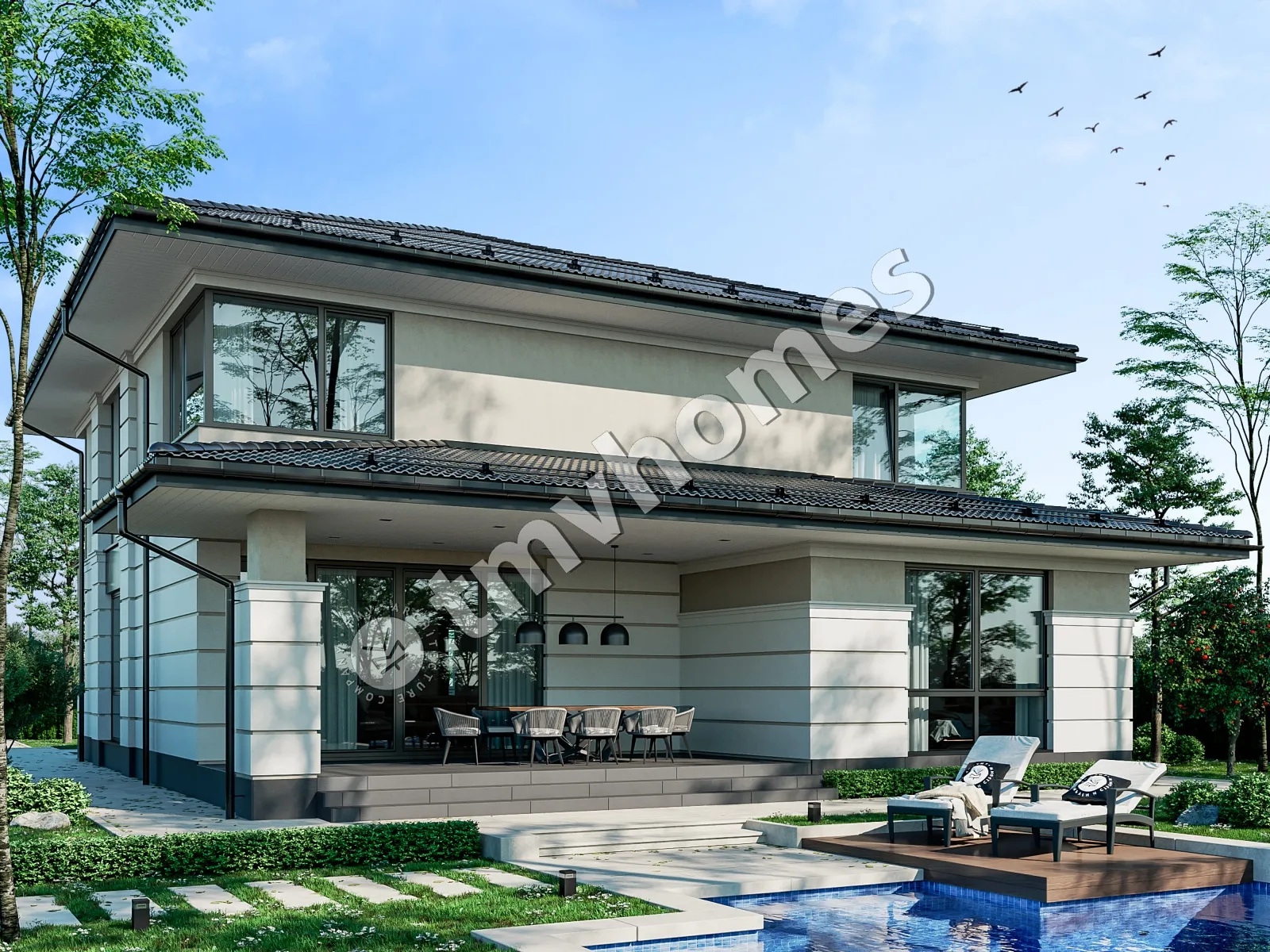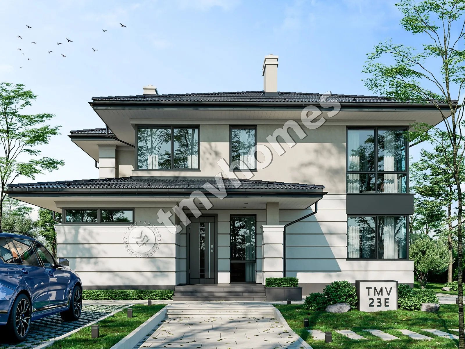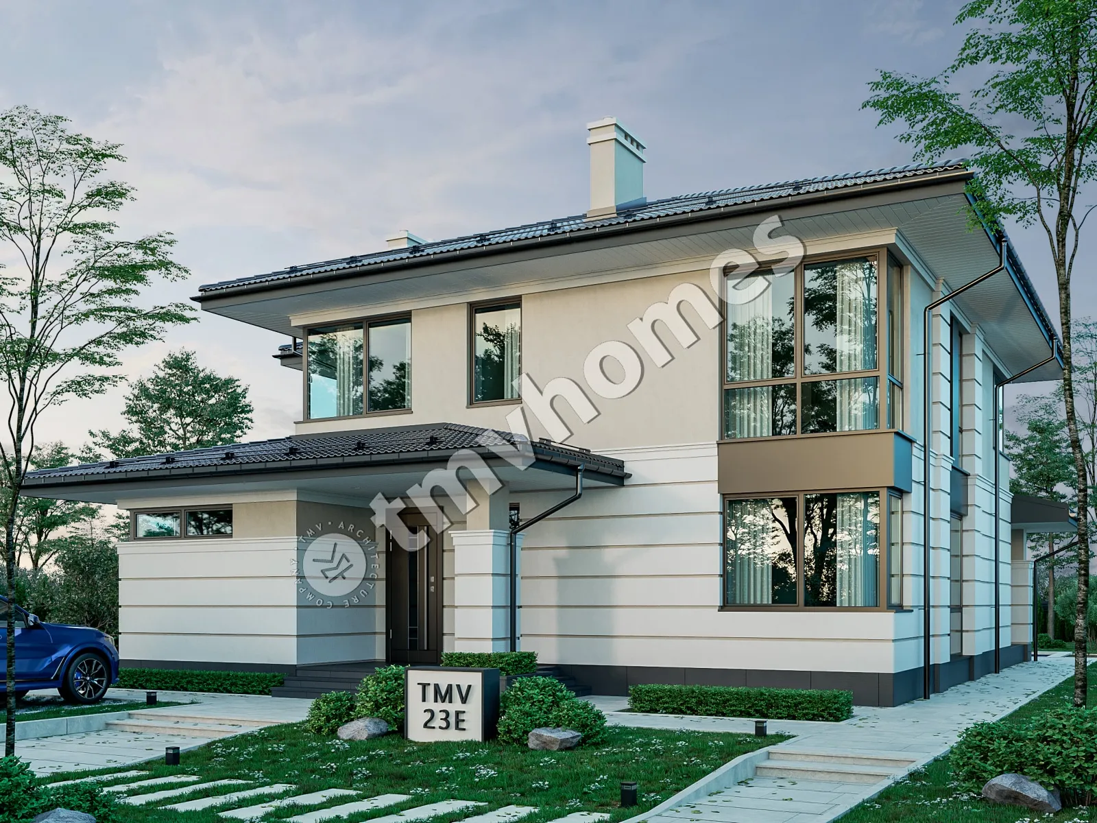 Проект TMV 23E - современный двухэтажный дом в стиле Райта с террасой. Состав помещений: прихожая, холл, гостиная, кухня-столовая, кабинет, 4 спальни, 3 санузла, прачечная, гардеробная, котельная.