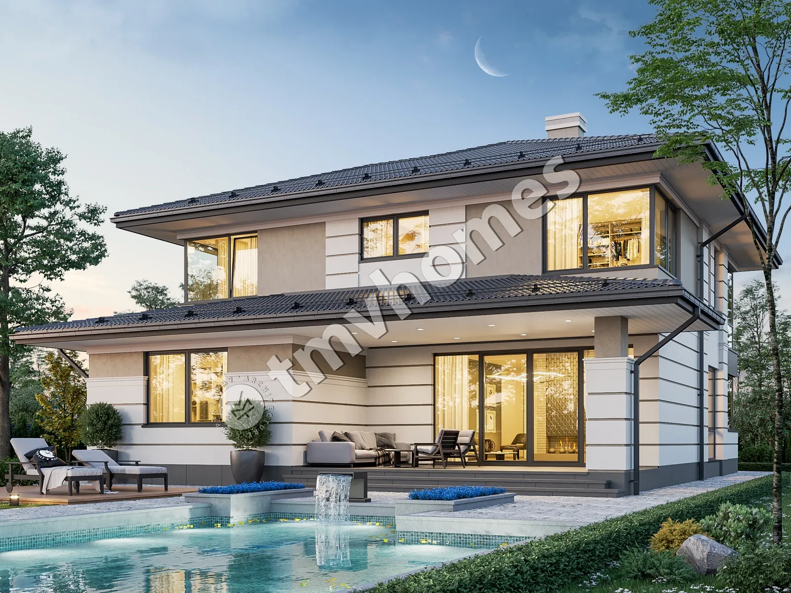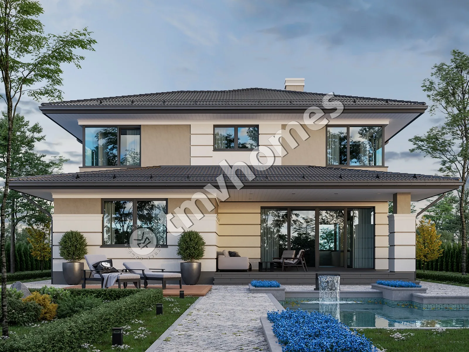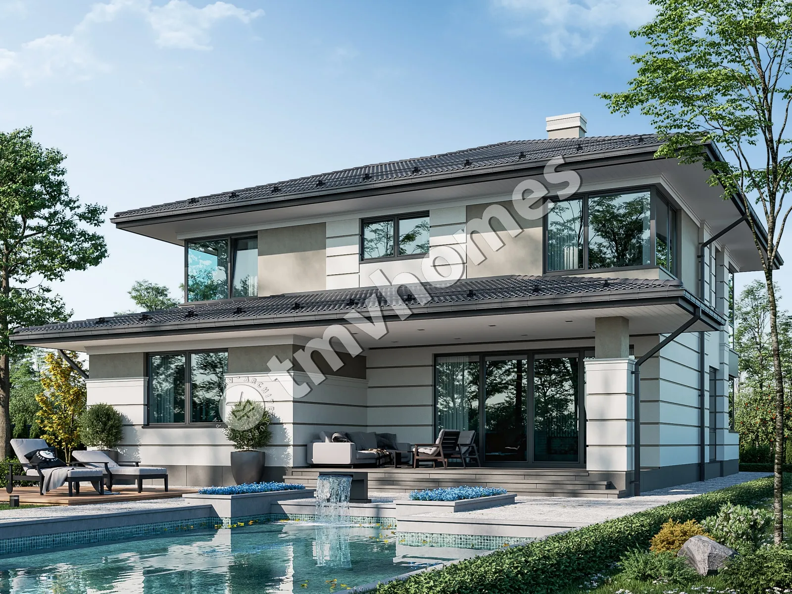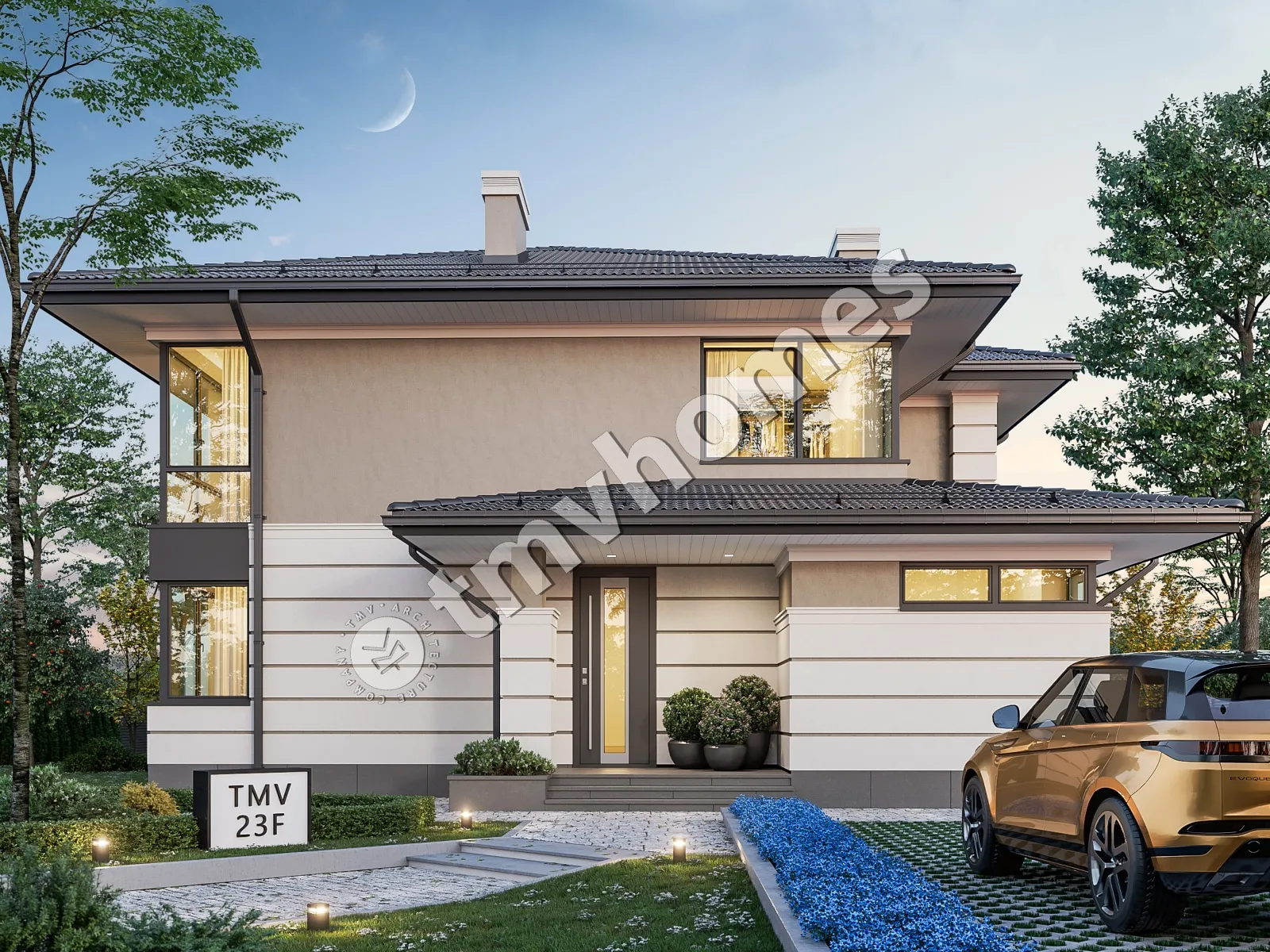 Проект TMV 23F - современный двухэтажный дом в стиле Райта с террасой. Состав помещений: прихожая, холл, гостиная, кухня-столовая, кабинет, 4 спальни, 3 санузла, прачечная, гардеробная, кладовая, котельная.