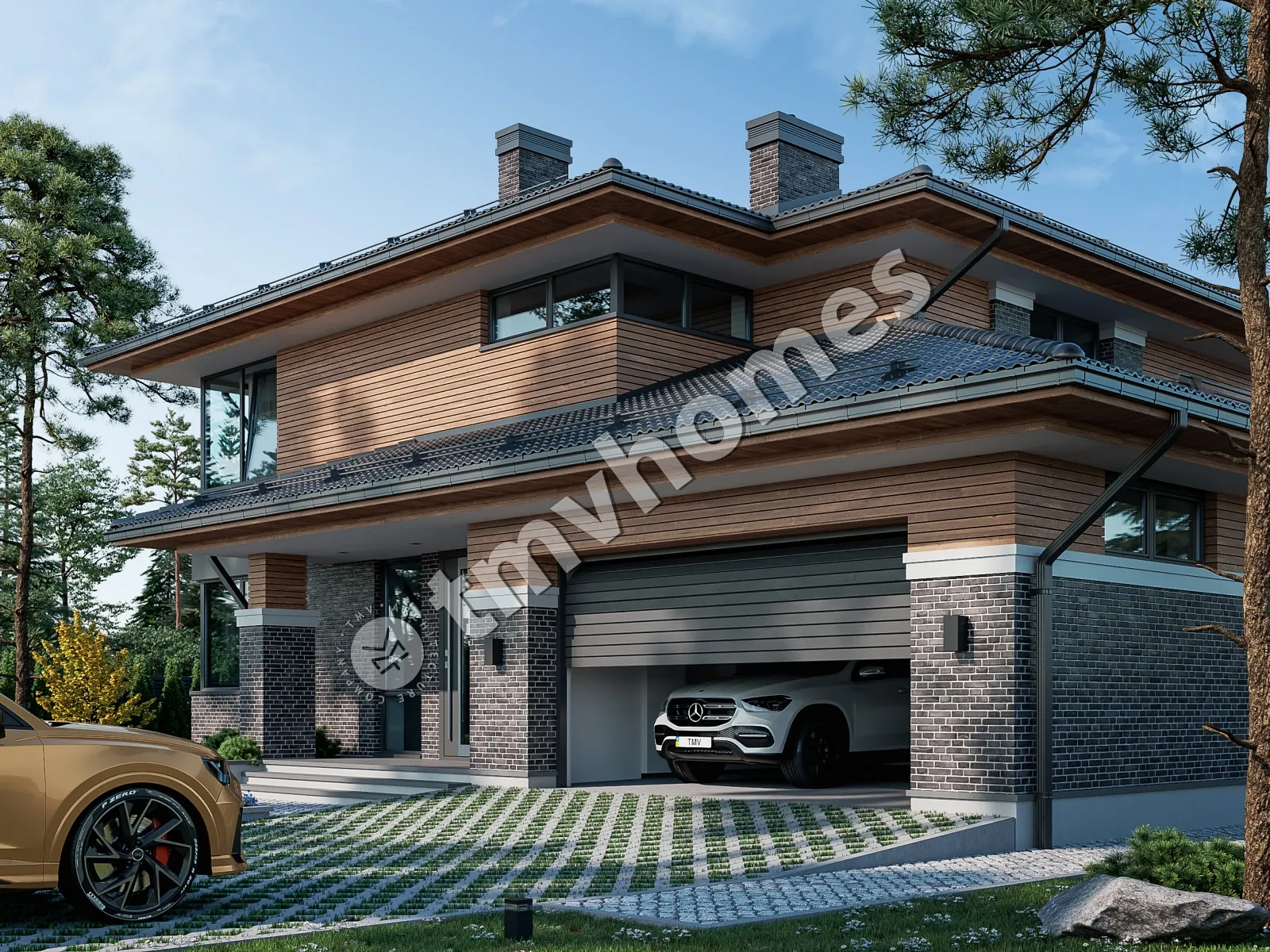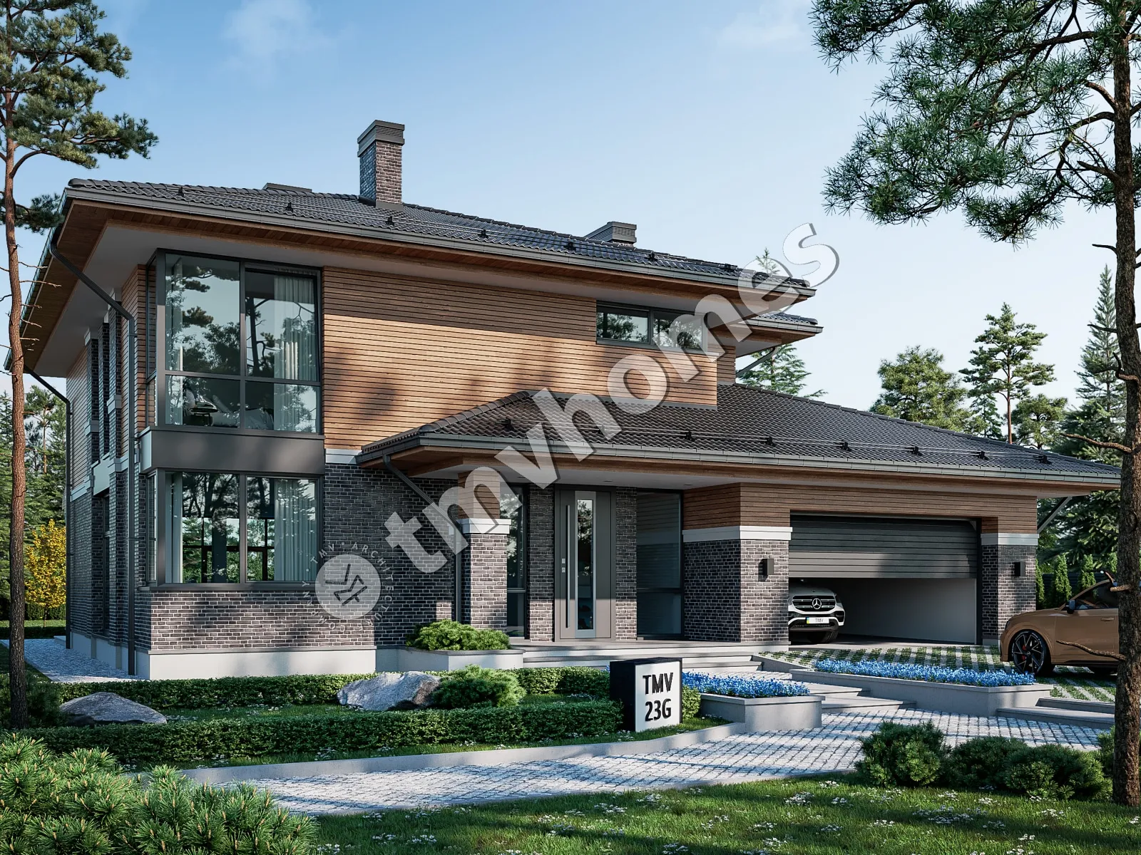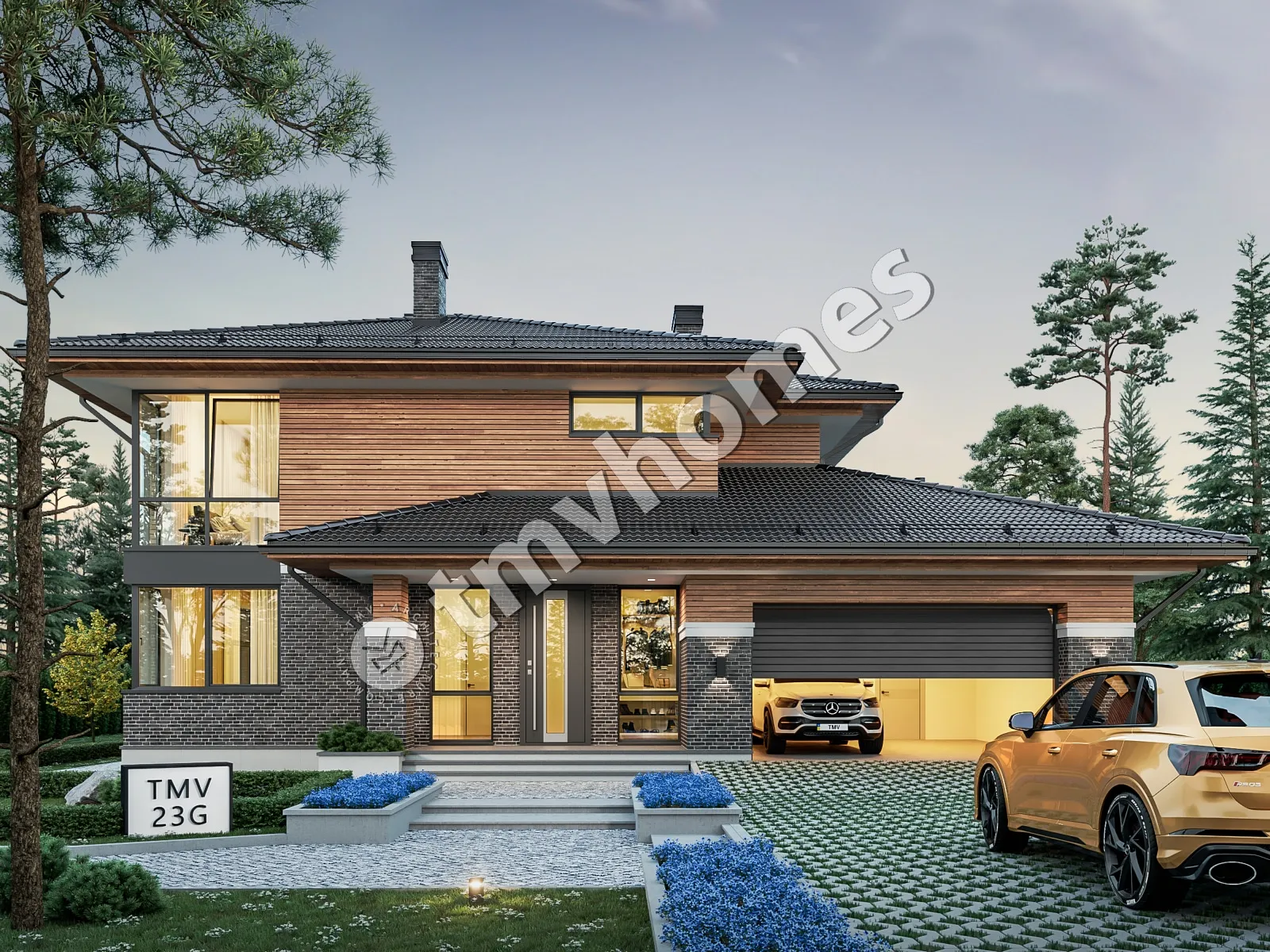 Проект TMV 23G - комфортный двухэтажный дом в стиле Райта c гаражом для 2 автомобилей и террасой. Состав помещений: прихожая, холл, кухня-столовая, гостиная, 4 спальни, 3 санузла, гардеробная, кладовая, котельная.