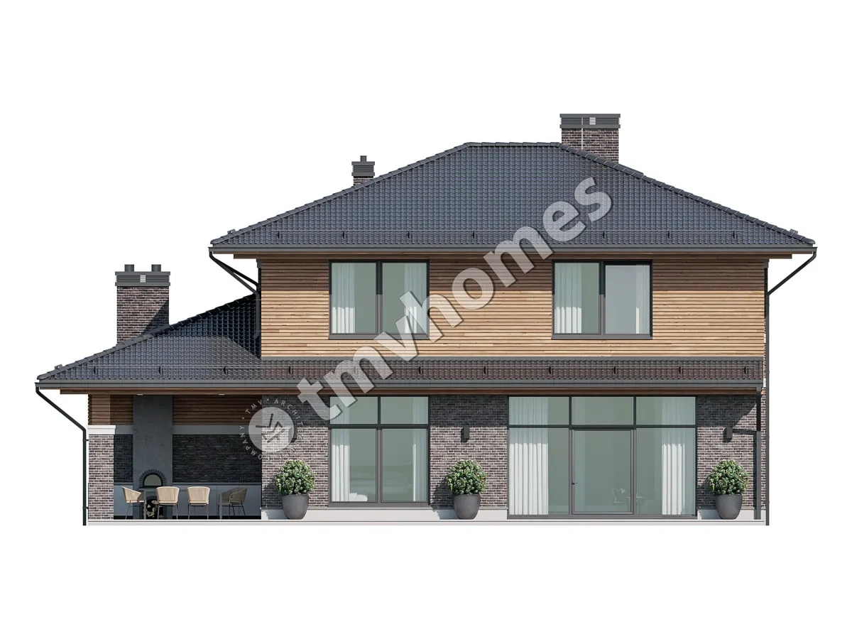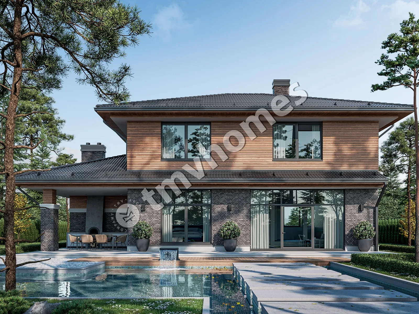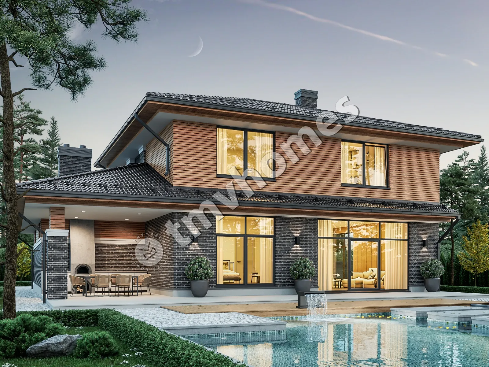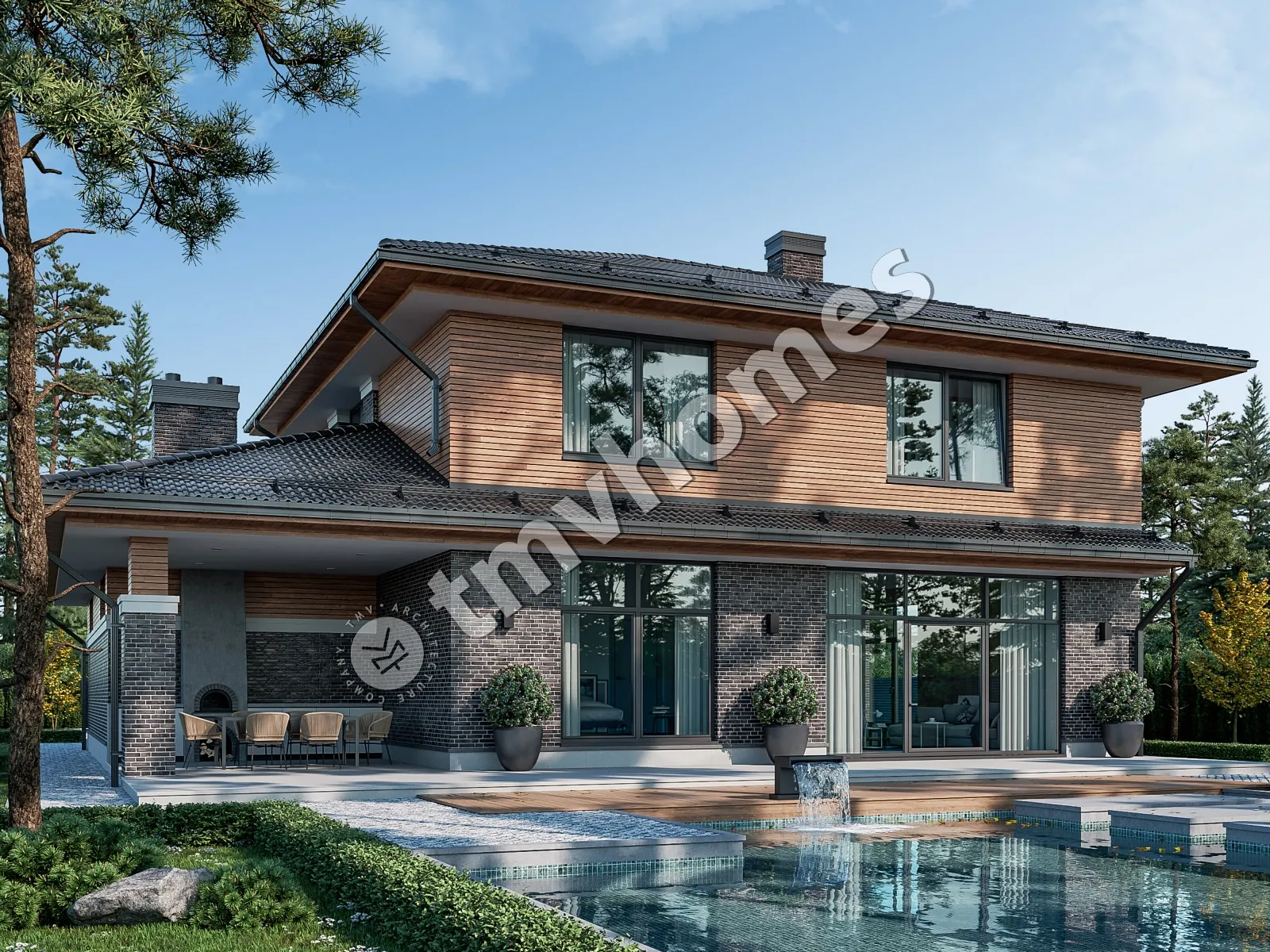 Проект TMV 23G - комфортный двухэтажный дом в стиле Райта c гаражом для 2 автомобилей и террасой. Состав помещений: прихожая, холл, кухня-столовая, гостиная, 4 спальни, 3 санузла, гардеробная, кладовая, котельная.