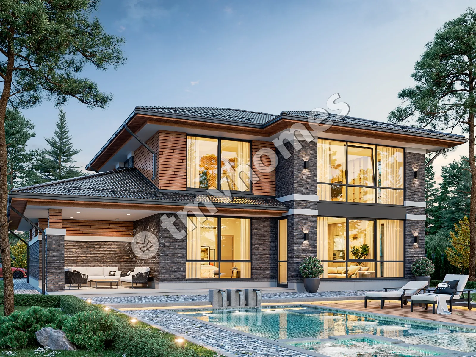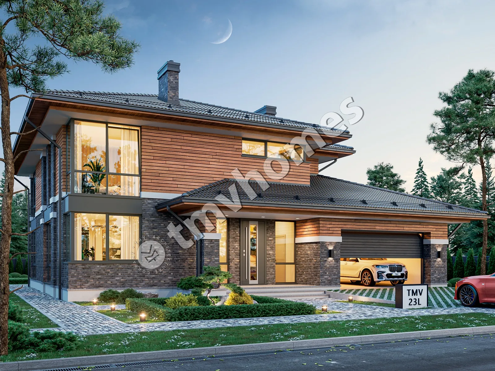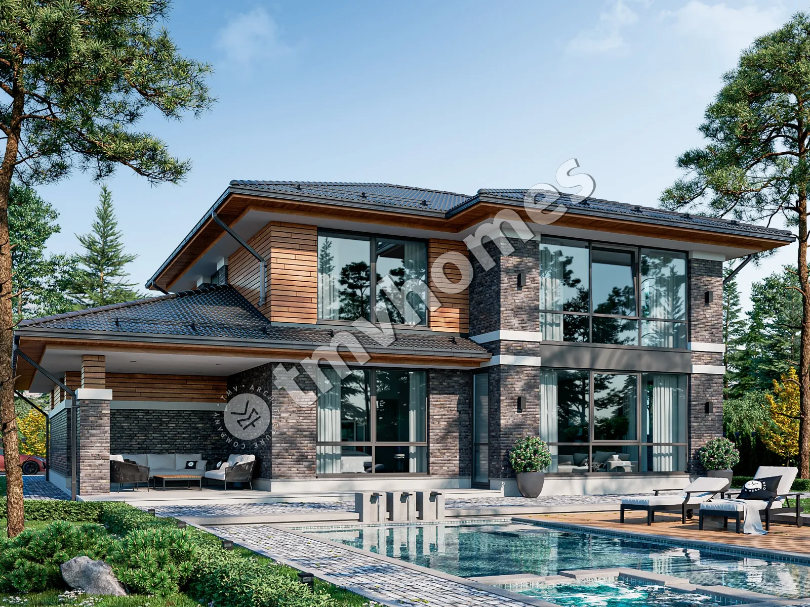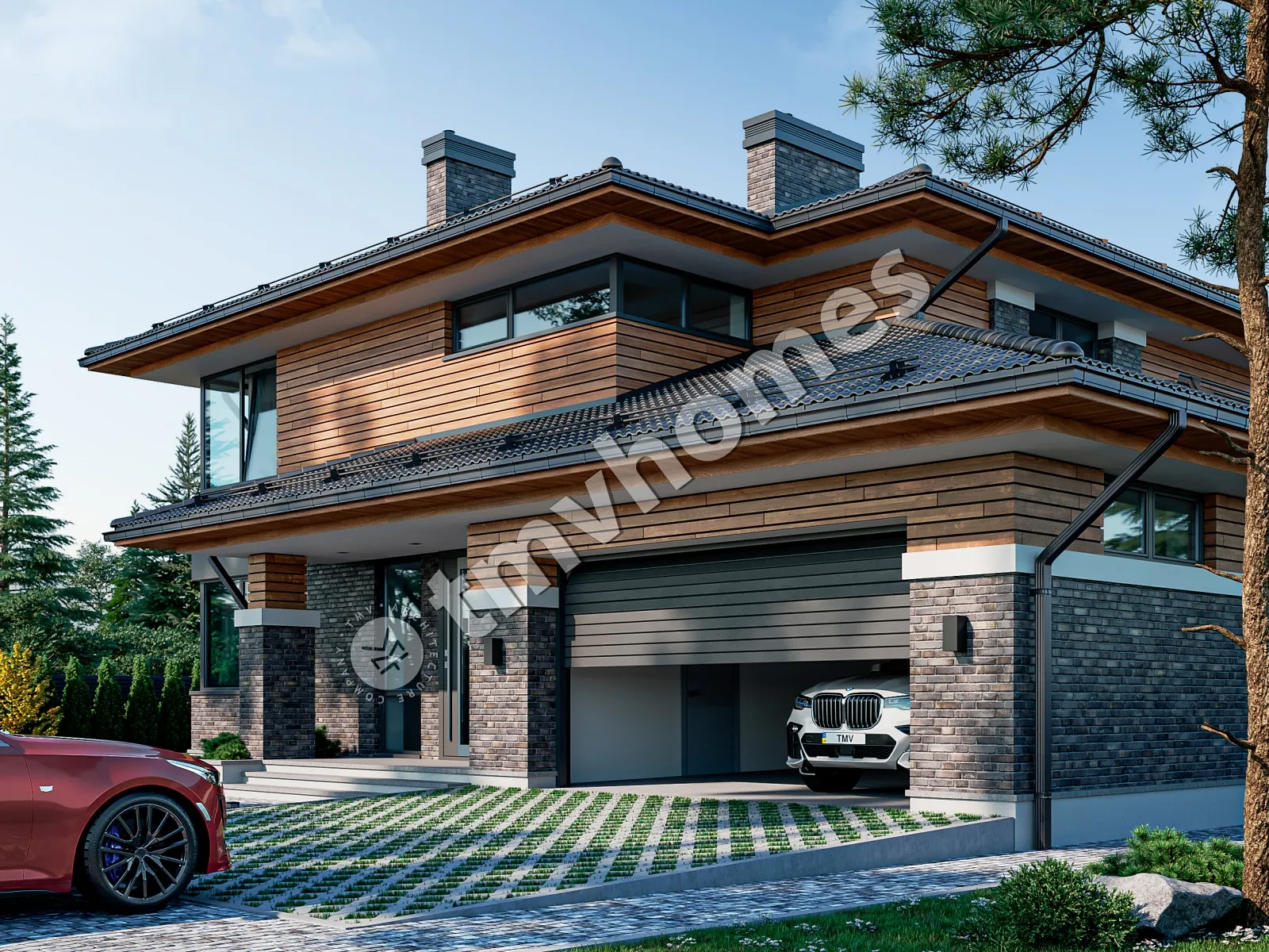 Комфортный двухэтажный дом в стиле Райта c гаражом для 2 автомобилей и террасой. Состав помещений: прихожая, холл, кухня-столовая, гостиная, 4 спальни, 3 санузла, постирочная, гардеробная, котельная.