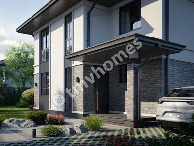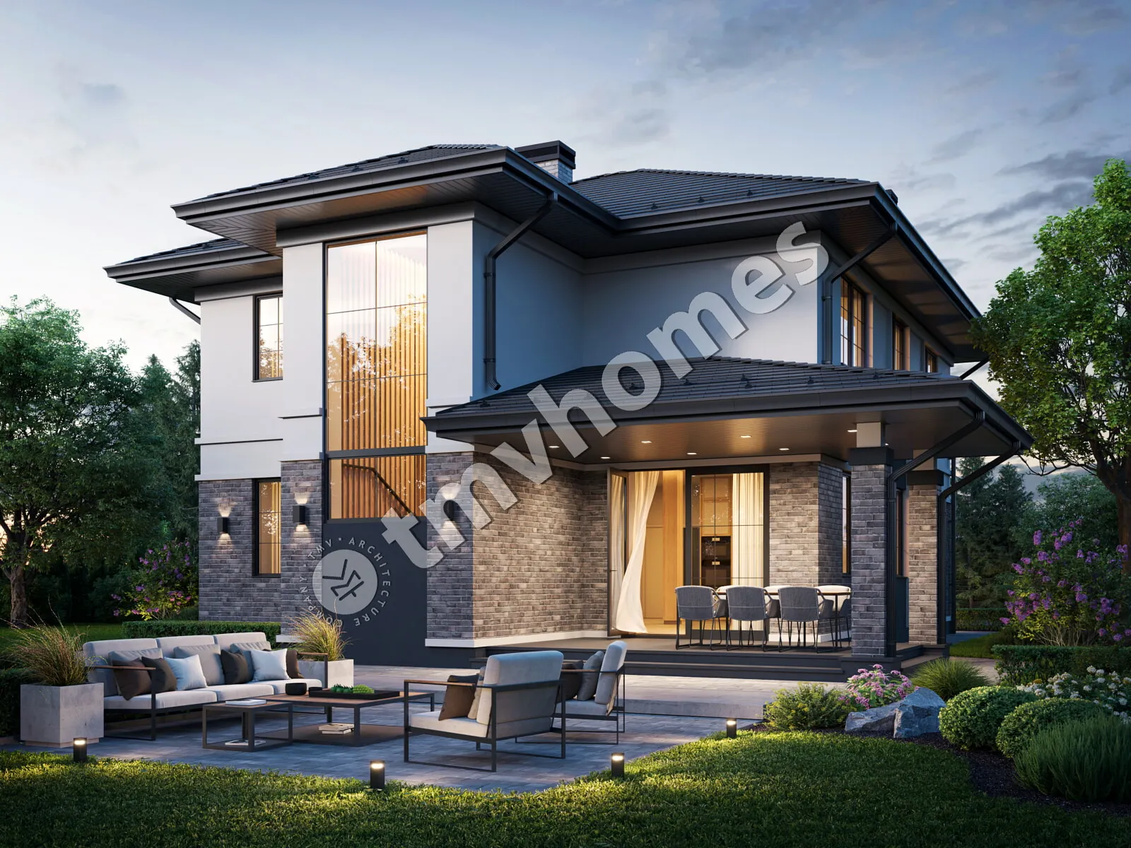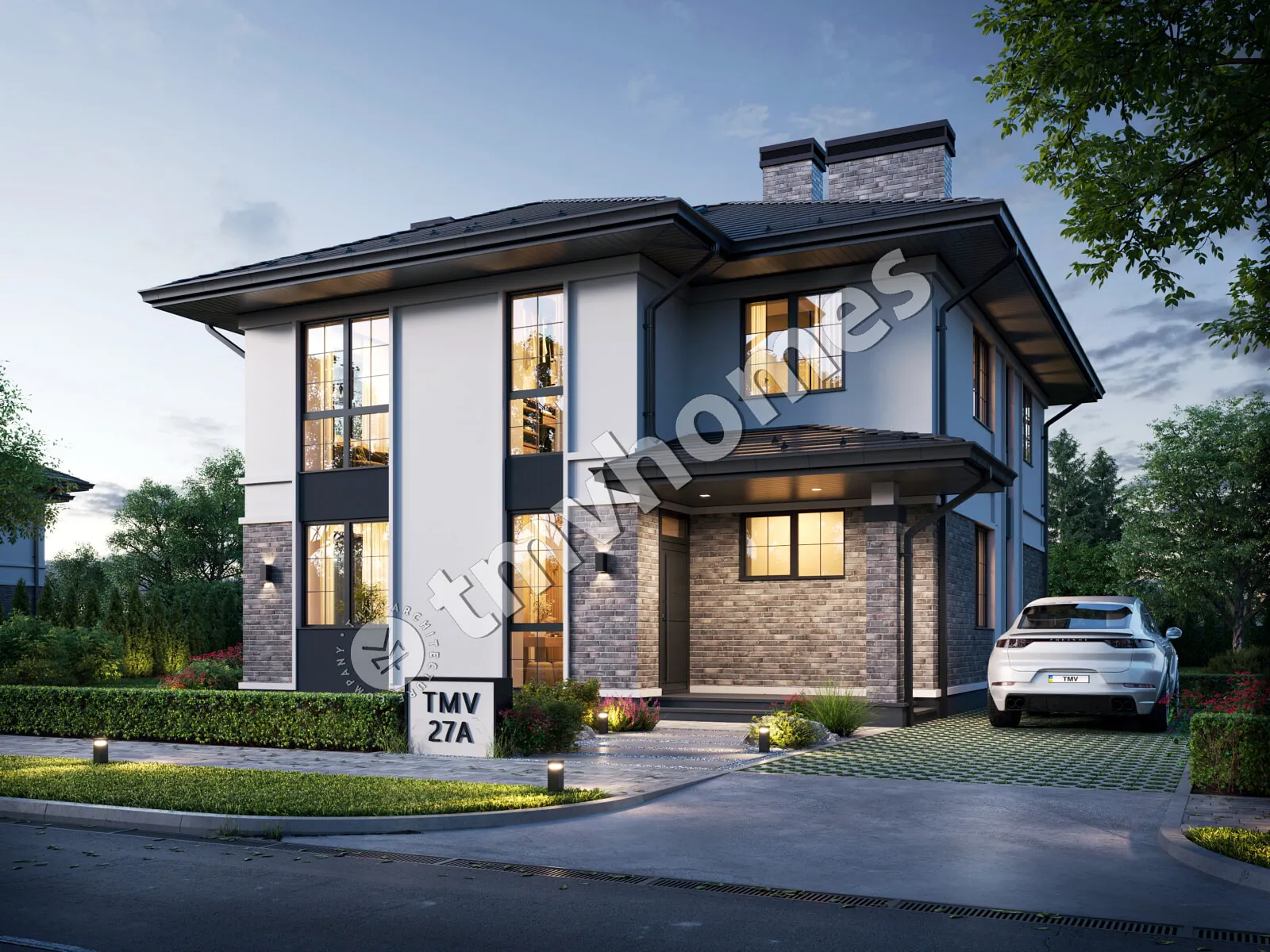 Проект TMV 27A - современный двухэтажный дом с удобной планировкой и крытой террасой. Состав помещений: прихожая, холл, кухня-гостиная, 4 спальни, 3 санузла, гардеробная, кладовая, котельная.