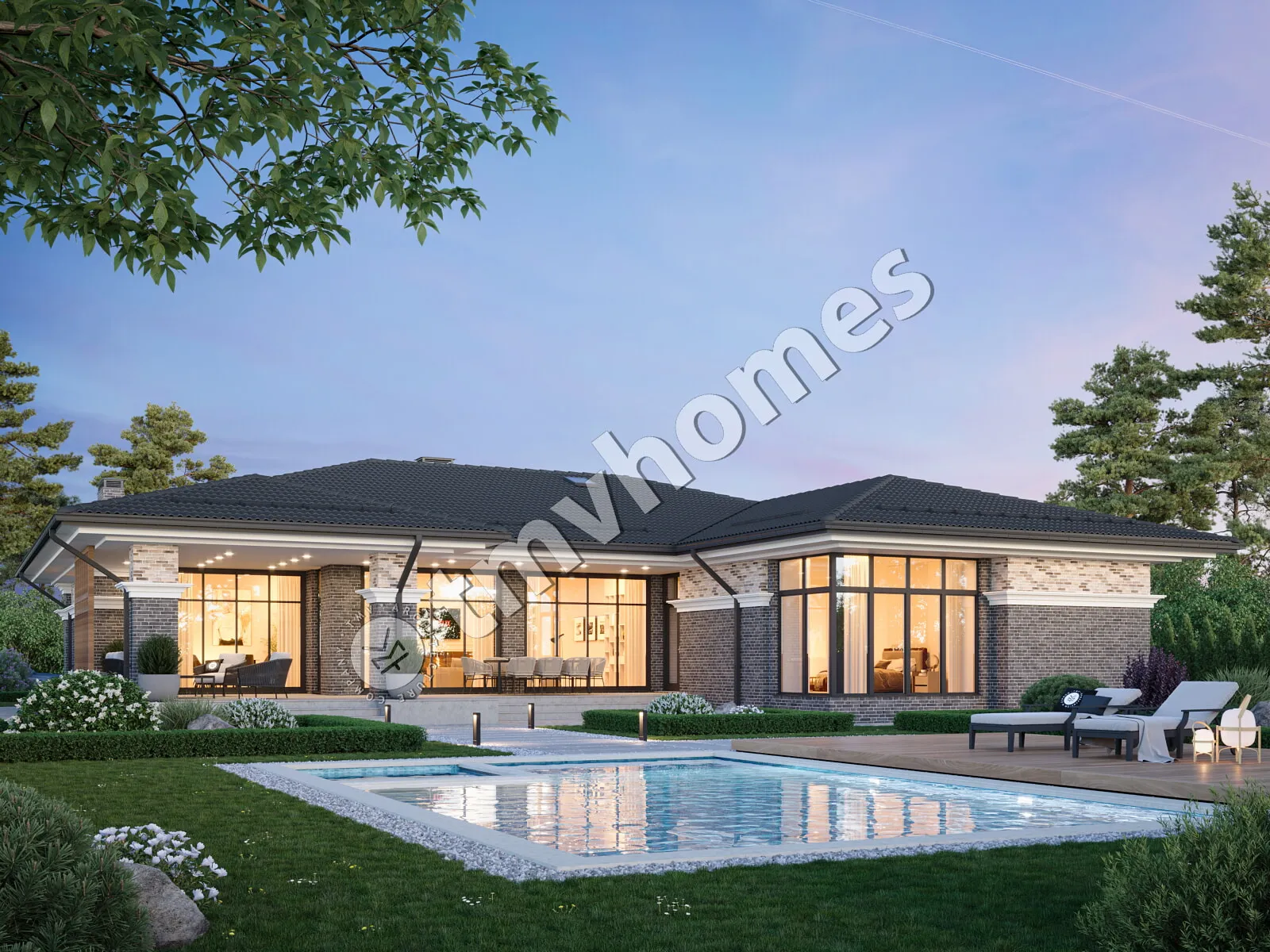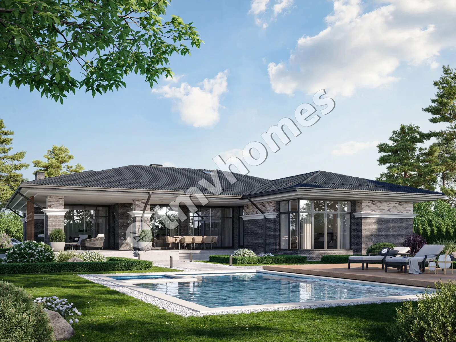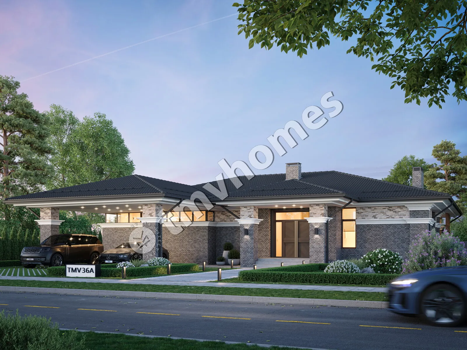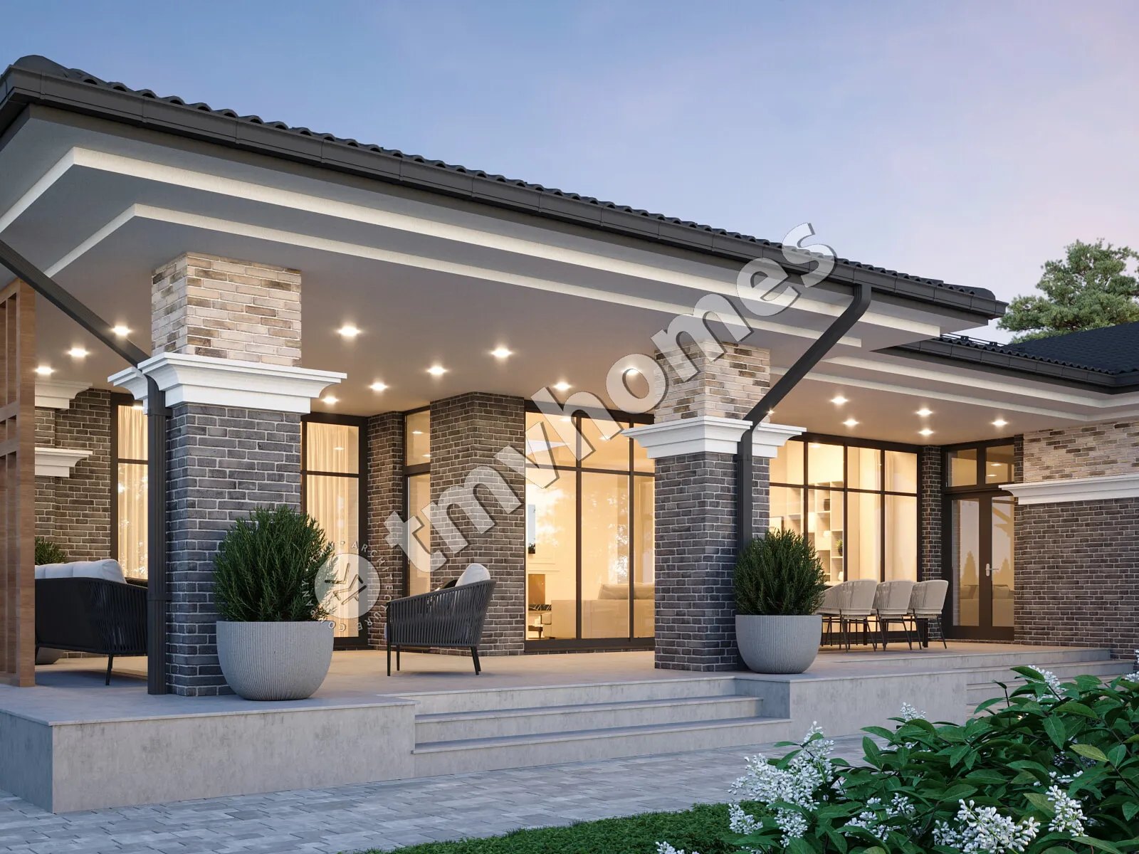 Проект TMV 36A - одноэтажный дом в стиле Райта c панорамными окнами, просторной террасой и навесом для 2 автомобилей. Состав помещений: прихожая, гостиная, кухня-столовая, 3 спальни, 3 санузла, гардеробная, кладовая, котельная.