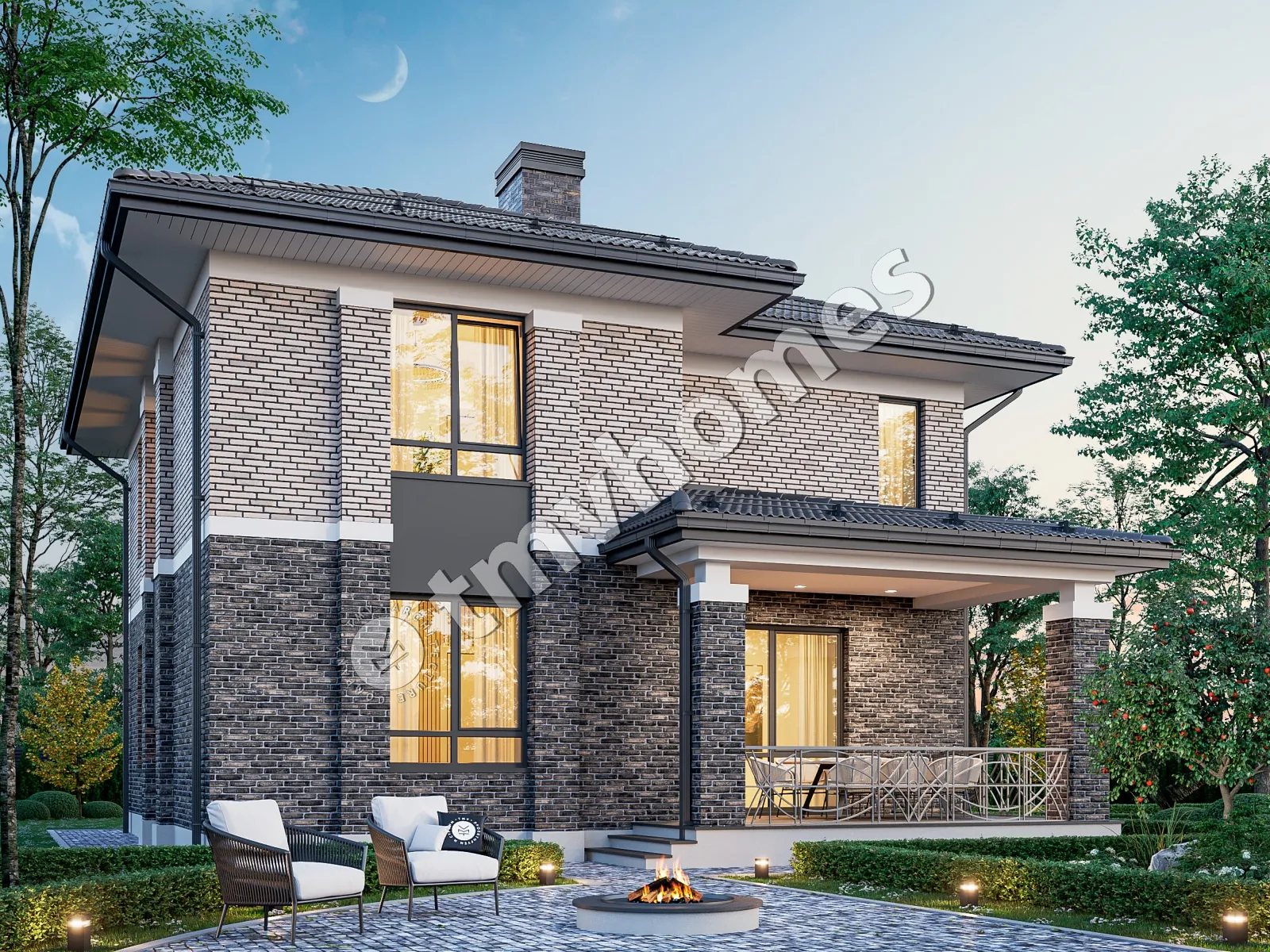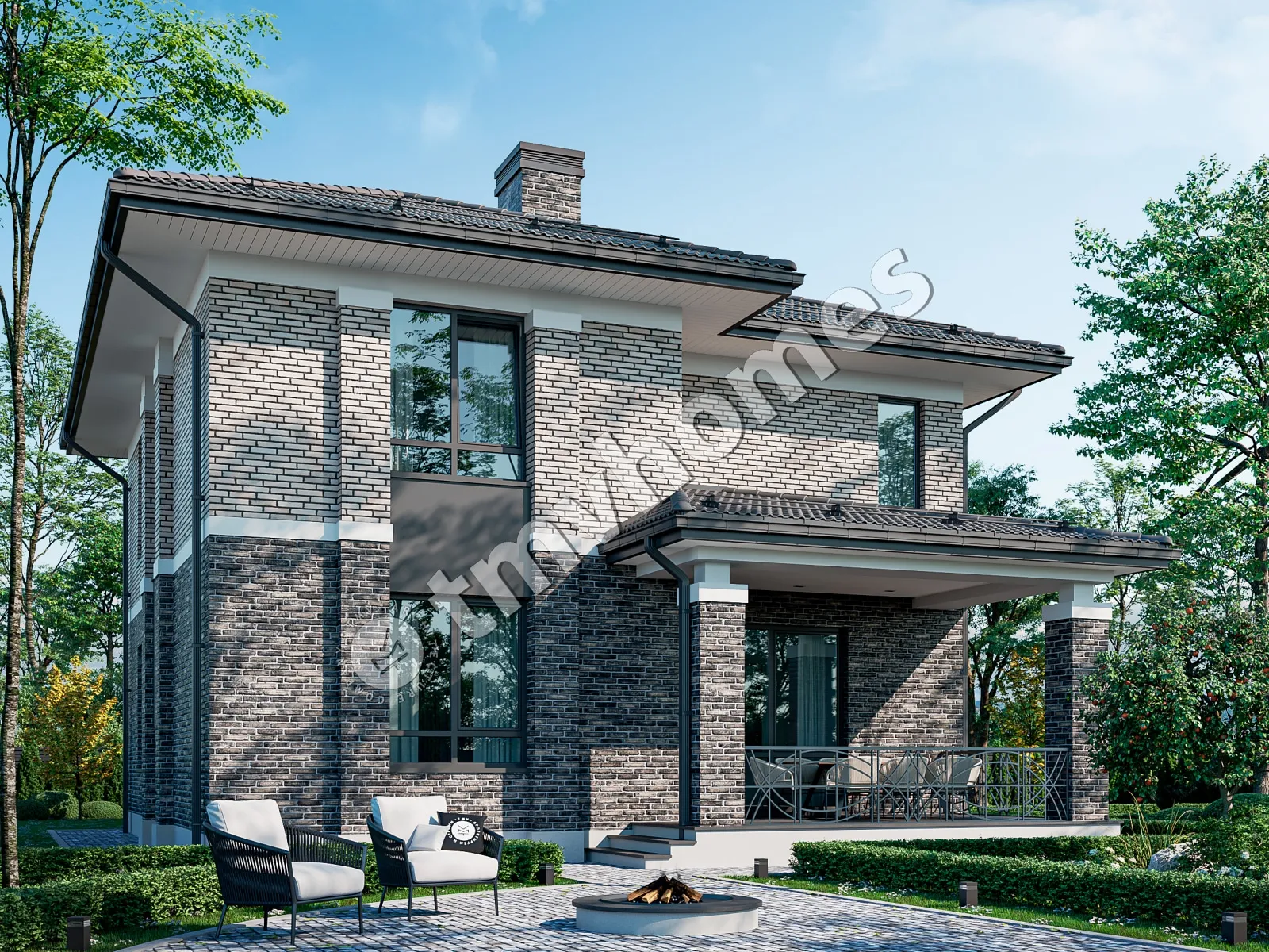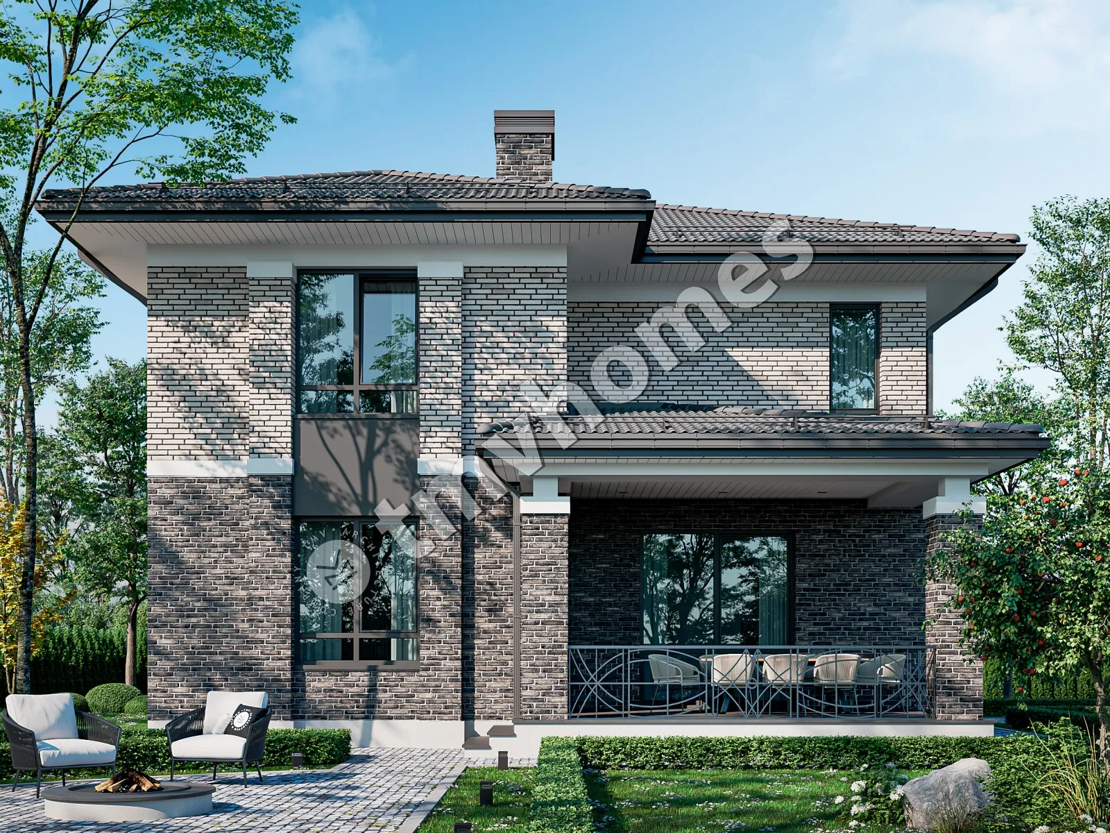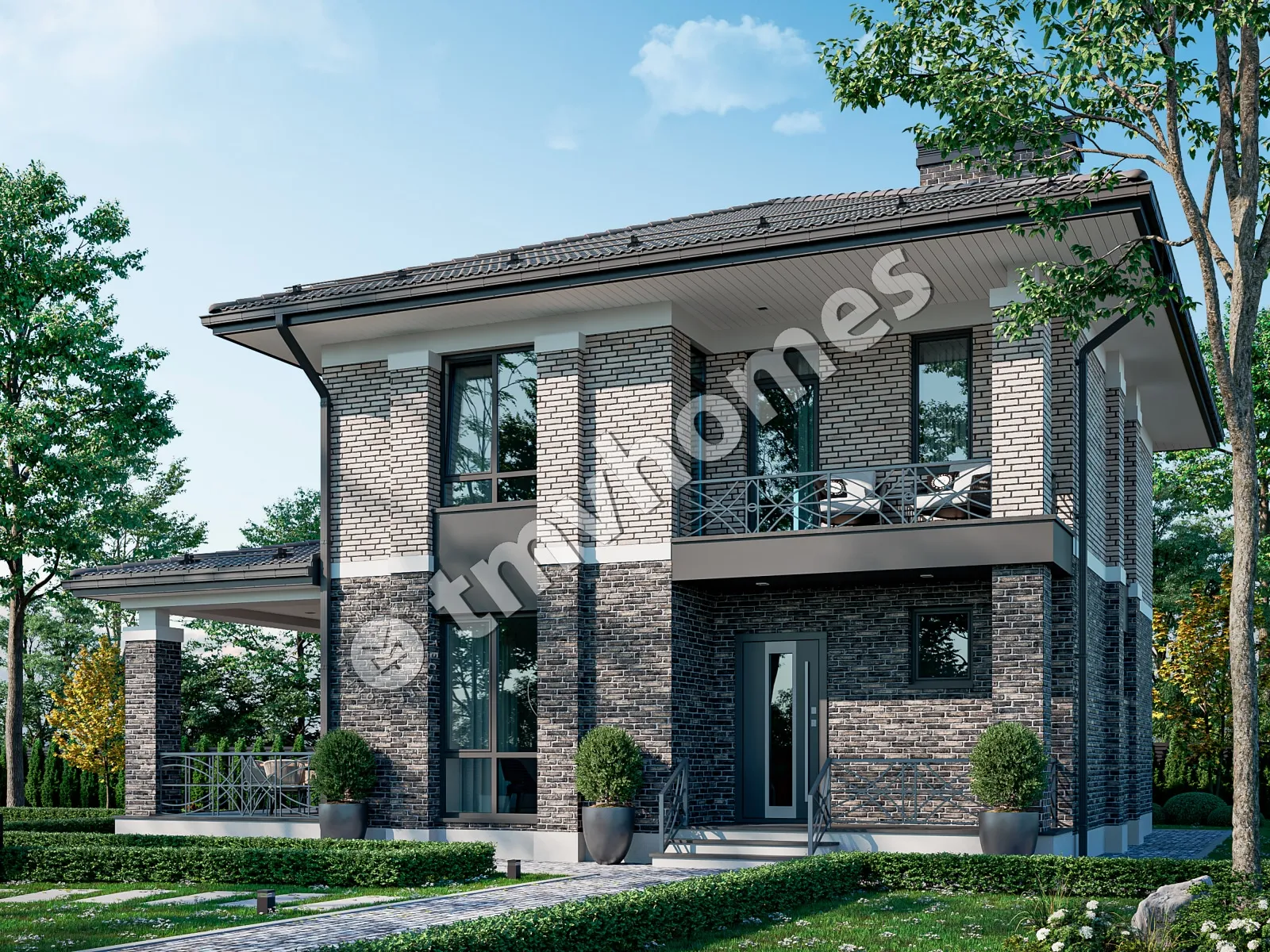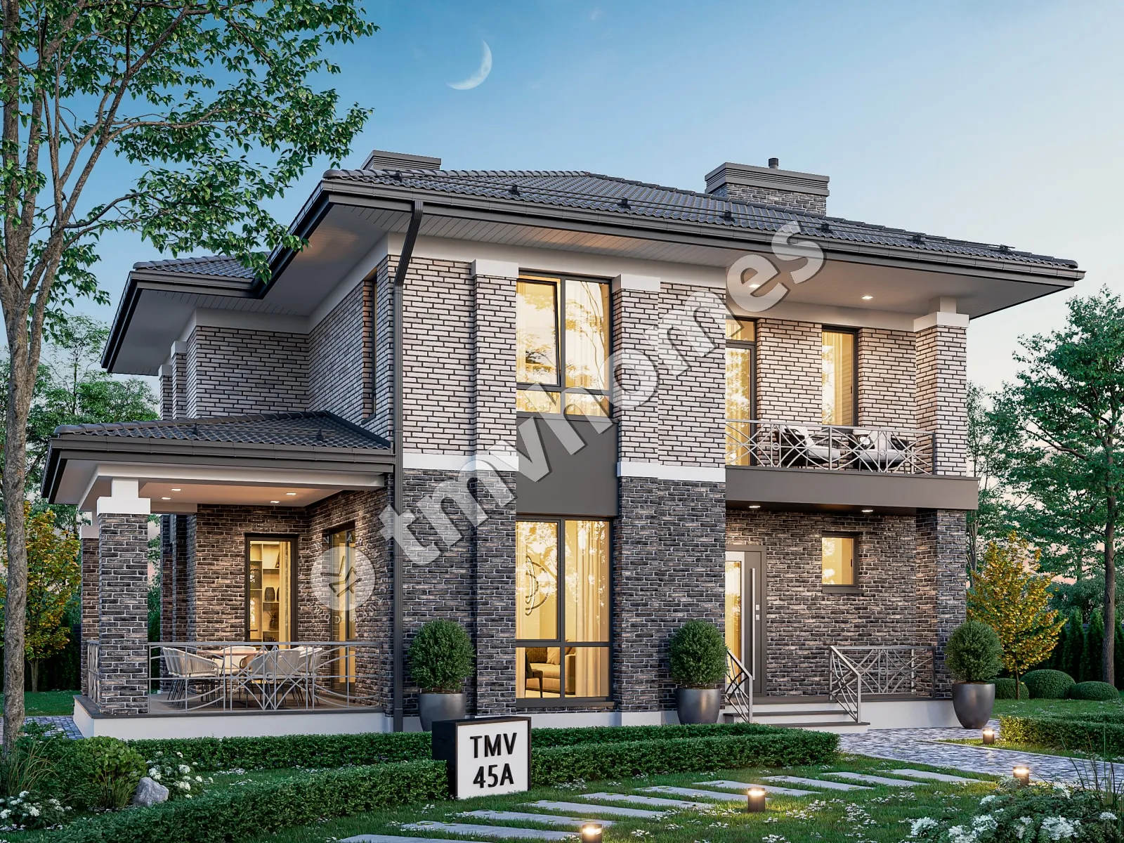 Проект TMV 45A - кирпичный двухэтажный дом без гаража, с балконом и террасой. Состав помещений: прихожая, гостиная, кухня, кабинет, 3 спальни, 3 санузла, гардеробная, кладовая, котельная.
