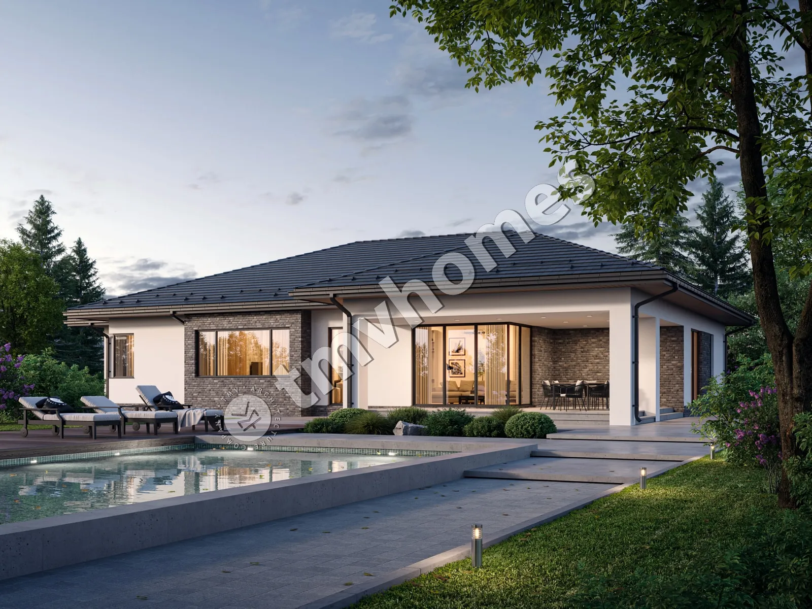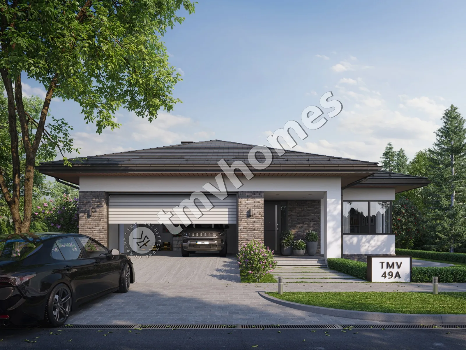 Проект TMV 49А - современный одноэтажный дом с комфортной планировкой, террасой и гаражом для 2 автомобилей. Состав помещений: прихожая, холл, кухня-столовая, гостиная, 4 спальни, 3 санузла, гардеробная, котельная.