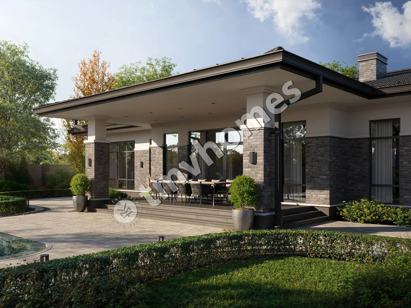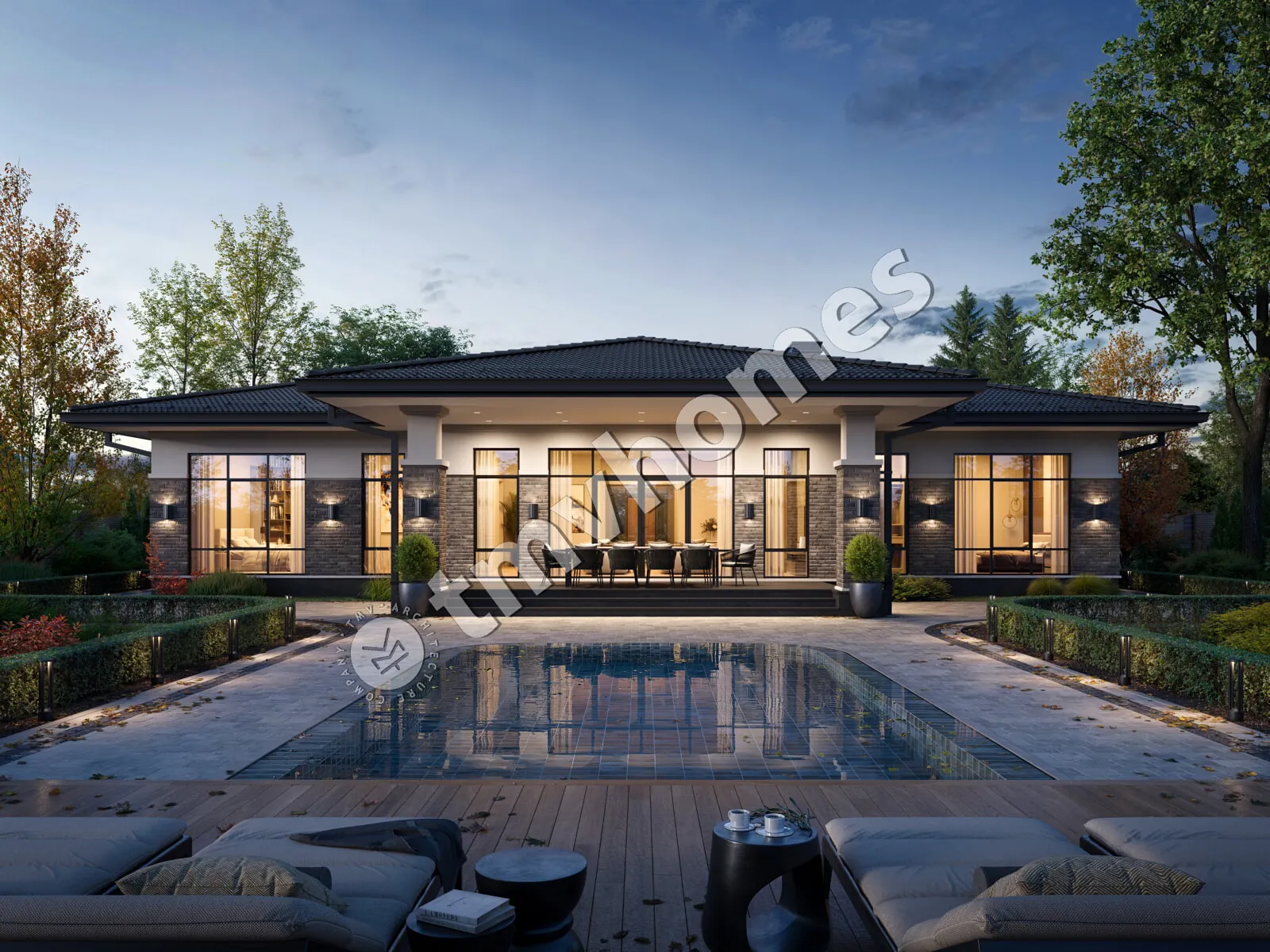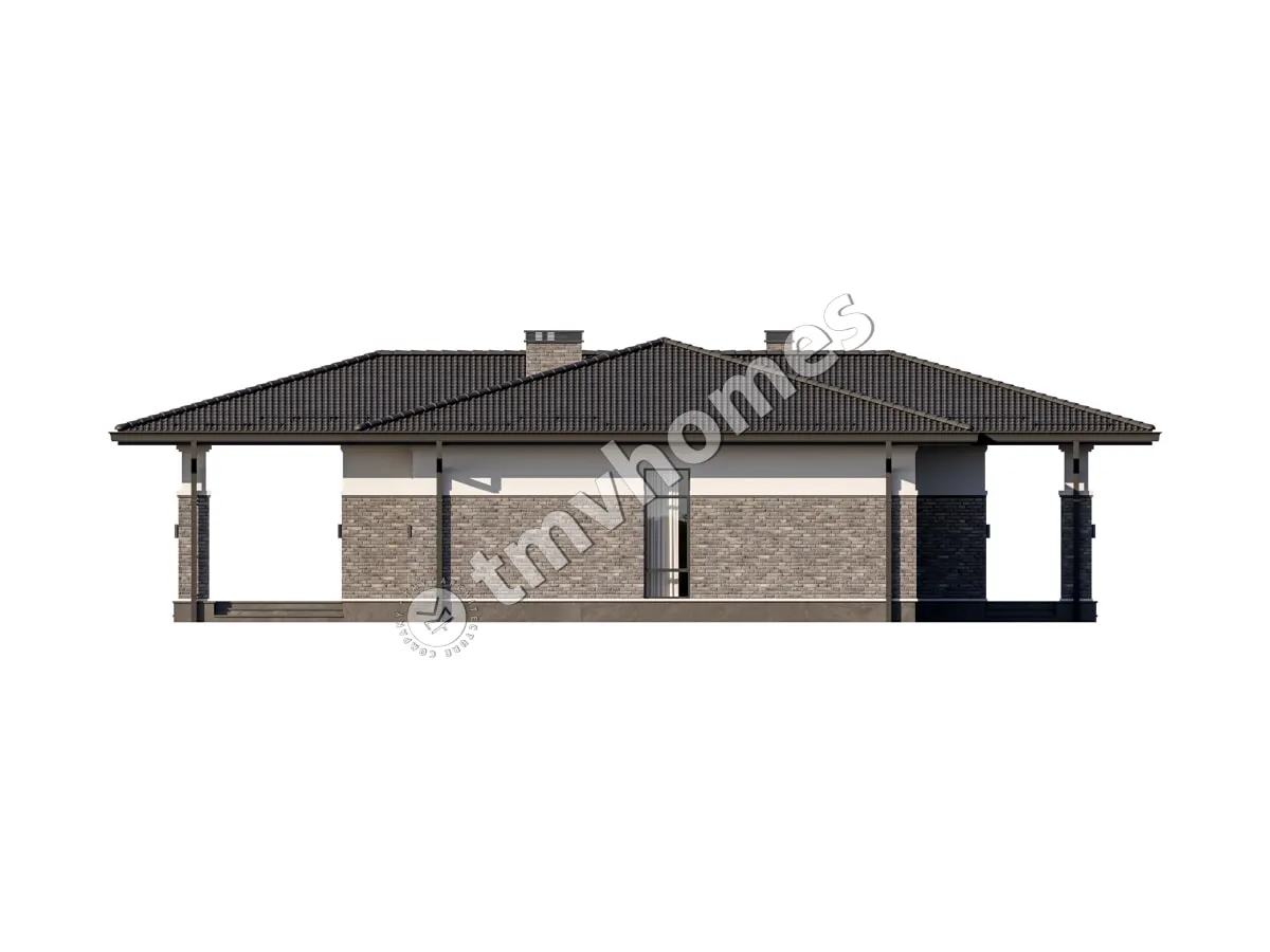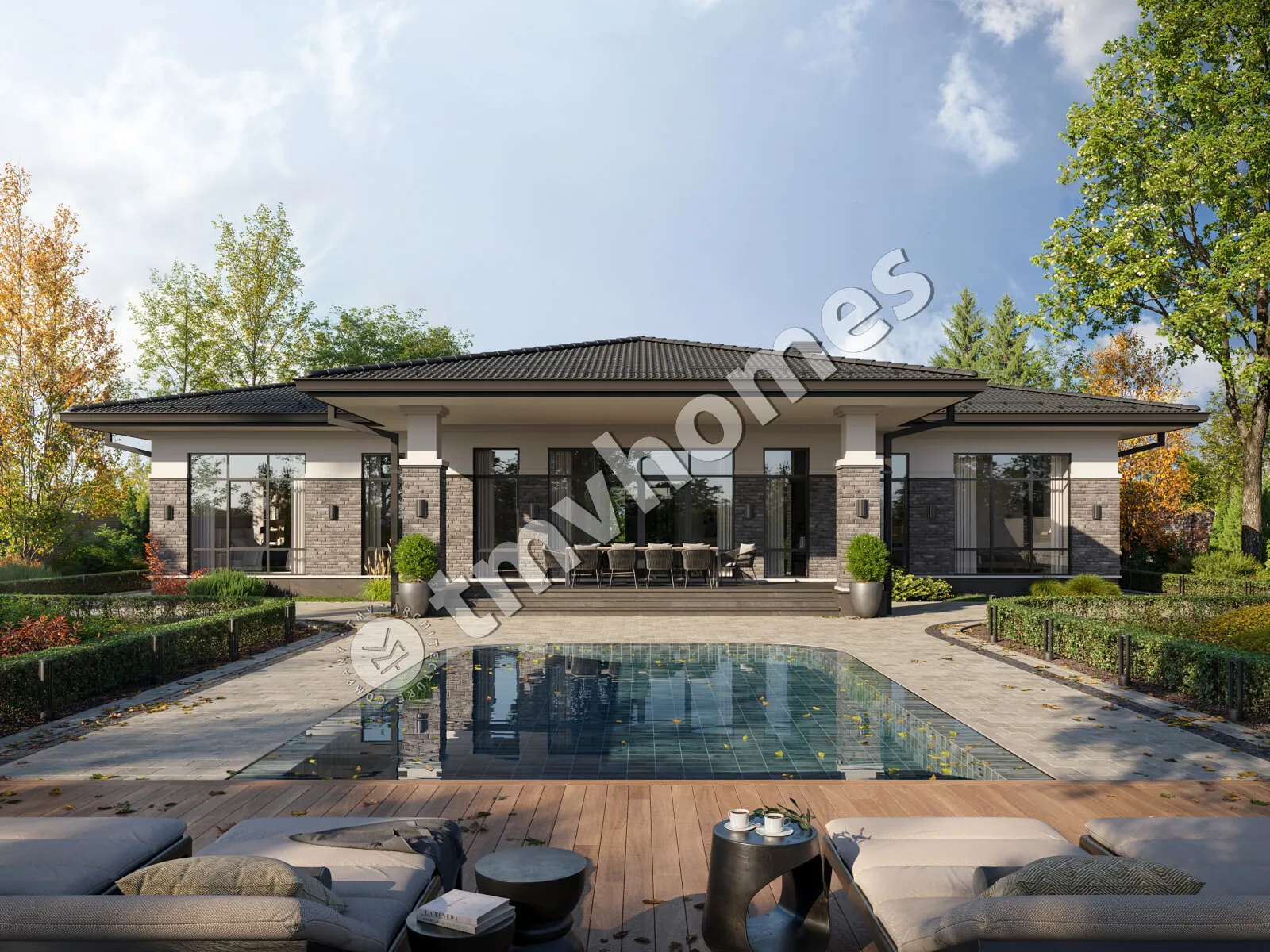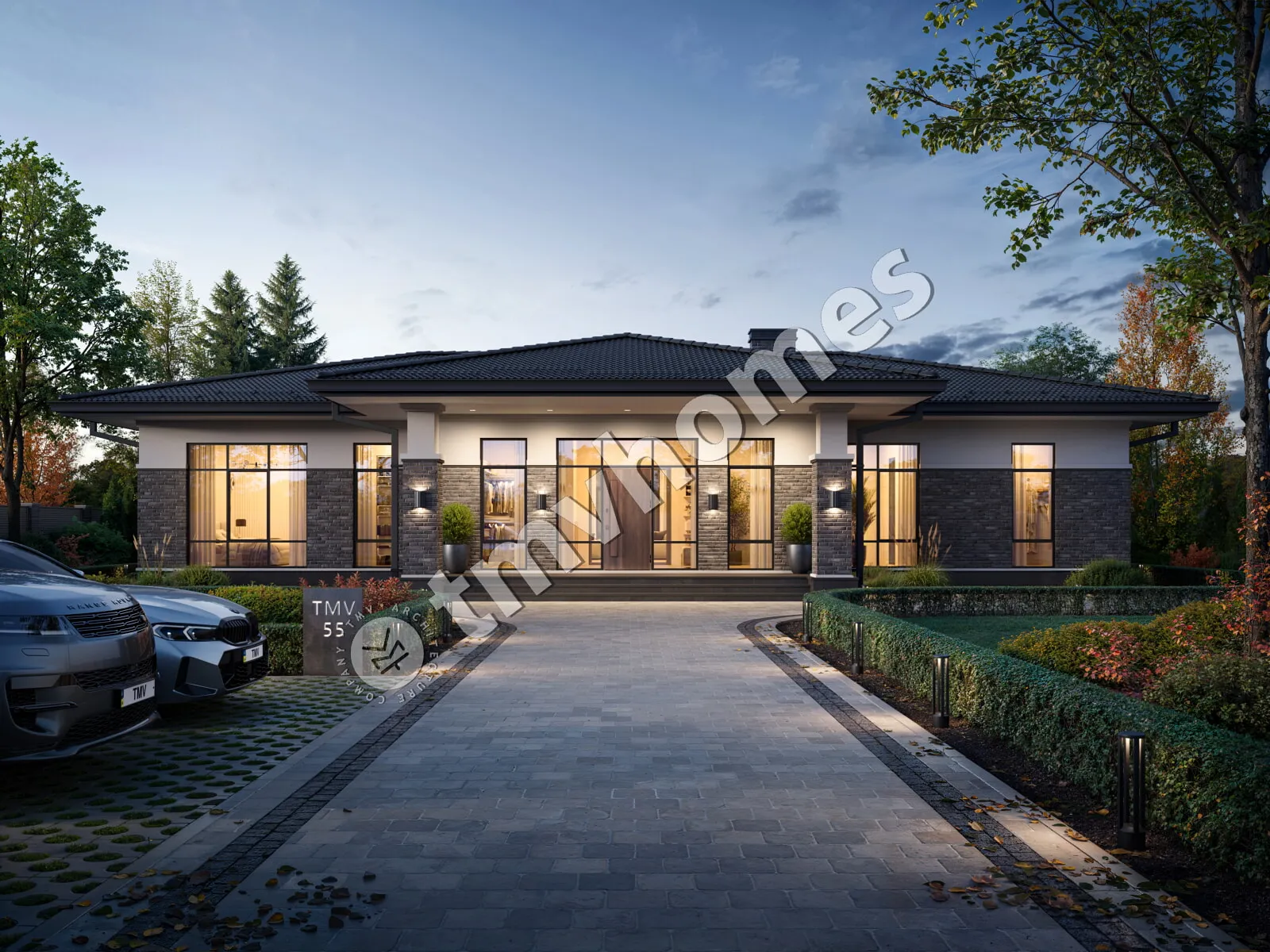 Проект TMV 55 - комфортный одноэтажный дом в стиле Райта с просторной террасой. Состав помещений: прихожая, холл, гостиная, кухня-столовая, кабинет, 3 спальни, 3 санузла, прачечная, гардеробная, кладовая, котельная.