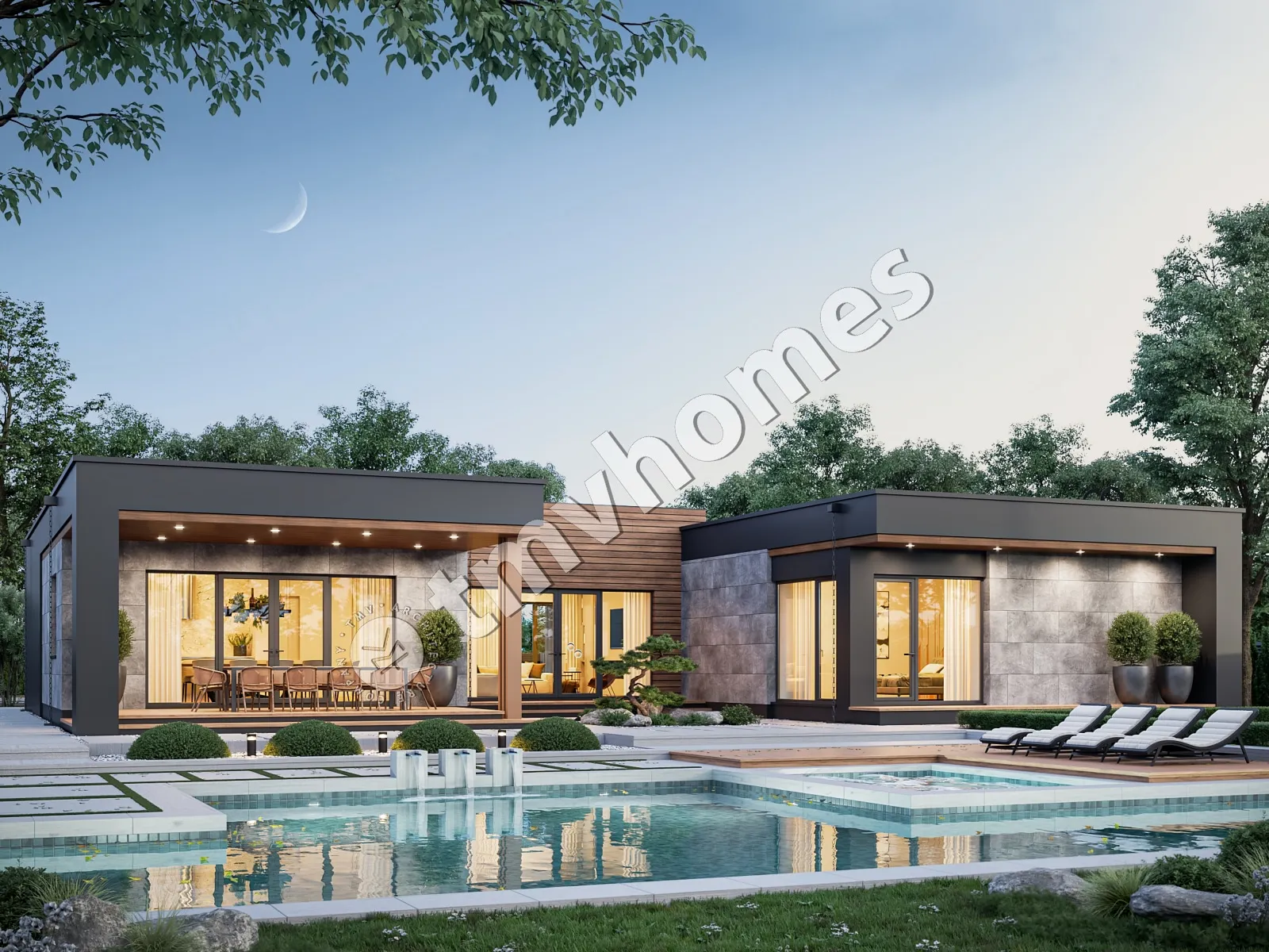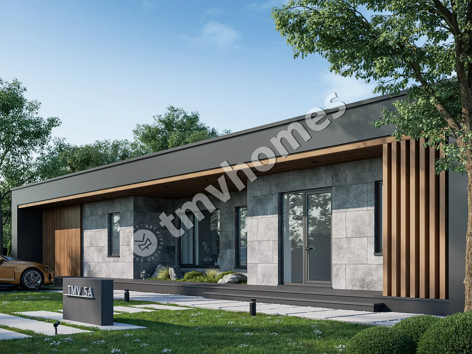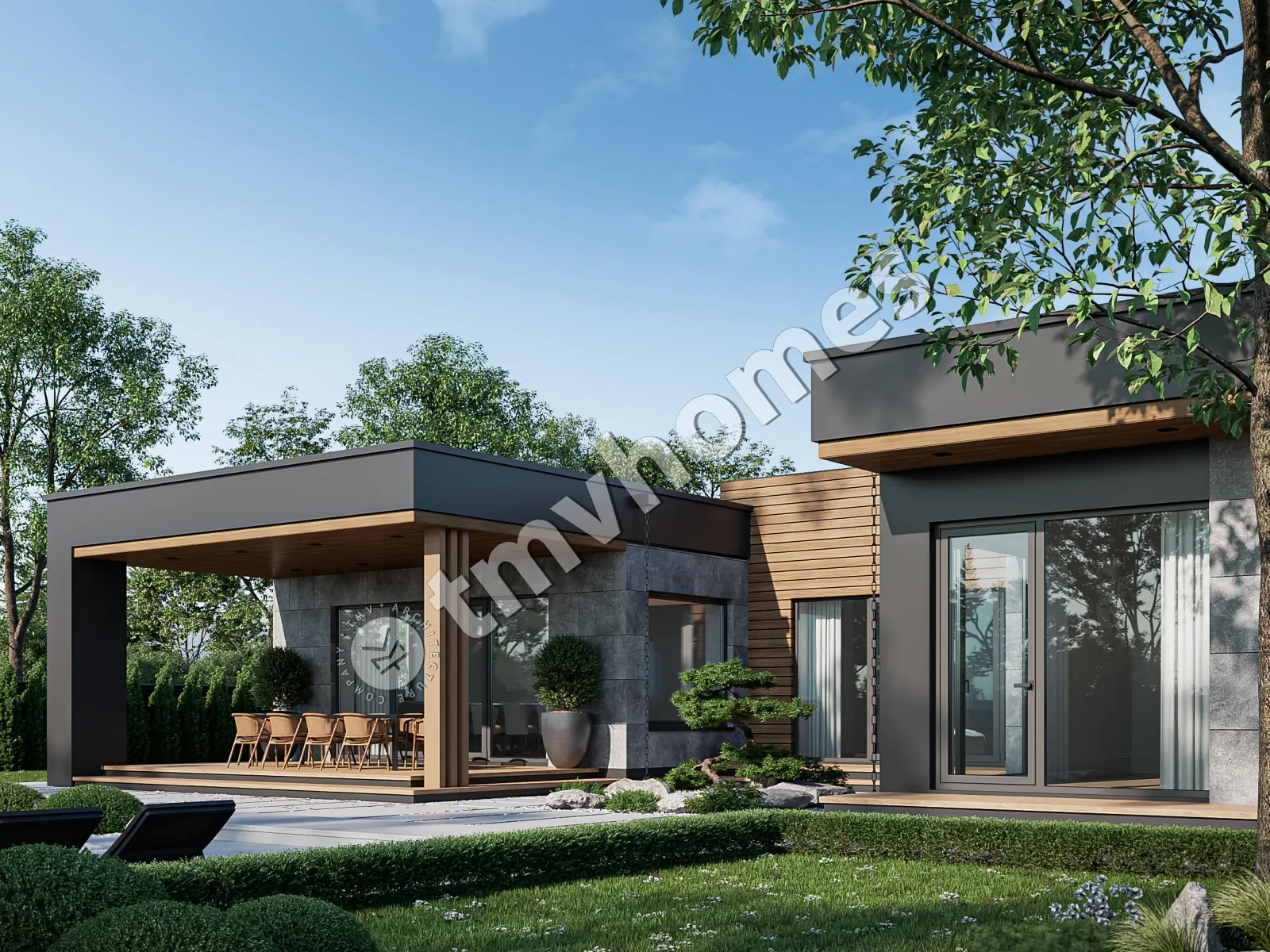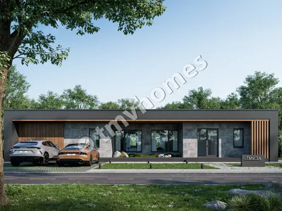 Проект TMV 5A - cовременный одноэтажный дом без гаража в стиле хай-тек с патио и крытой террасой. Состав помещений: прихожая, холл, гостиная, кухня, 3 спальни, 3 санузла, гардеробная, кладовая, котельная.