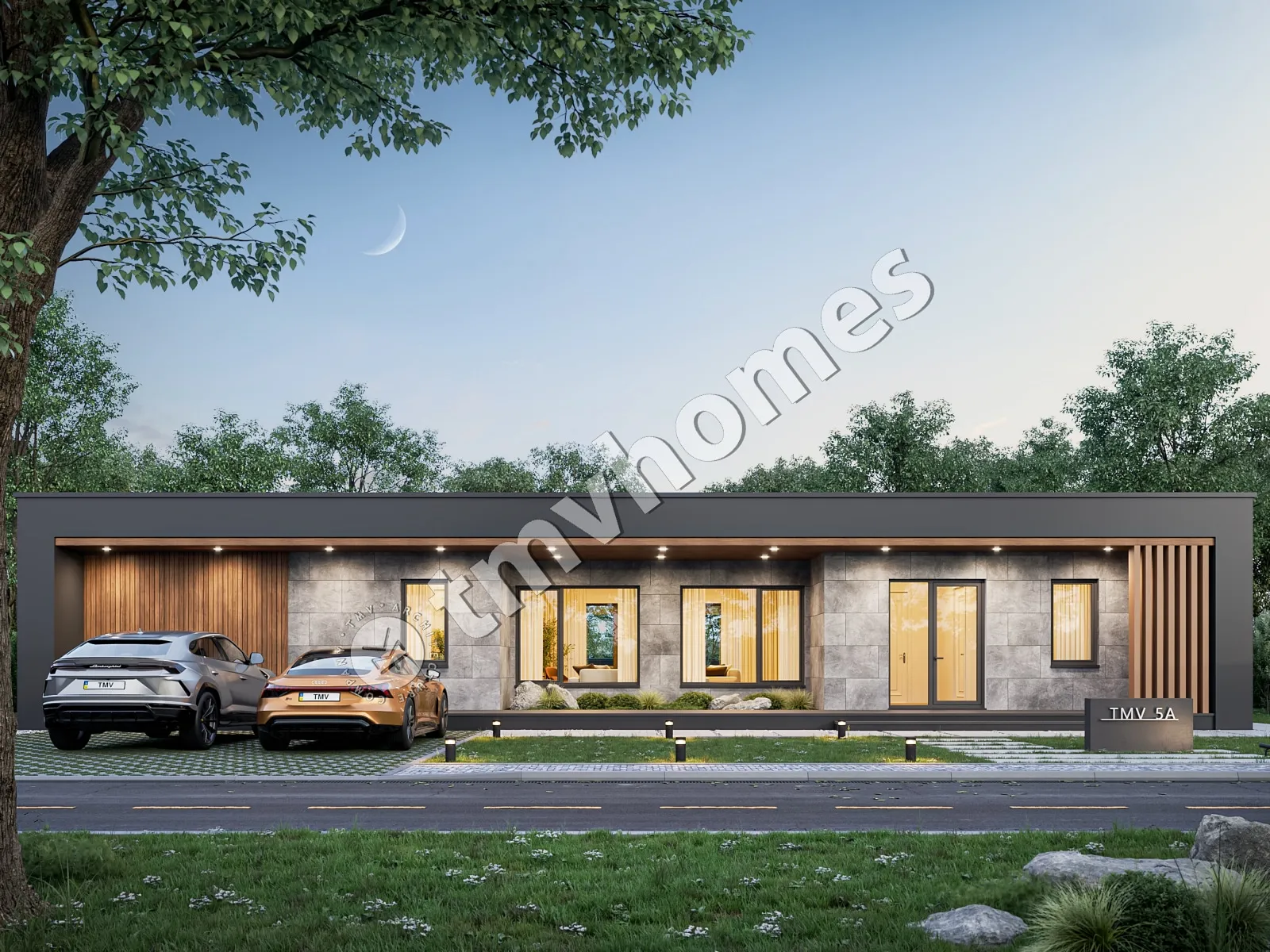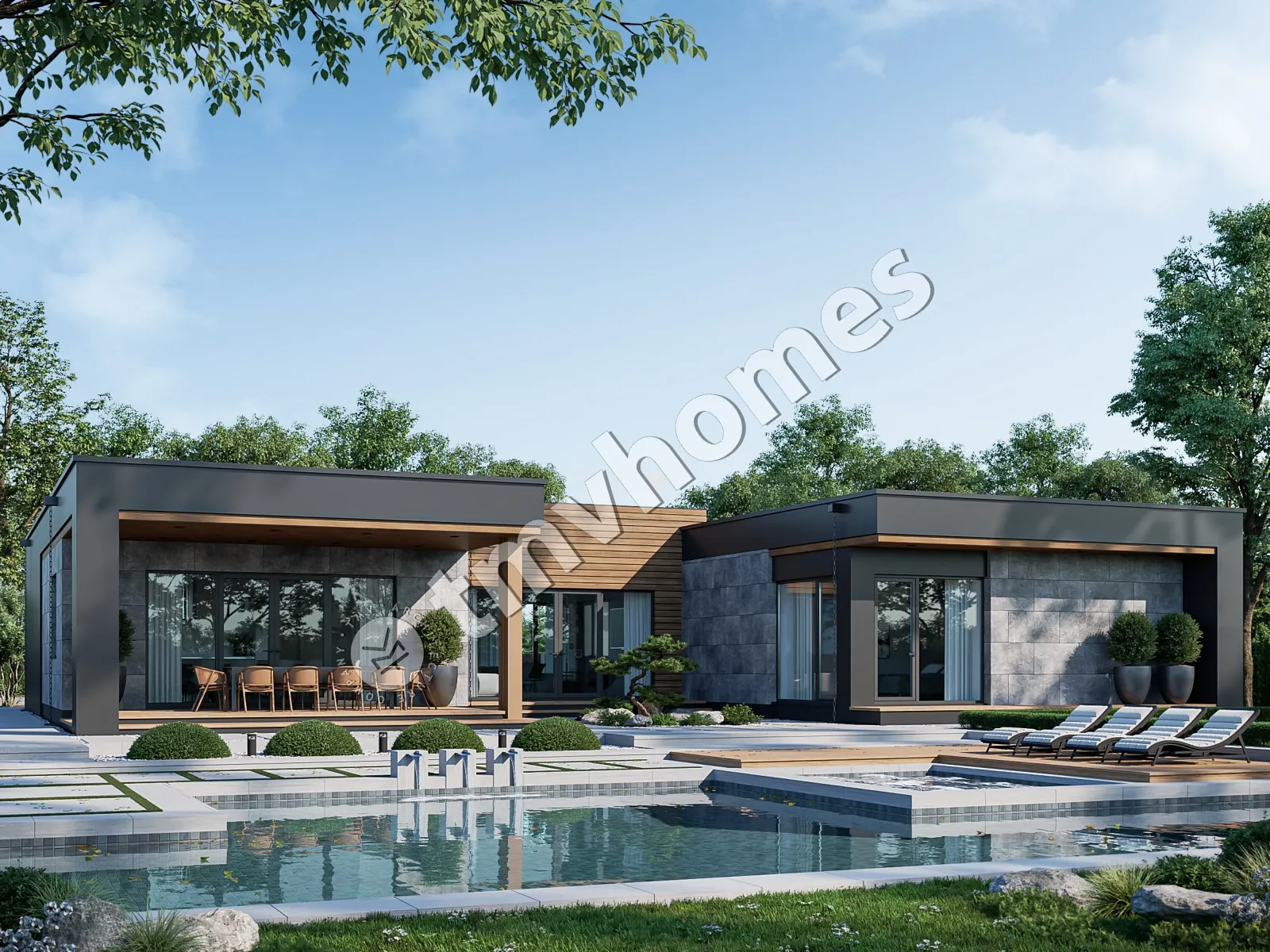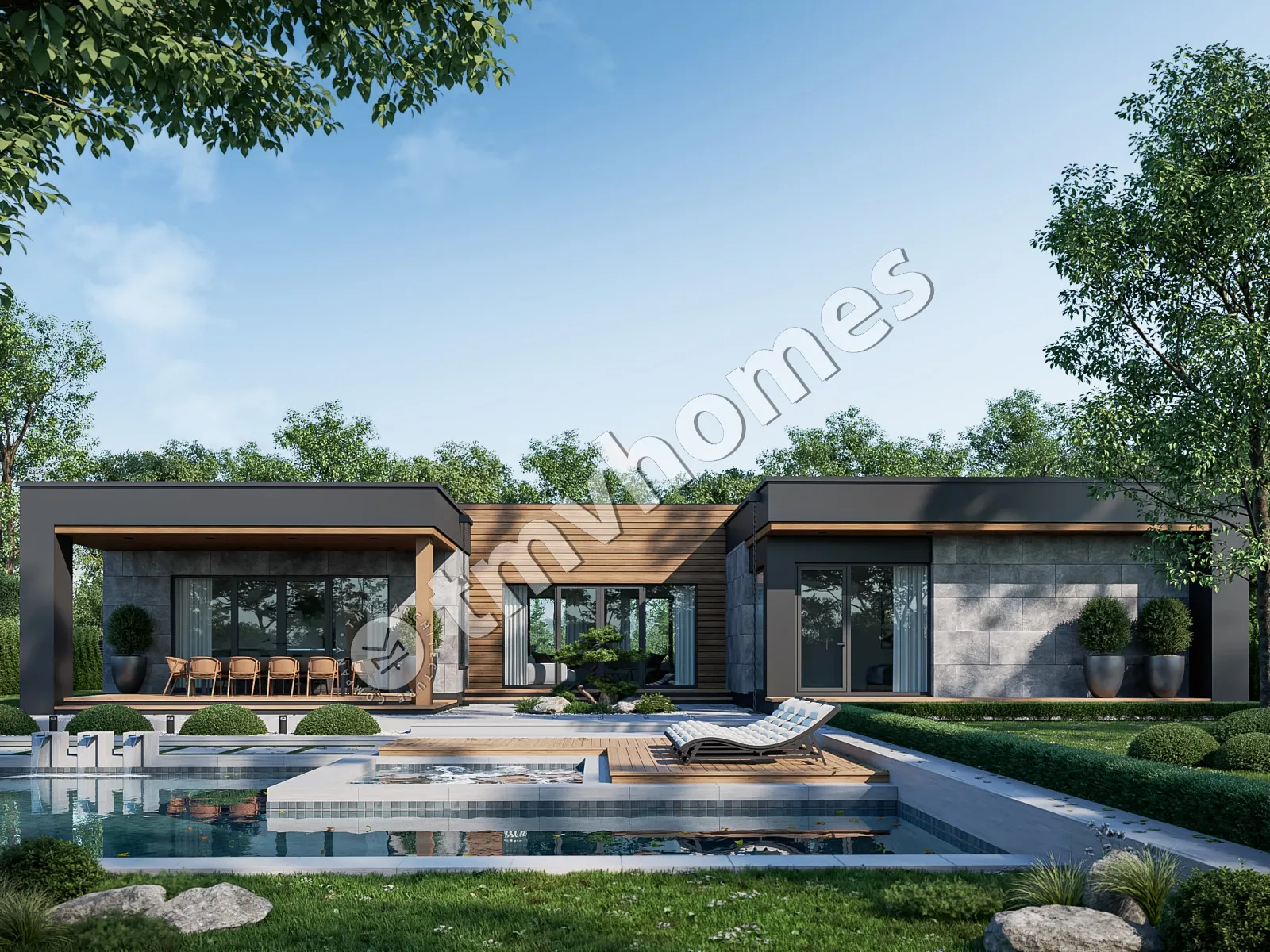 Проект TMV 5A - cовременный одноэтажный дом без гаража в стиле хай-тек с патио и крытой террасой. Состав помещений: прихожая, холл, гостиная, кухня, 3 спальни, 3 санузла, гардеробная, кладовая, котельная.
