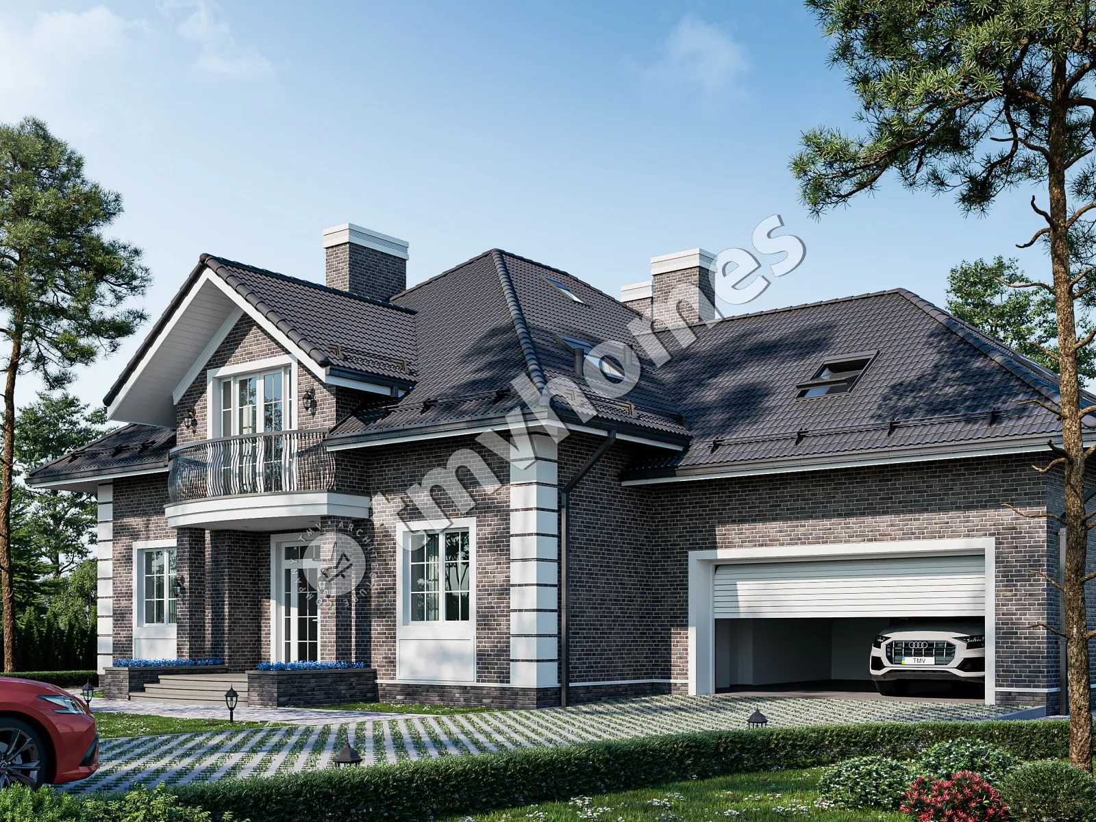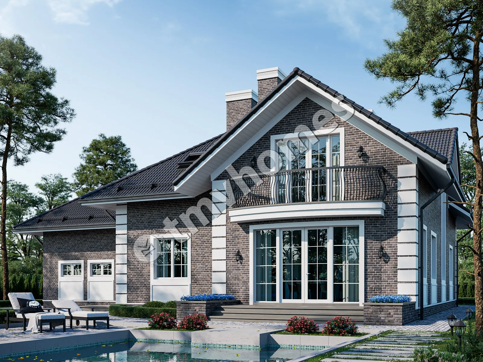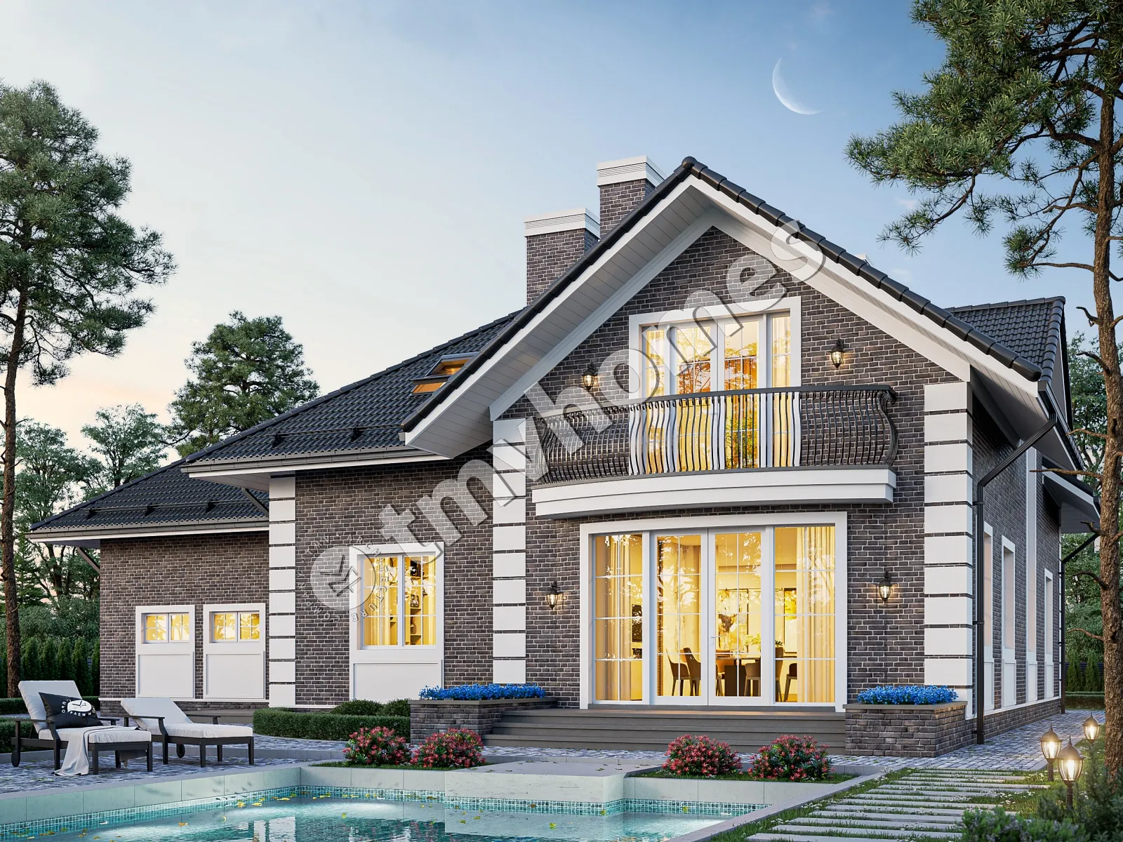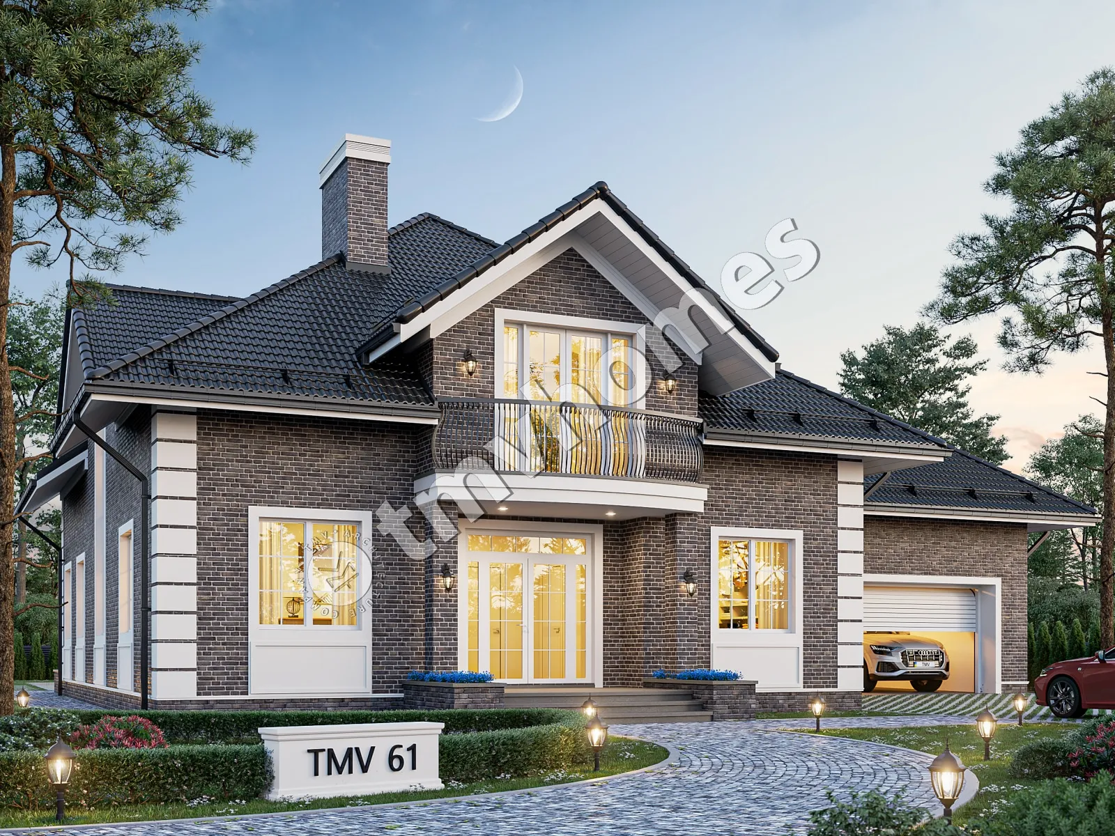 Проект TMV 61 - классический двухэтажный дом с мансардой и вторым светом. Состав помещений: прихожая, холл, кухня-столовая, гостиная, 4 спальни, 3 санузла, прачечная, комната отдыха, гардеробная, котельная.