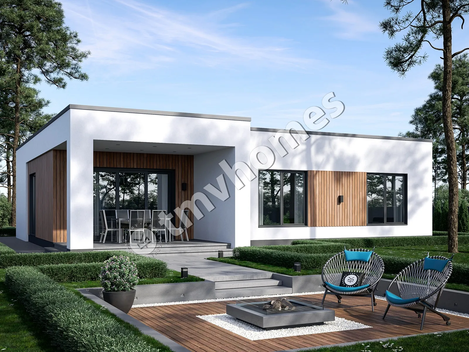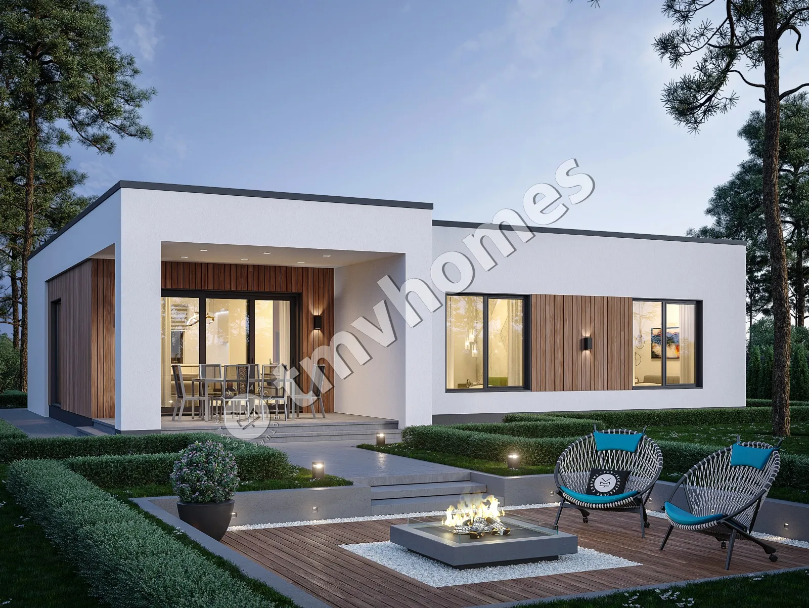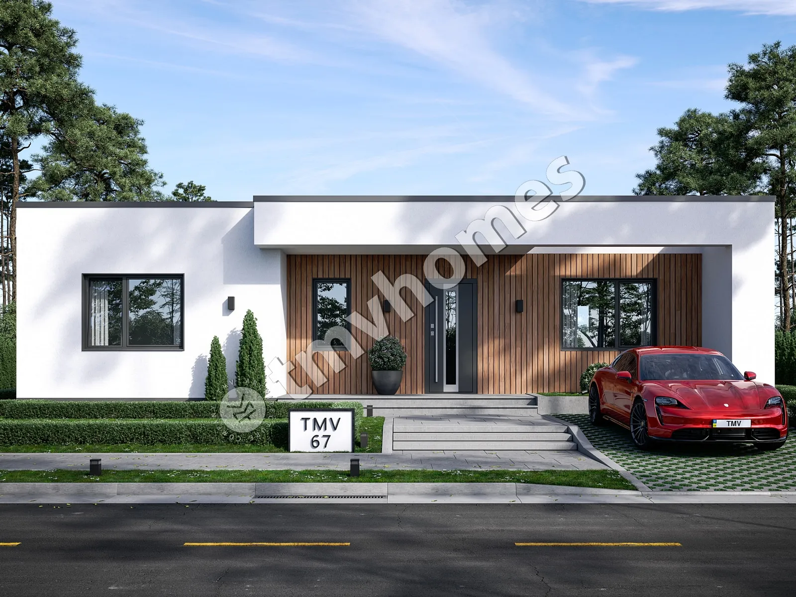Проект TMV 67 - современный одноэтажный дом с плоской крышей, удобной планировкой и террасой. Состав помещений: прихожая, холл, гостиная, кухня-столовая, 3 спальни, 2 санузла, котельная.
