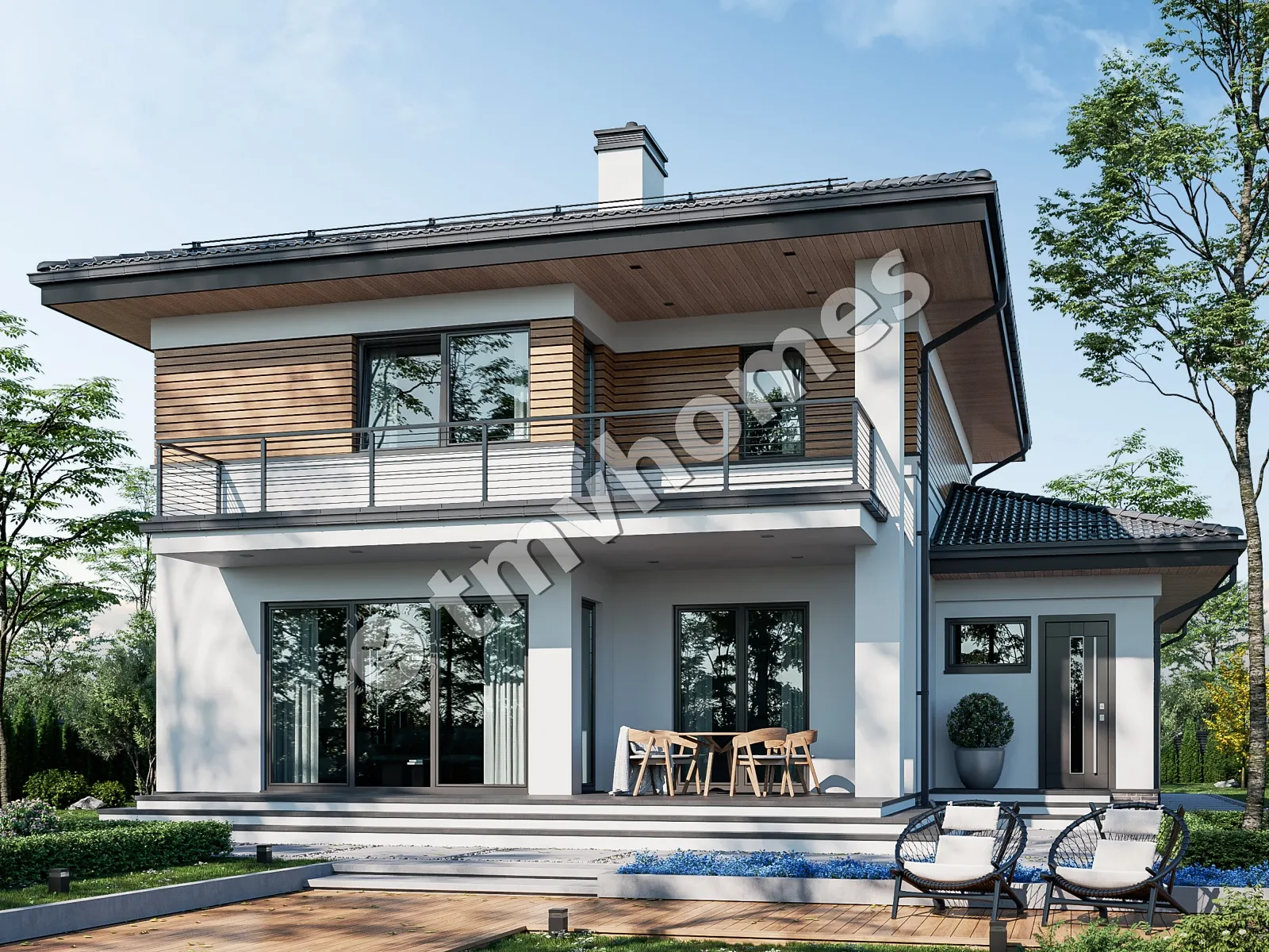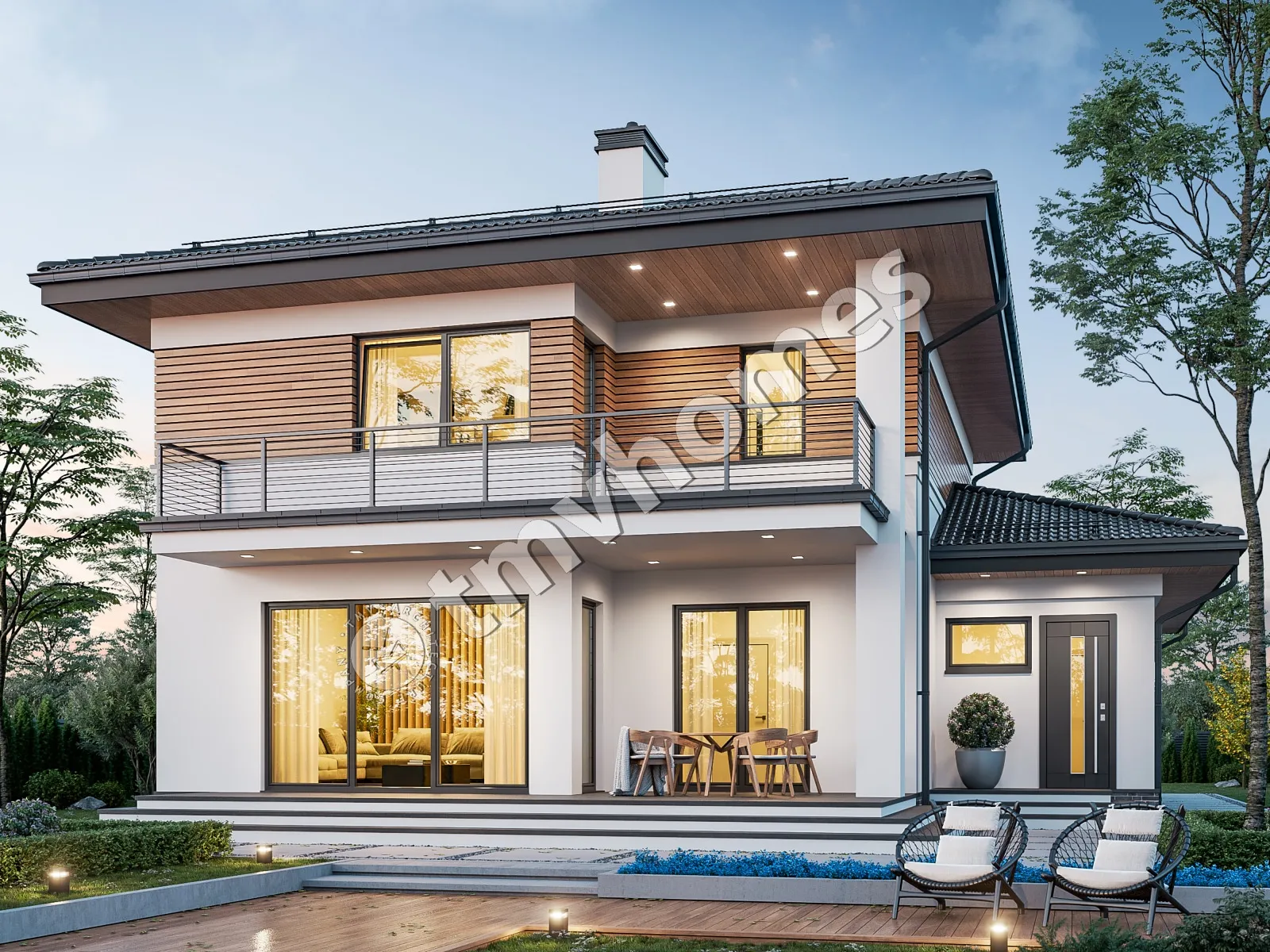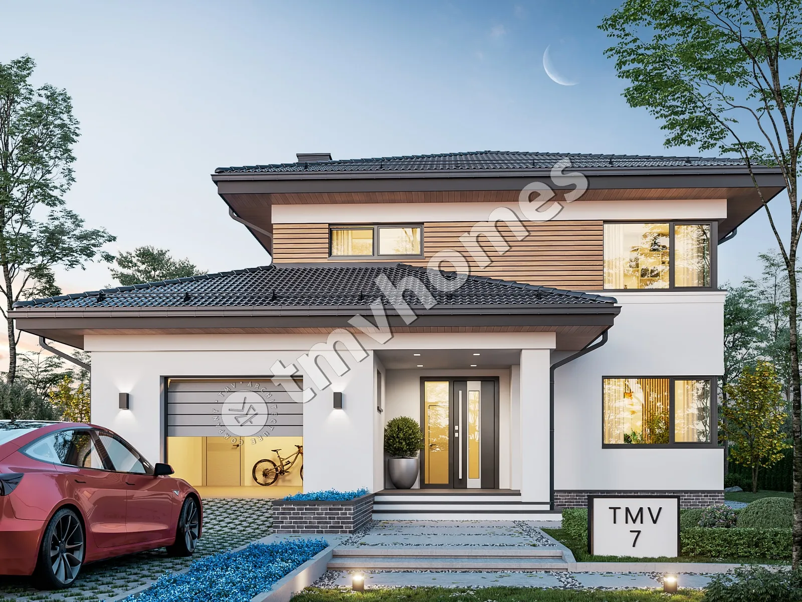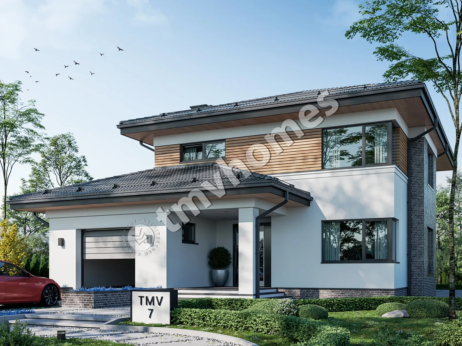 Проект TMV 7 - современный двухэтажный дом c террасой, балконом и гаражом для 1 автомобиля. Состав помещений: прихожая, холл, кухня-столовая, гостиная, кабинет, 3 спальни, 3 санузла, постирочная, гардеробная, котельная.