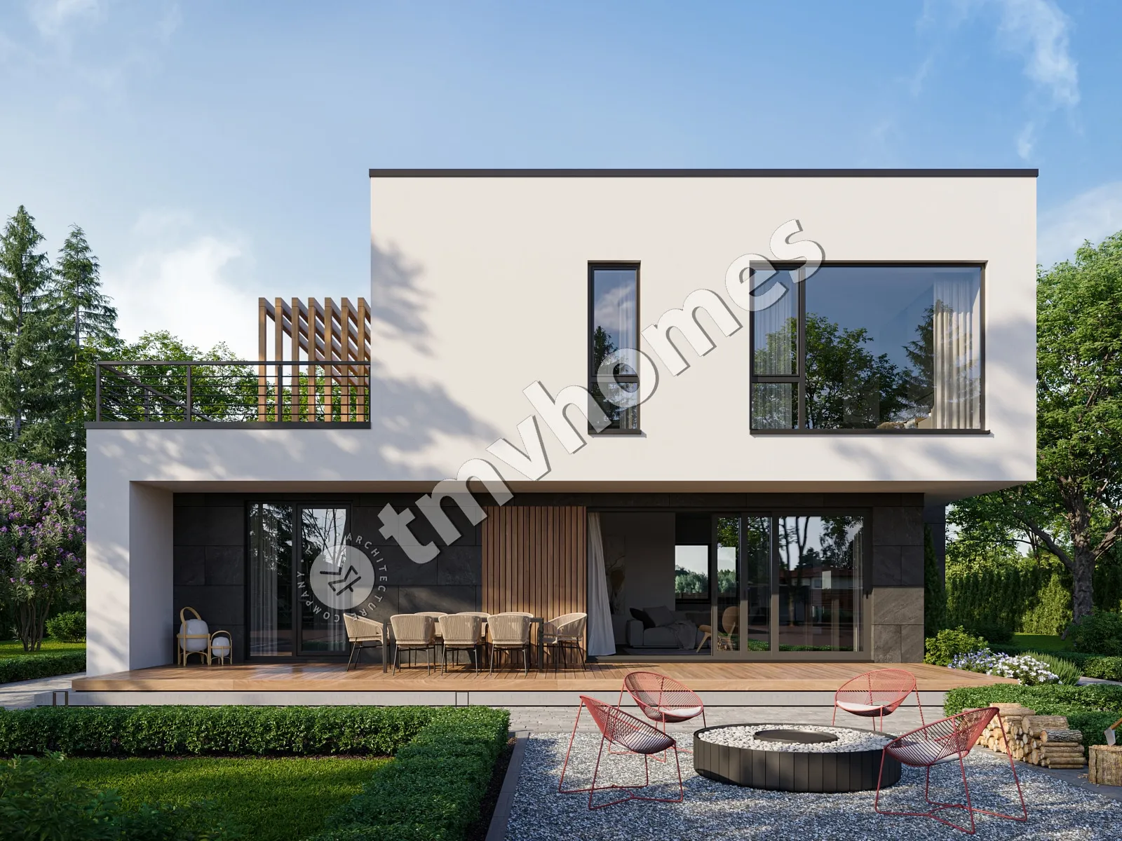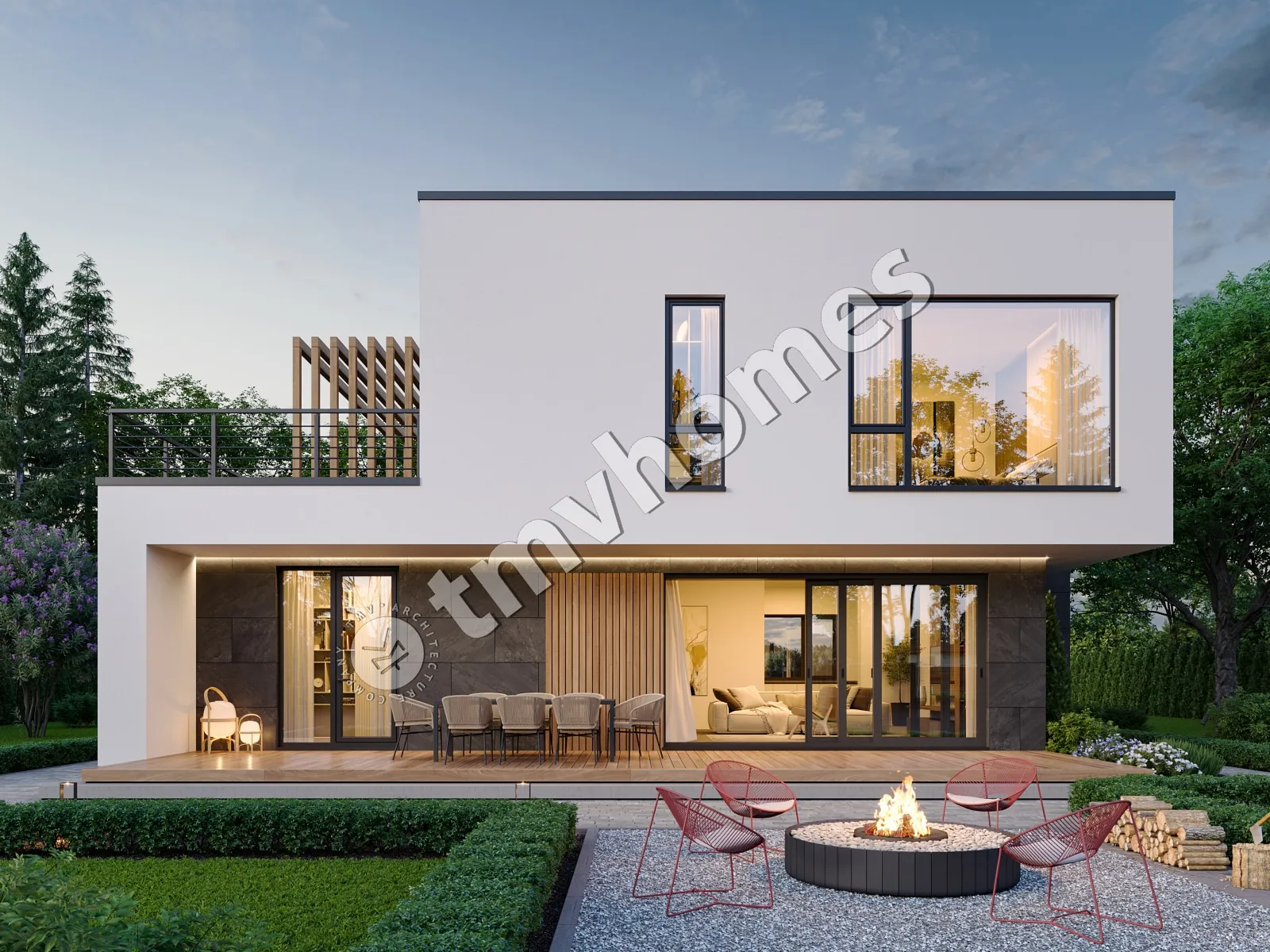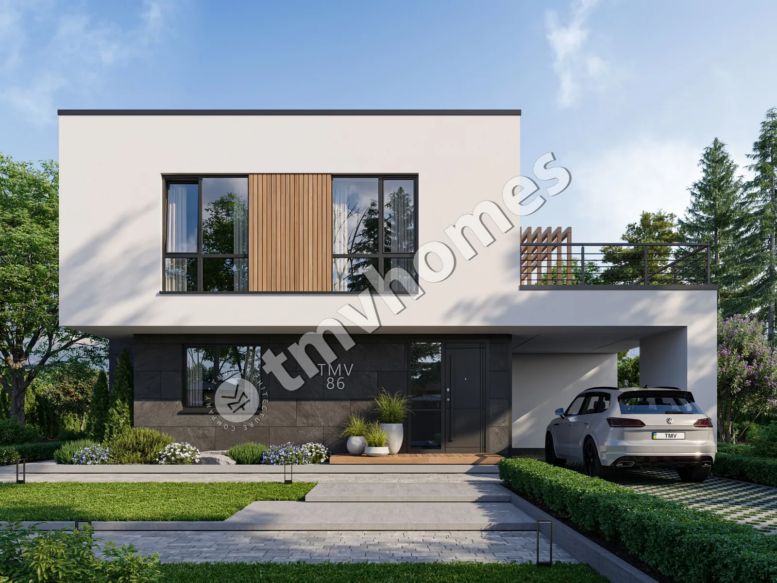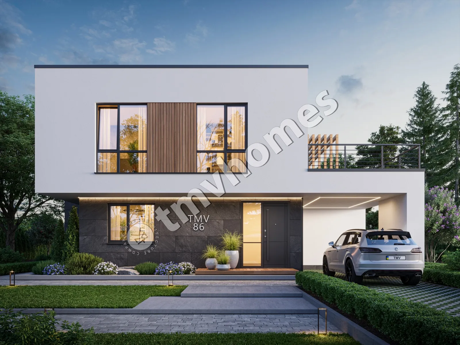 Проект TMV 86 - современный двухэтажный дом в стиле хай-тек с плоской крышей, террасами и навесом для 1 автомобиля. Состав помещений: прихожая, холл, гостиная, кухня-столовая, 3 спальни, 3 санузла, гардеробная, кладовая, котельная.