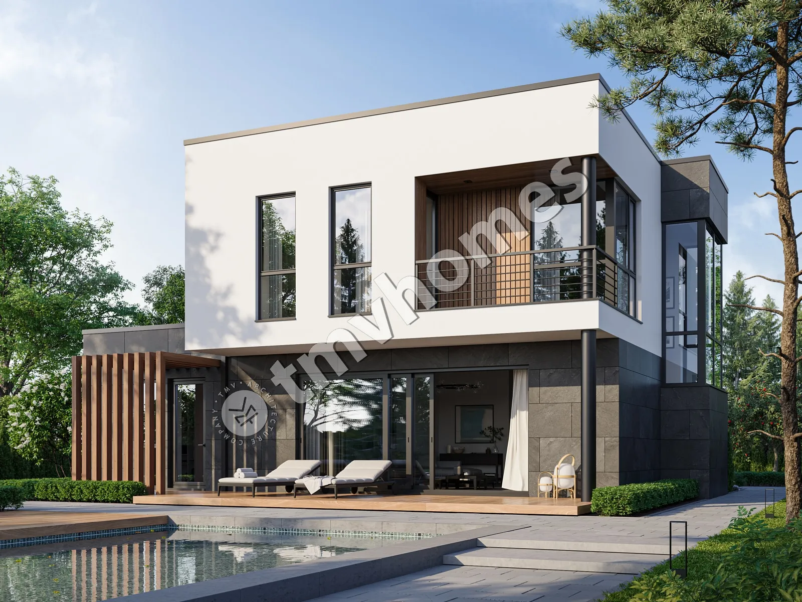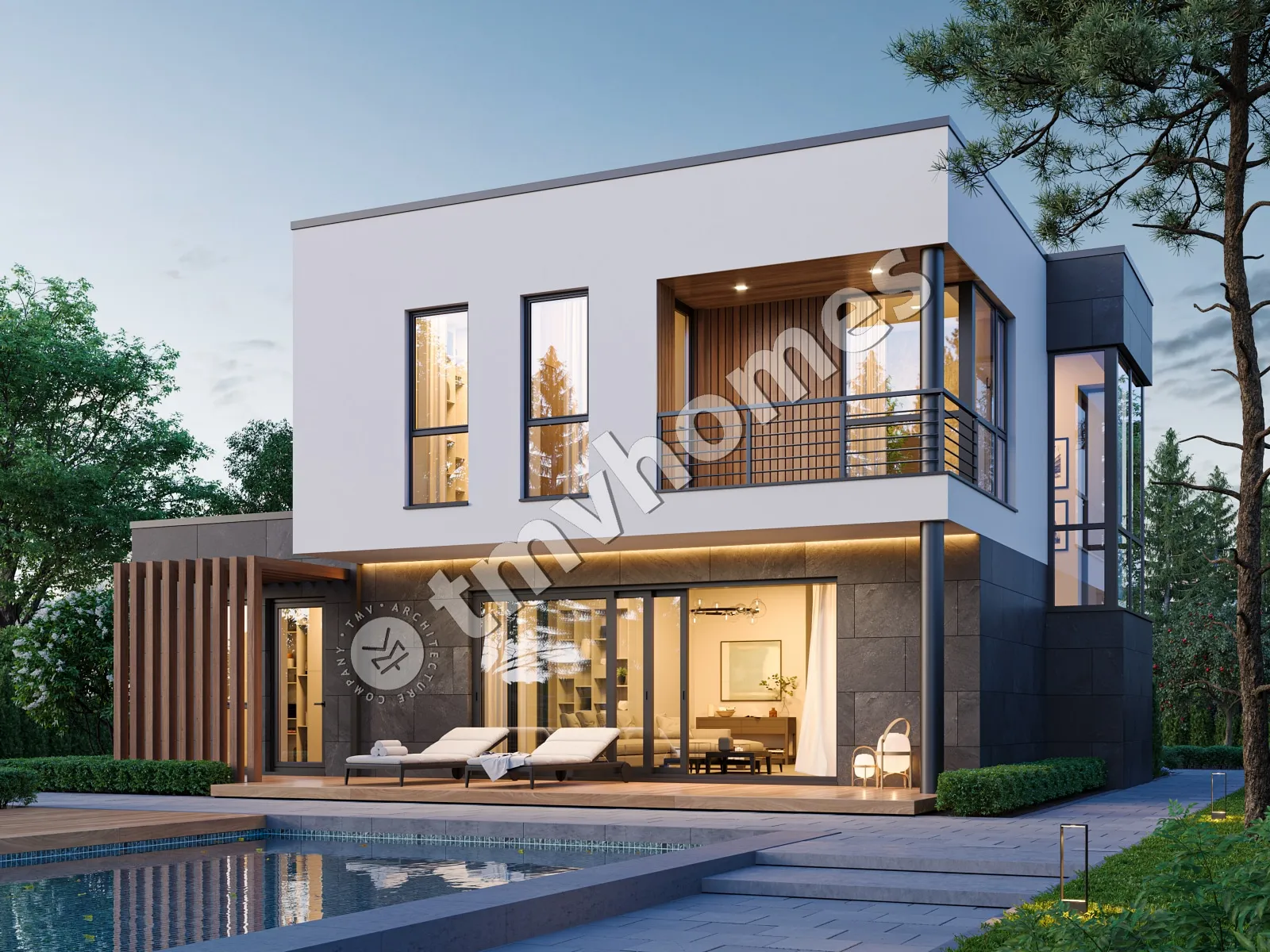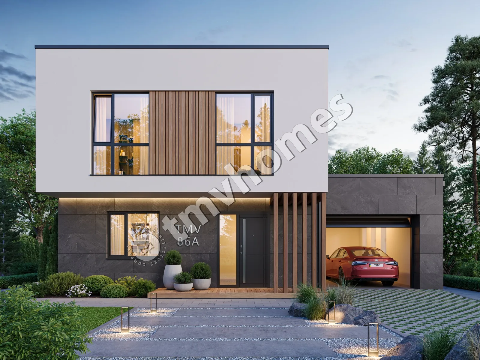 Проект TMV 86A - современный двухэтажный дом в стиле хай-тек с плоской крышей, террасой, балконом и гаражом для 1 автомобиля. Состав помещений: прихожая, холл, гостиная, кухня-столовая, 3 спальни, 3 санузла, гардеробная, котельная.