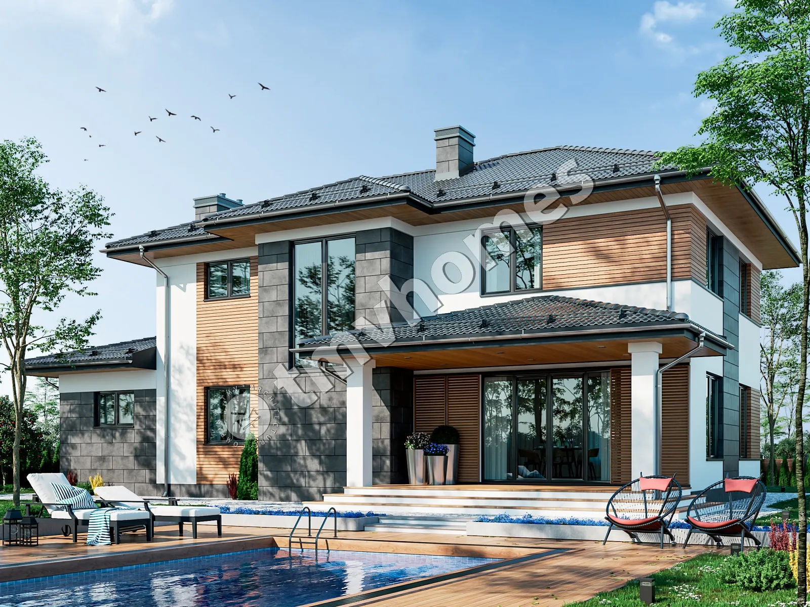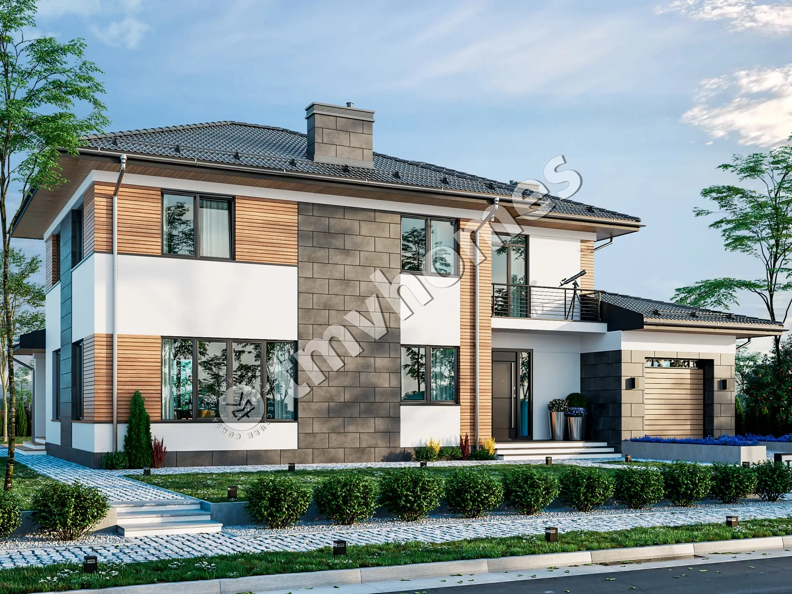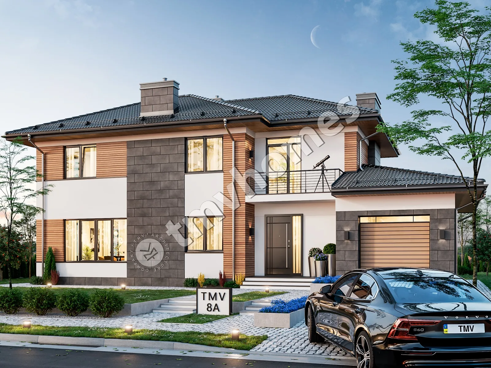 Проект TMV 8A - двухэтажный дом для узкого участка с террасой, балконом и гаражом для 1 автомобиля. Состав помещений: прихожая, холл, кухня-столовая, гостиная, кабинет, 3 спальни, 2 санузла, гардеробная, котельная.