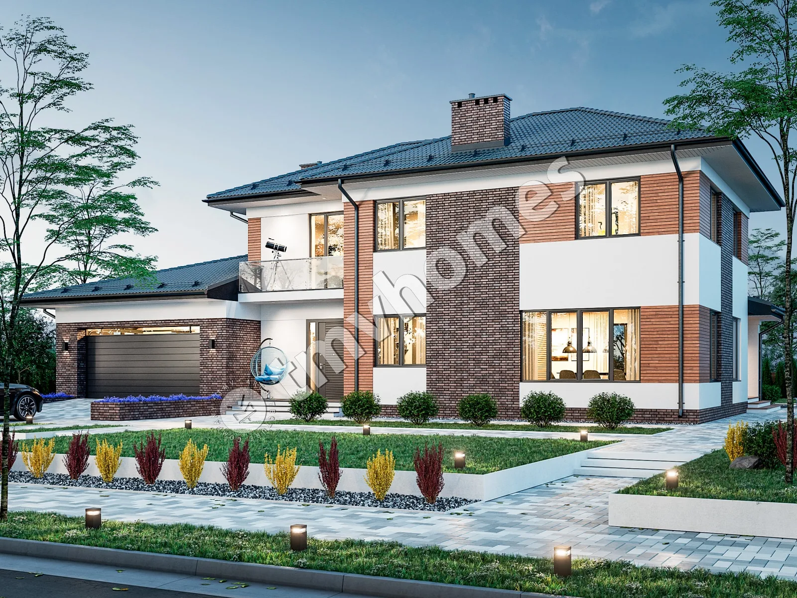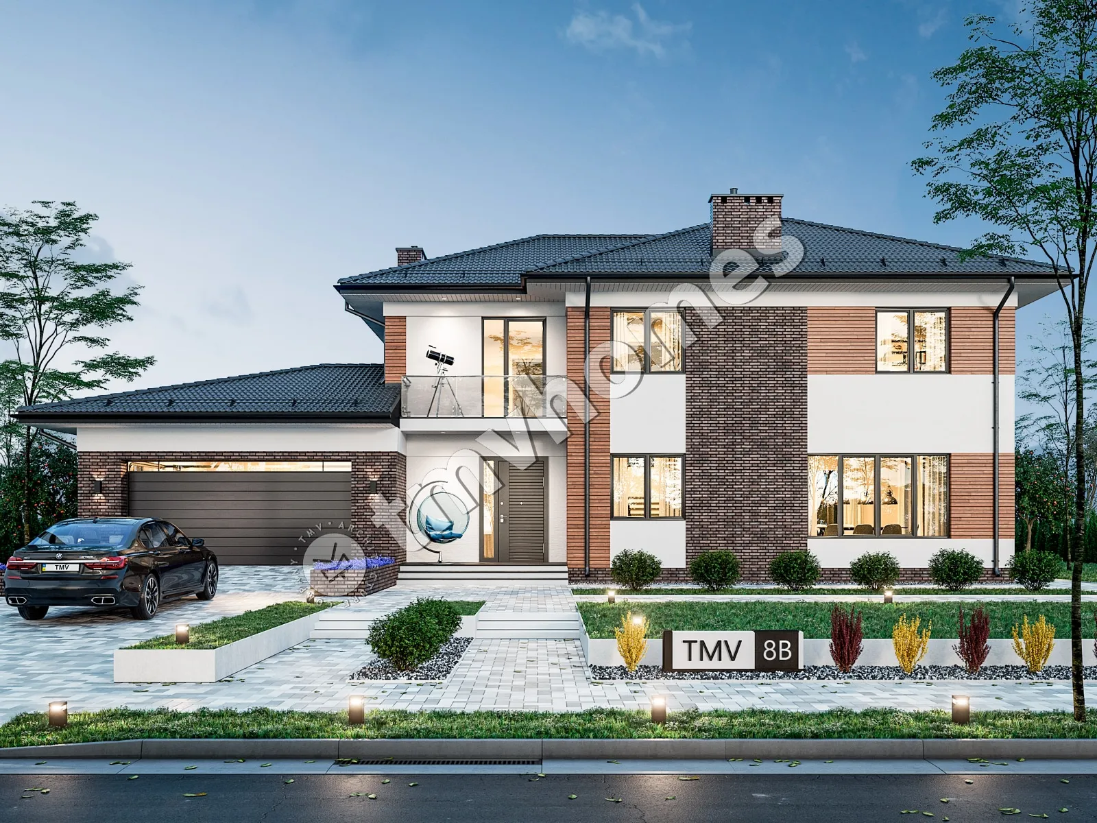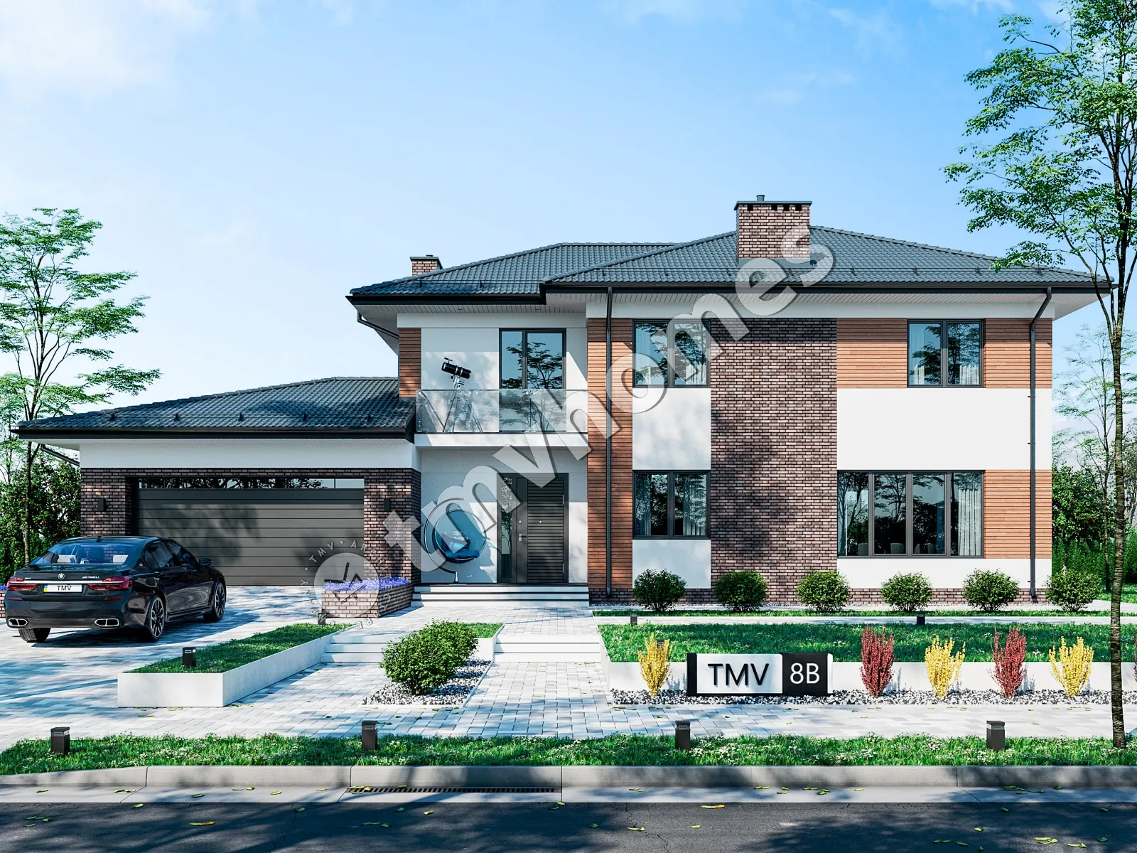 Проект TMV 8B - двухэтажный дом для узкого участка с террасой, балконом и гаражом для 2 автомобилей. Состав помещений: прихожая, холл, кухня-столовая, гостиная, кабинет, 3 спальни, 2 санузла, гардеробная, котельная.