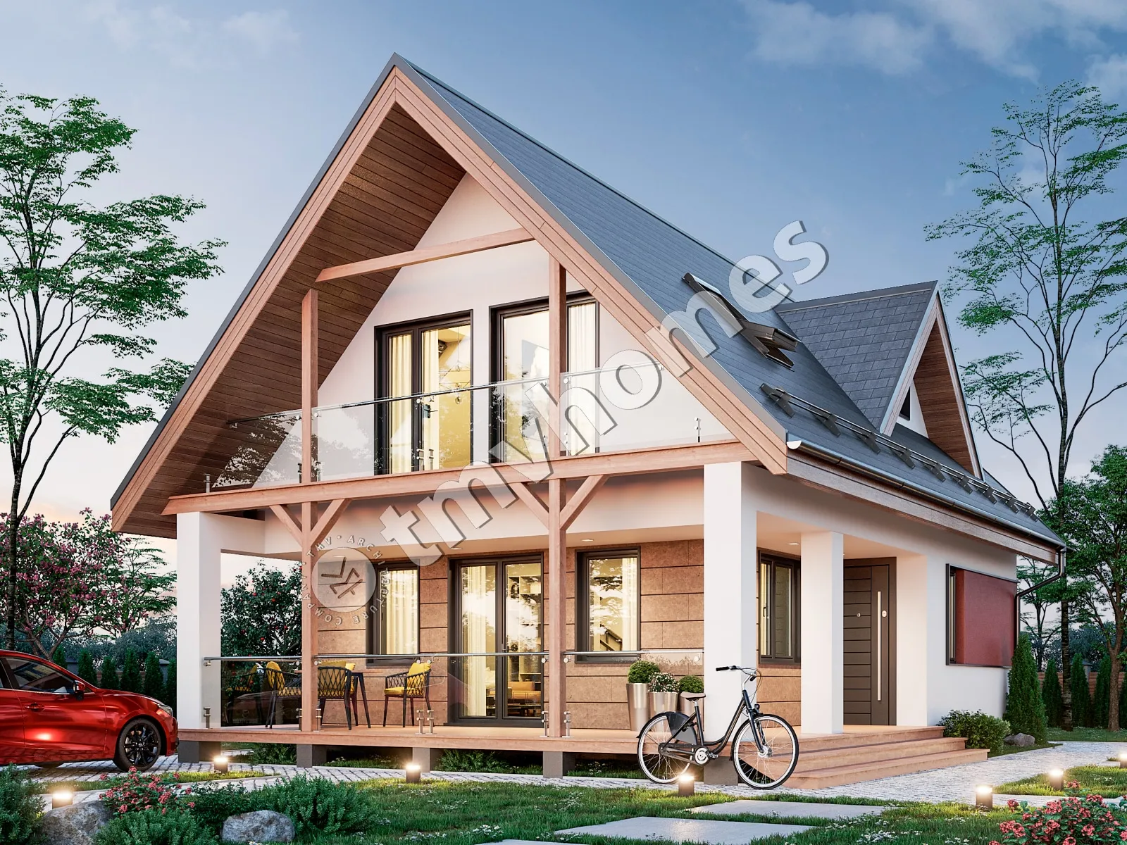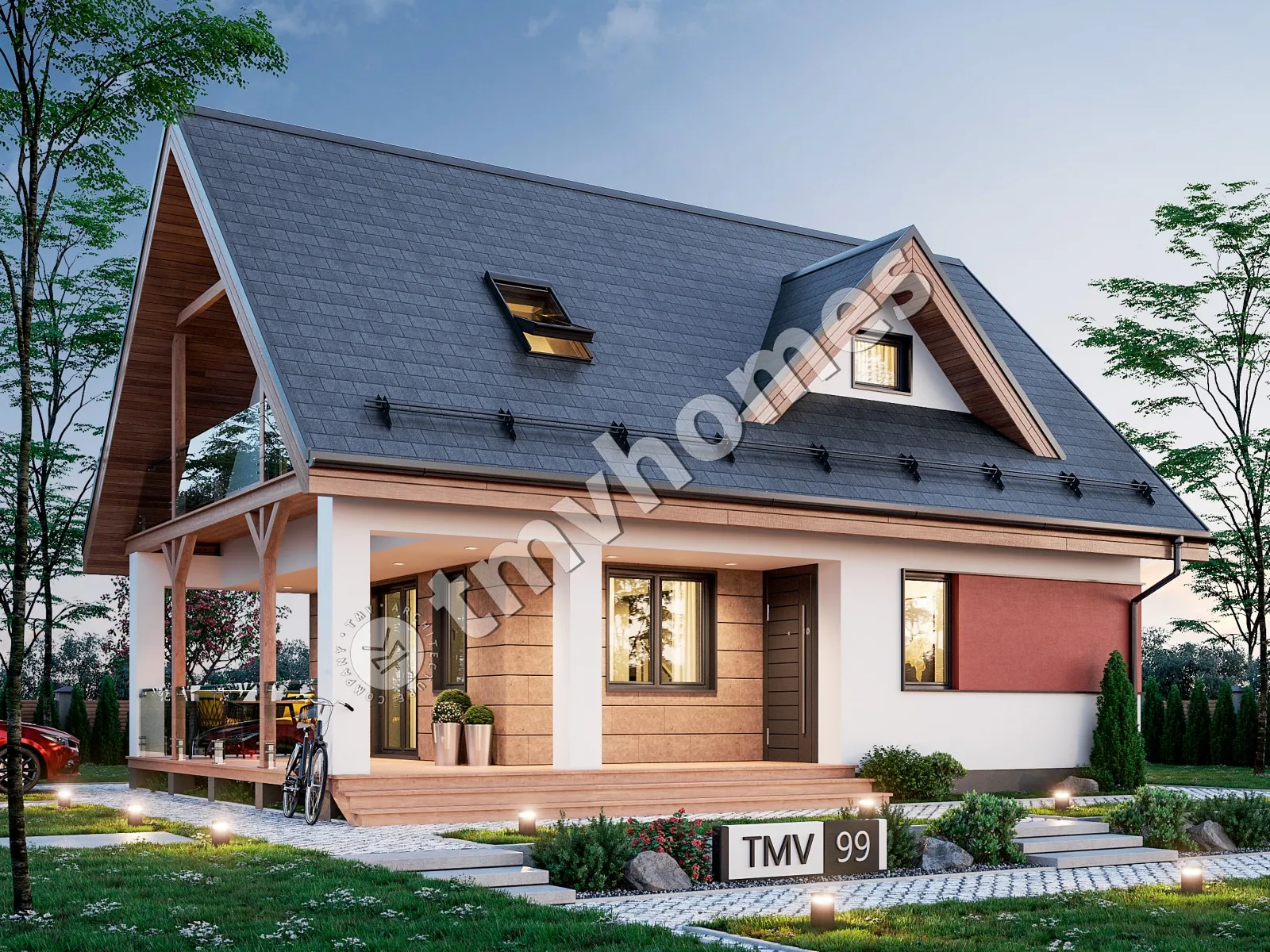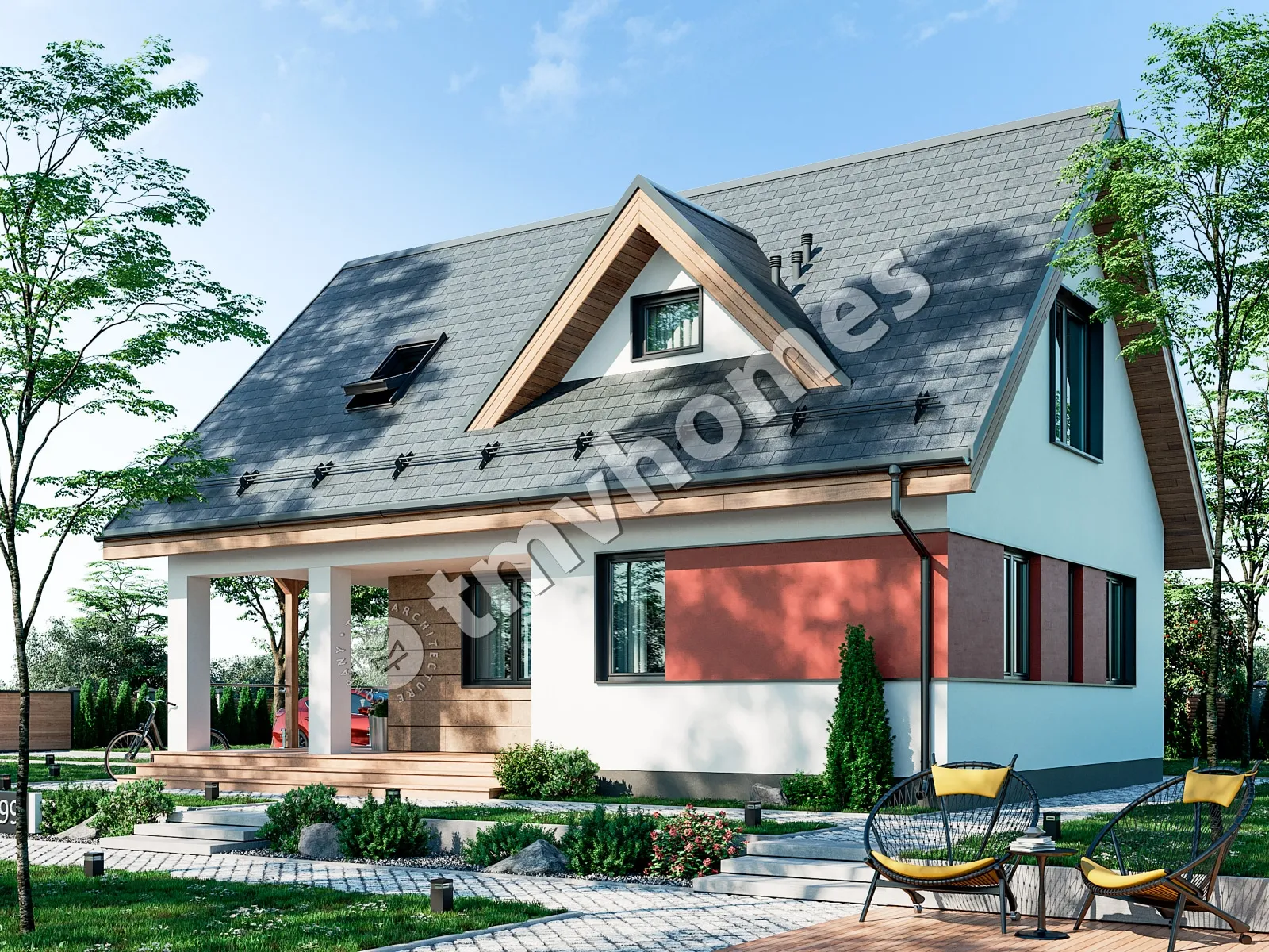 Проект TMV 99 - дачный двухэтажный дом с мансардой и террасой. Состав помещений: прихожая, гостиная, кухня, 3 спальни, 2 санузла.