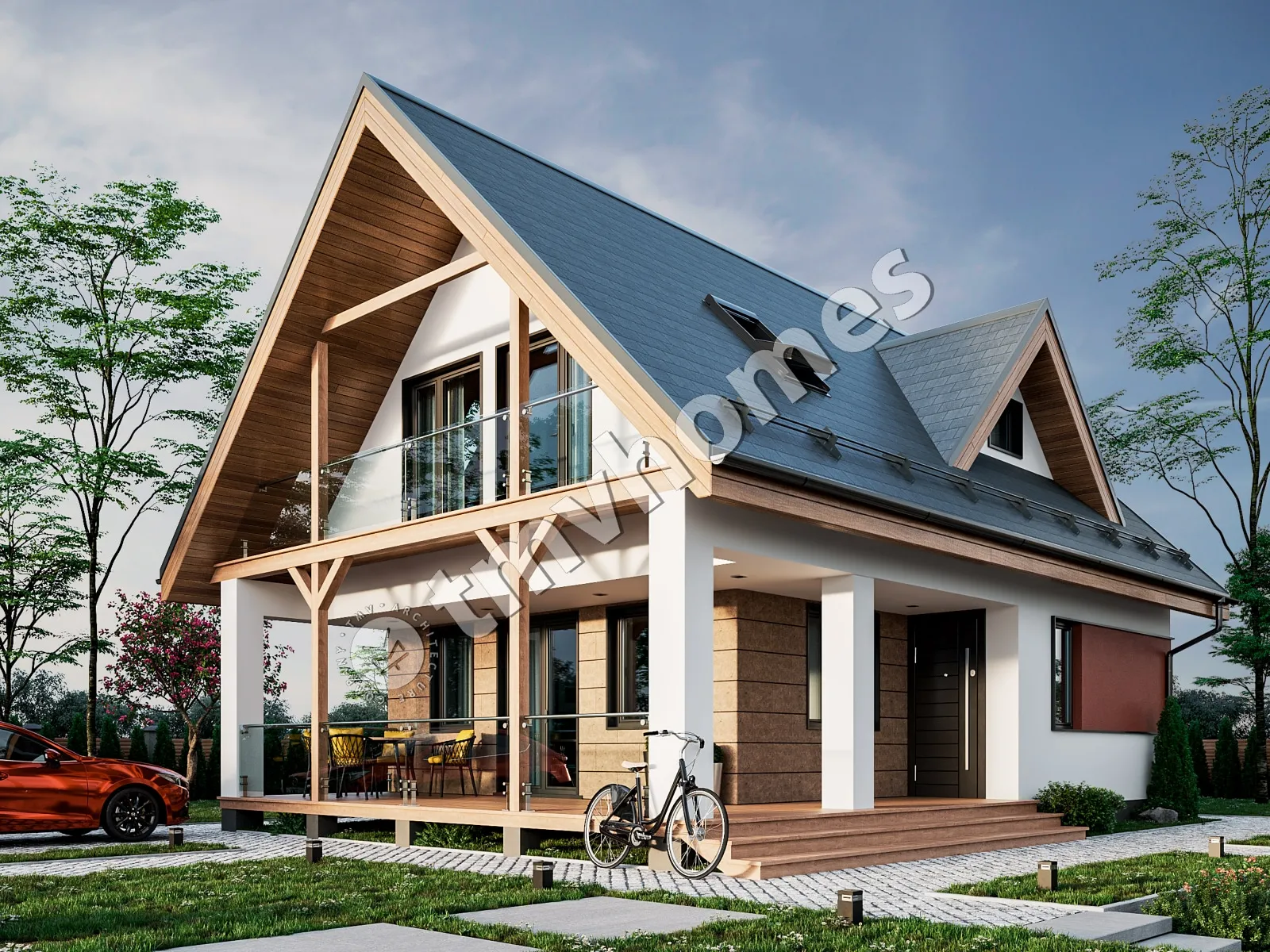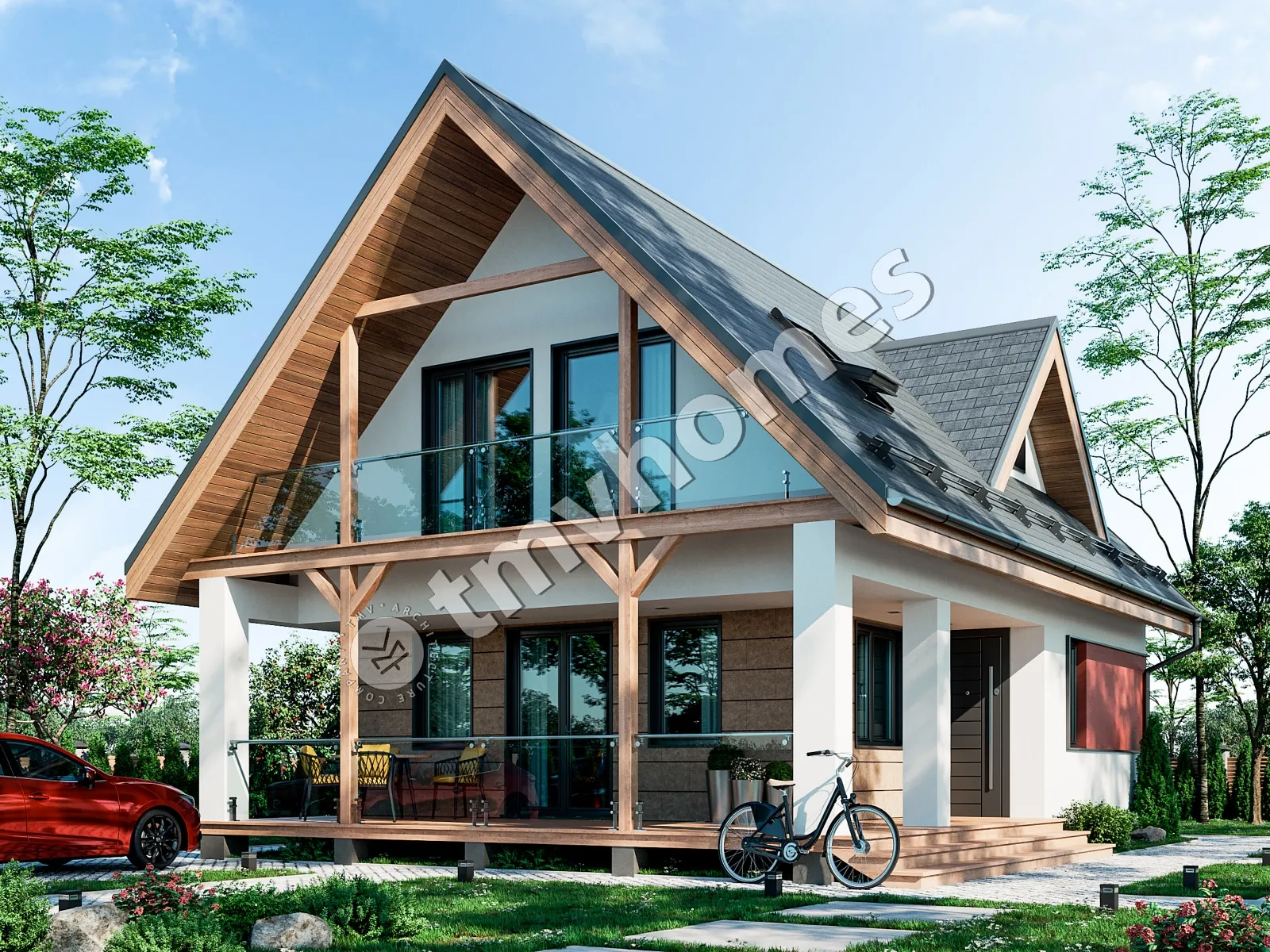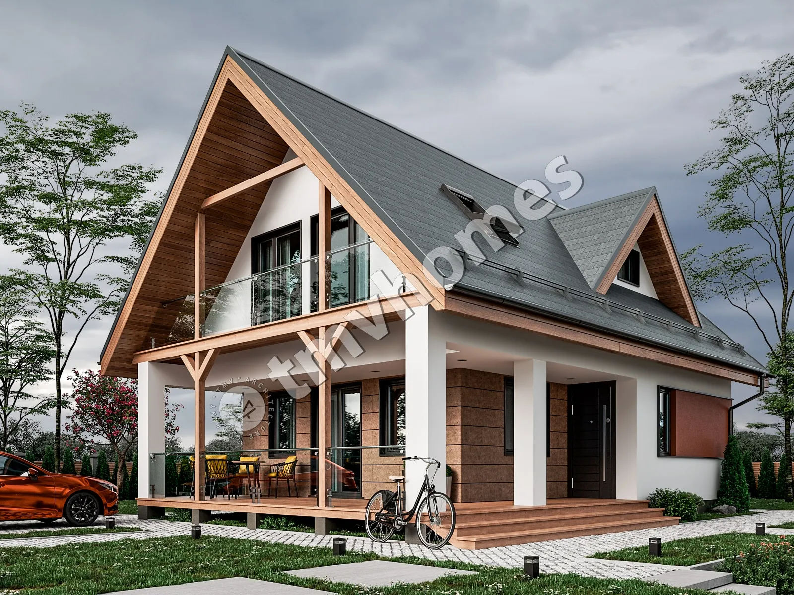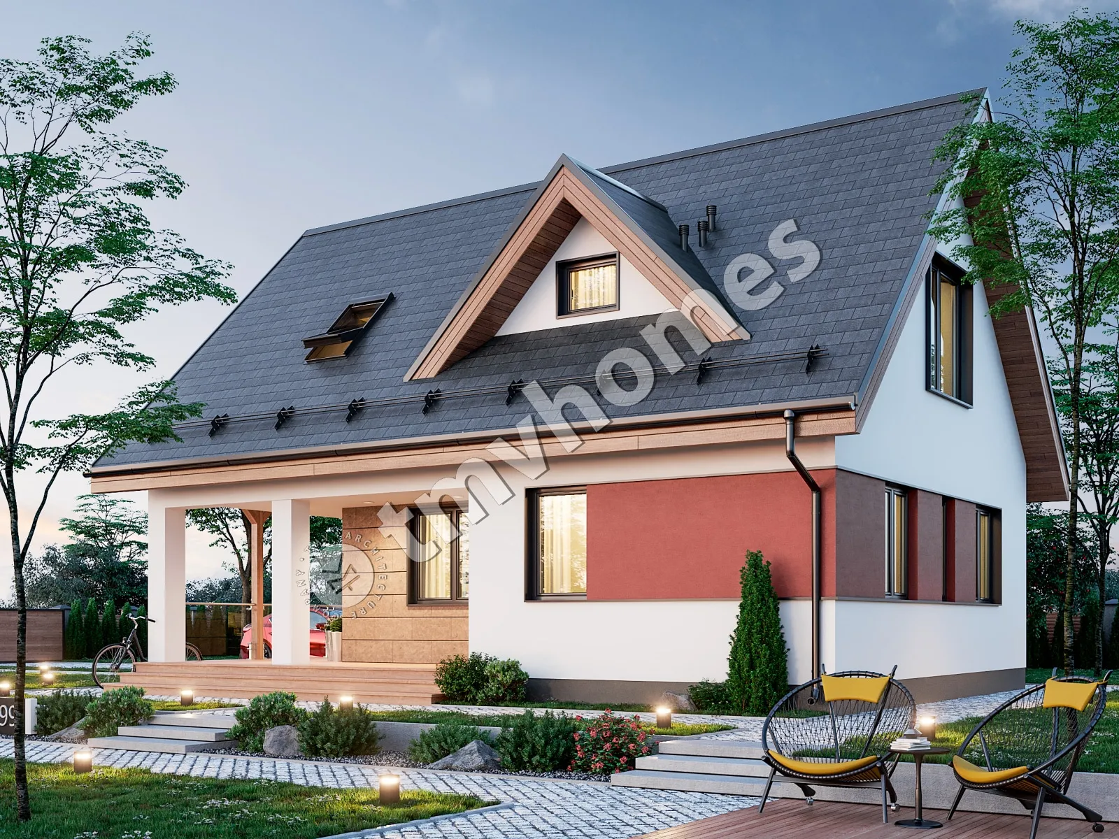 Проект TMV 99 - дачный двухэтажный дом с мансардой и террасой. Состав помещений: прихожая, гостиная, кухня, 3 спальни, 2 санузла.